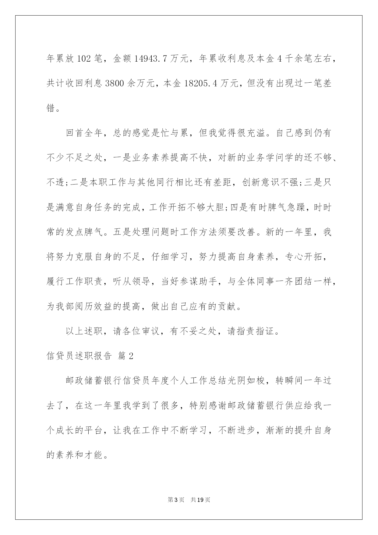 信贷员的述职报告信贷员的述职报告范文(精选3篇)时光在流逝,从不停歇;万物在更新,而我们在成长,回顾过去这段时间的工作,收获颇丰,好好准备一份述职报告吧。那么应当如何写述职报告呢?以下是小编为大家整理的信贷员的述职报告范文(精选3篇),欢迎大家分享。信贷员的述职报告1尊敬的领导,各位同事:大家好!匆匆忙忙中,一年的时间很快过去了。这一年里,我在领导的带领和同事的帮助下,认真履行职责,踏踏实实的做好本职工作。我热爱自己的本职工作,能够正确认真的去对待每一项任务,把金融政策及精神灵活的运用在工作中,工作中能够