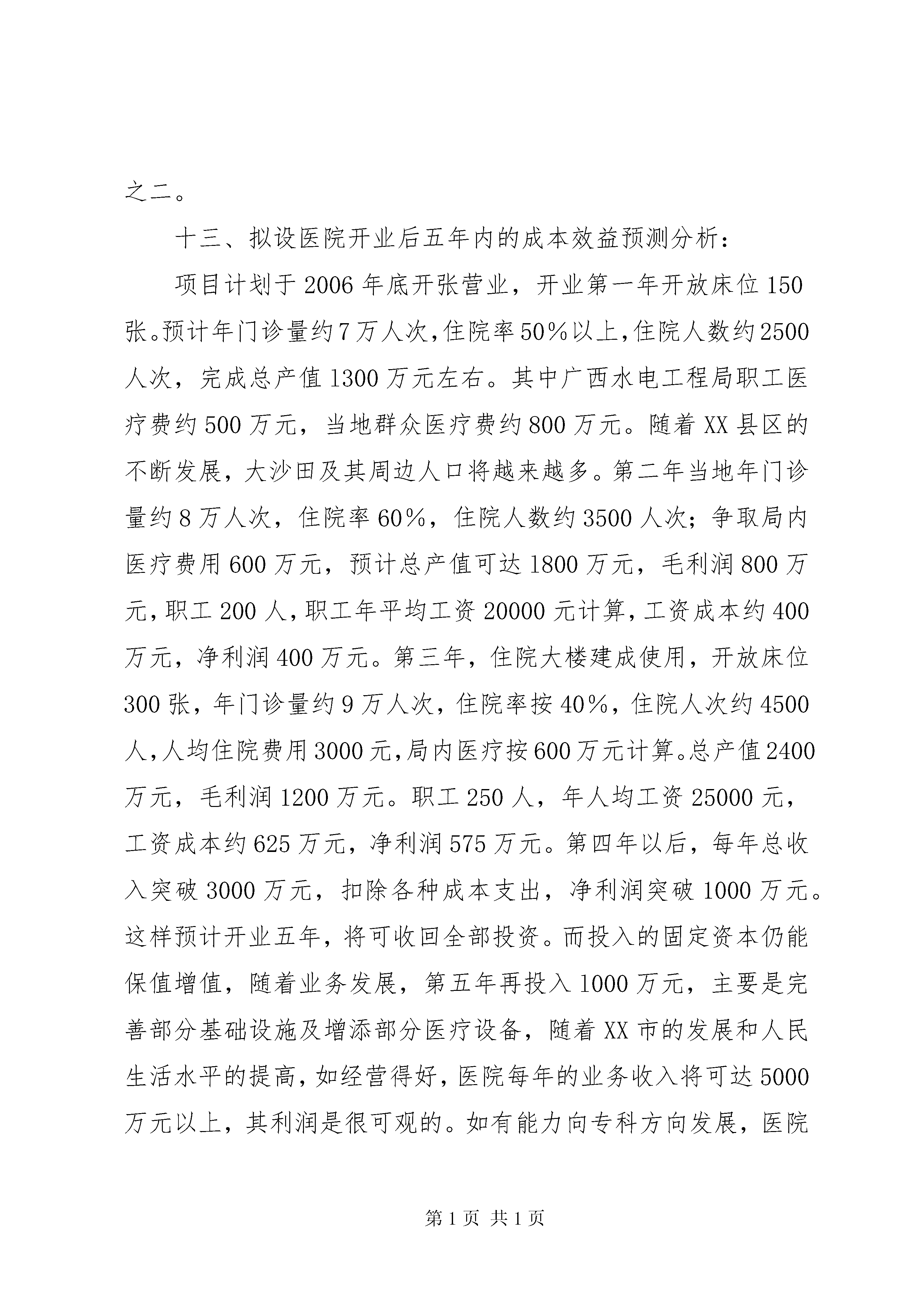 第PAGE\*Arabic\*MERGEFORMAT7页共NUMPAGES\*MERGEFORMAT7页县中医院设置可行性研究报告设置可行性研究报告一、申请单位名称:元江县羊街卫生院法人代表:杨静专业:身份证号码:医院现址:元江县羊街乡羊街村元江县羊街乡卫生院是属于XX省一所乡级公立医院,始建于年。(一)申请单位基本情况。元江县羊街卫生院是一所乡级公立医院。床位定编9张。现有职工13人,卫技人员l1人,医院科室设置基本齐全,设于元江县羊街乡乡政府所在地羊街中心村。元江县羊街卫生院诊疗科目分为全