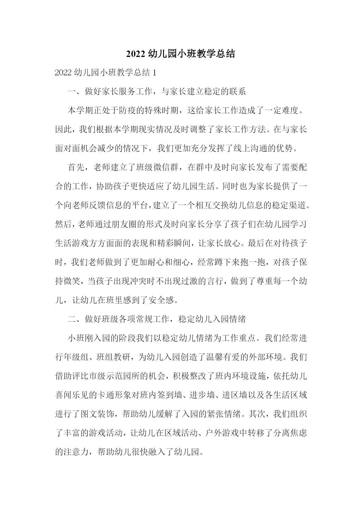 2022幼儿园小班教学总结2022幼儿园小班教学总结1一、做好家长服务工作,与家长建立稳定的联系本学期正处于防疫的特殊时期,这给家长工作造成了一定难度。因此,我们根据本学期现实情况及时调整了家长工作方法。在与家长面对面机会减少的情况下,我们更加充分发挥了线上沟通的优势。首先,老师建立了班级微信群,在群中及时向家长发布了需要配合的工作,协助孩子更快适应了幼儿园生活。同时也为家长提供了一个向老师反馈信息的平台,建立了一个相互交换幼儿信息的稳定渠道。然后,老师通过朋友圈的形式及时向家长分享了孩子们在幼儿园学习生