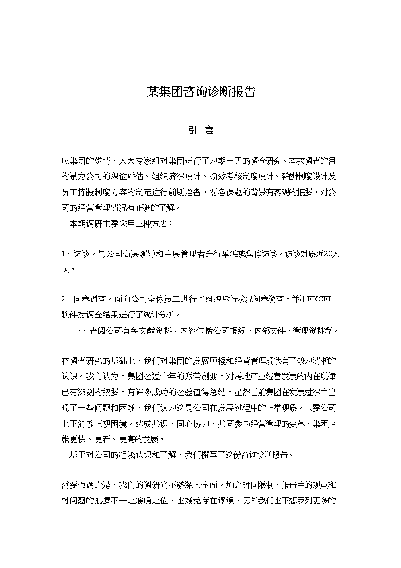 某集团咨询诊断报告引言应集团的邀请人大专家组对集团进行了为期十天的调查研究。本次调查的目的是为公司的职位评估、组织流程设计、绩效考核制度设计、薪酬制度设计及员工持股制度方案的制定进行前期准备对各课题的背景有客观的把握对公司的经营管理情况有正确的了解。本期调研主要采用三种方法:1.访谈。与公司高层领导和中层管理者进行单独或集体访谈访谈对象近20人次。2.问卷调查。面向公司全体员工进行了组织运行状况问卷调查并用EXCEL软件对调查结果进行了统计分析。3.查阅公司有关文献资