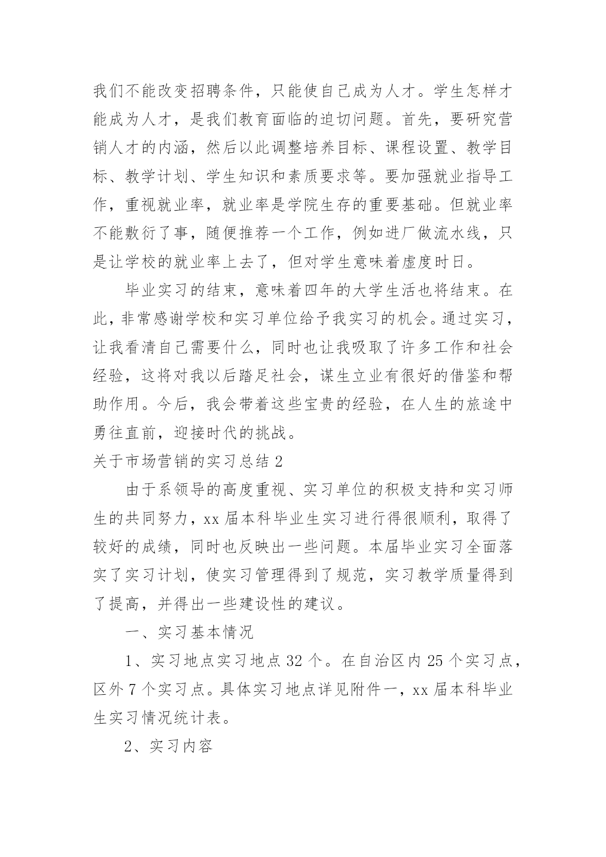 市场营销的实习总结关于市场营销的实习总结总结是事后对某一阶段的学习或工作情况作加以回顾检查并分析评价的书面材料,写总结有利于我们学习和工作能力的提高,不如静下心来好好写写总结吧。那么总结有什么格式呢?下面是小编帮大家整理的关于市场营销的实习总结,仅供参考,希望能够帮助到大家。关于市场营销的实习总结1由于系领导的高度重视、实习单位的积极支持和实习师生的共同努力,xx届本科毕业生实习进行得很顺利,取得了较好的成绩,同时也反映出一些问题。本届毕业实习全面落实了实习计划,使实习管理得到了规范,实习教学质量得到了提
