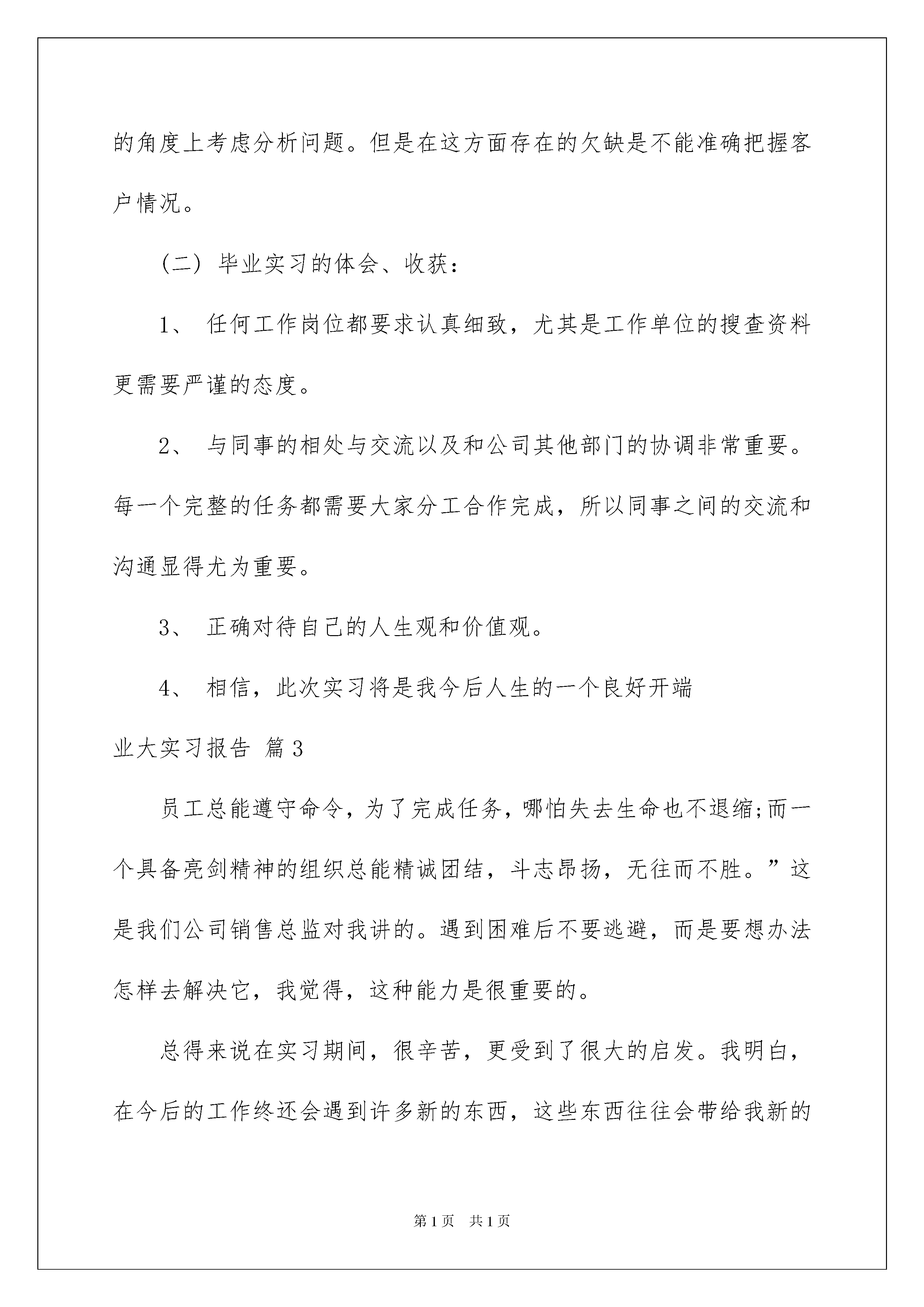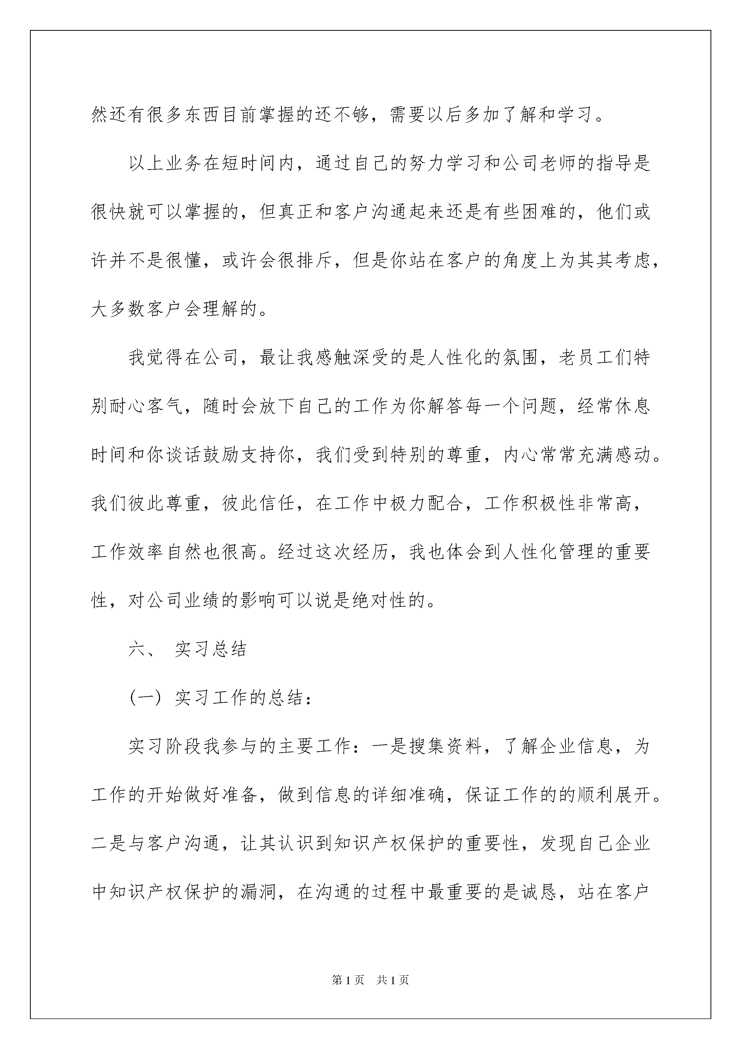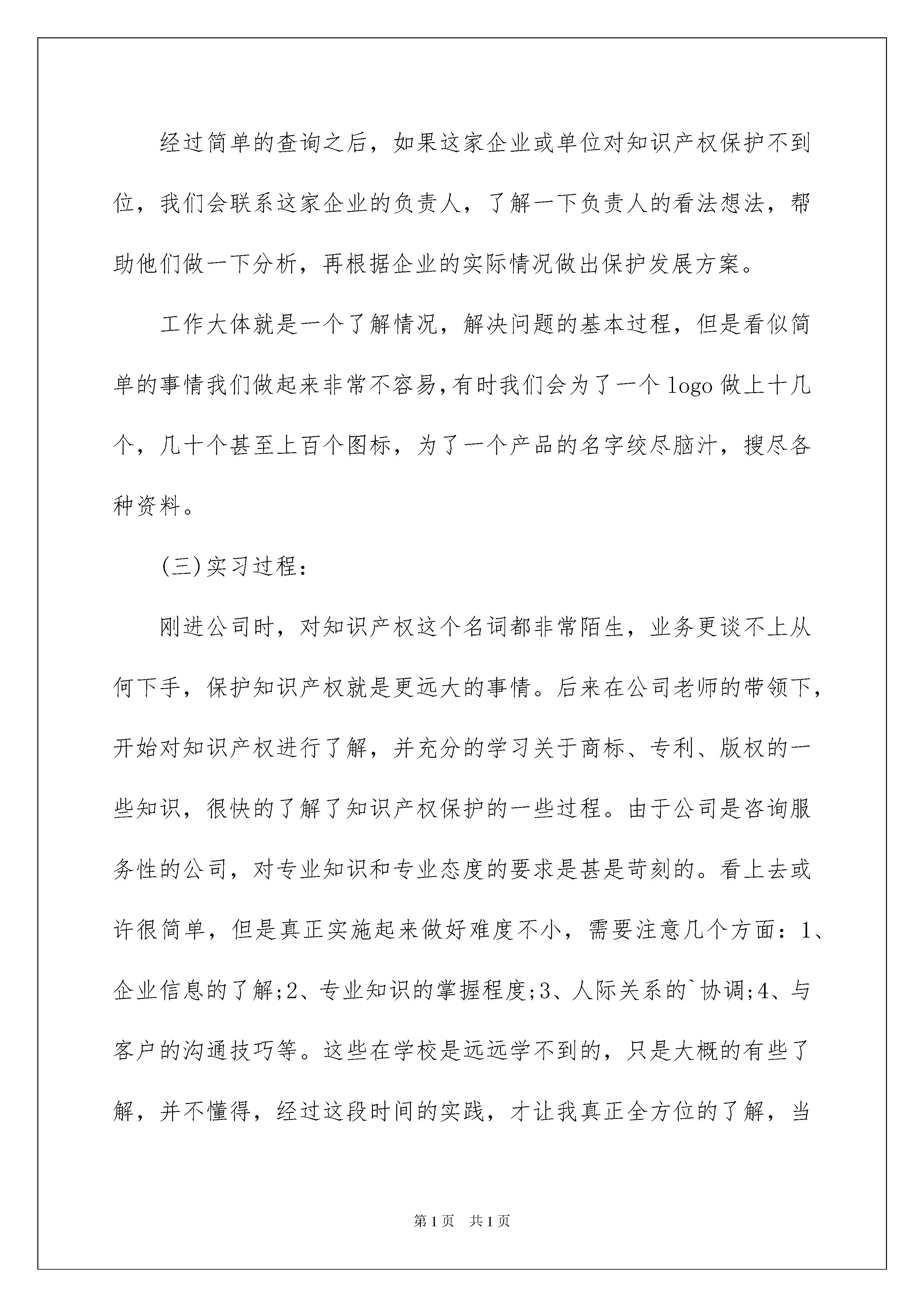2022关于业大实习报告模板汇编6篇关于业大实习报告模板汇编6篇在学习、工作生活中,报告的使用频率呈上升趋势,报告成为了一种新兴产业。相信很多朋友都对写报告感到非常苦恼吧,下面是我为大家收集的业大实习报告6篇,欢迎阅读,希望大家能够喜欢。业大实习报告篇1一、概述为了通过实习了解企业营销情况,并在这个基础上把所学的专业理论知识与实践紧密结合起来,以达到学以致用,培养实际工作能力与分析能力,接触认识社会,提高社会交往能力,并且更好地了解营销工作在企业中的作用与地位,我在烟台长久丰田进行了为期两周的实习。起初我在销售部做销售顾问,了解汽车销售的整个流程,以及在销售过程中,销售顾问应该了解知道并注意的知识与问题,一周后人事调动,为了工作需要,我进入了人事部帮助整理有关的销售资料,在理论上更加进一步了解了销售工作,并结合了企业特有的销售理念,把理论与实践更加完全的融合,同时,也了解到了销售并不仅仅是沟通、说服,其后还有更重要的理论学习阶段与信息资料管理阶段。二、烟台长久丰田汽车销售服务有限公司介绍(一)企业组织结构大学生实习活动是一个从大学生活到社会工作的一个过渡阶段。学校和社会的差别很大,有些同学在学校时,对自己以后工作的事情考虑得少,准备得少,一旦步入社会,自己心理上就一片空白。在踏入社会时,对于自己到底要干什么工作,自己有什么技能,是什么料,都不是很有把握。因此,实习就显得尤为重要。实习和正常上班没有什么两样。如果实习时就没有方向,那么,以后工作了,想找到方向就可能会走弯路。还有,对于许多同学来说,先就业再择业是最好的。毕竟自己在学校里接触社会少,专业实际操作和运用能力与实际工作要求还是有一定的差距。不要一开始就想着自己要找到一份好工作,自己专业内的工作,自己喜欢的工作,这样是不够切合实际的。所以在找实习工作的时候,不要眼高手低,要有在实习中吃苦耐劳的认识。在实习过程中,不懂得我方面要及时请教,充分利用时间学习,这样才会有所收获。业大实习报告篇2毕业临近,实习是我们每一位大学生难能可贵拥有的一段经历,它是我们参与工作之前最好的练兵,能够使我们从大学生到从业者实现完美过度。通过实习,让我们把课堂学到的知识有效地运用到实践中去,当然也让我学到了很多在课堂上学不到的知识使我获益匪浅,开阔视野;通过实习,我也近距离的接触到自己心仪的公司,对公司有了更客观的了解,更加理性的对自己的职业生涯做出规划判断;通过实习,我也学会了调整自己的心态,积极乐观、坚持不懈力求达到最佳工作效果。我相信,只要我们怀揣着一颗有梦想的心,勤恳踏实的工作,就会被这个社会所接纳,只要我们立足于现实,积极努力的调整自己,在成长的道路上不断攀登,有朝一日,成才的机遇就会纷至沓来,促使我们成为有用之才,进而实现我们自己的人生观、世界观、价值观。一、实习目的了解企业管理的先进方式和现代化管理方法,提高自己理论与实际相结合的能力,提高自己协同合作及组织工作的能力,提高自己沟通与表达的能力,培养独立分析问题和解决问题的能力。二、实习时间20xx年6月7日至20xx年8月21日三、实习地点济南市历下区解放路30号国华经典四、实习单位和部门**知识产权济南分公司商务一部五、实习内容。(一)、公司**知识产权公司是中国最具实力的知识产权注册机构之一,目前已发展有西安分公司、兰州分公司、济南分公司、成都分公司、长沙分公司、合肥分公司、北京分公司、唐古知识产权公司等机构,为超过15万家企业提供着优质的服务。主要业务是:专利申请、商标注册、版权登记、ISO9000认证、QS认证、网络商标注册等。公司现有律师5人,商标代理人80多人,专利代理人15人,专利代理人助理30人,员工总人数200多人。多次获得市“重信用,守合同”企业、国家商标局优秀代理机构等称号,与国家商标局、知识产权局、各地市知识产权局等政府部门保持着良好的合作关系。公司的宗旨是:“客户第一,诚信服务”。公司经营理念是“诚信、高效、创新、超越”。**的优势1——速度**的优势2——专业远景目标:做中国企业知识产权服务首选品牌!核心文化:速度文化、执行力文化、结果文化。(二)实习内容:在公司实习期间,我主要从事业务工作,负责专利申请、商标注册、版权登记、ISO9000认证、QS认证、网络商标注册等。国外来说,公民的知识产权保护意识是非常薄弱的,因此在我们国家盗版侵权的现象在各行各业频频发生。近年来政府通过各种法律,政策来加大对知识产权保护的力度,我们也就需要主动去帮助那些没有知识产权保护意识的公司去建立保护系统。由于公司的员工多,所以部门每天下发的资料是有限的,这就需要我们自己