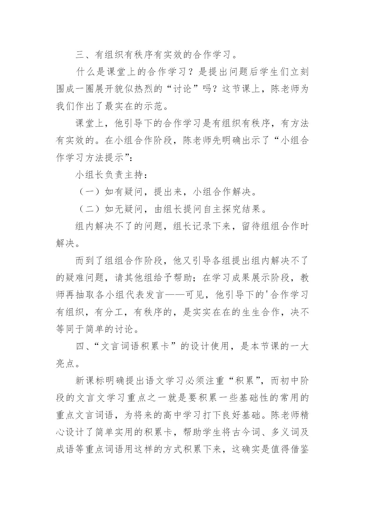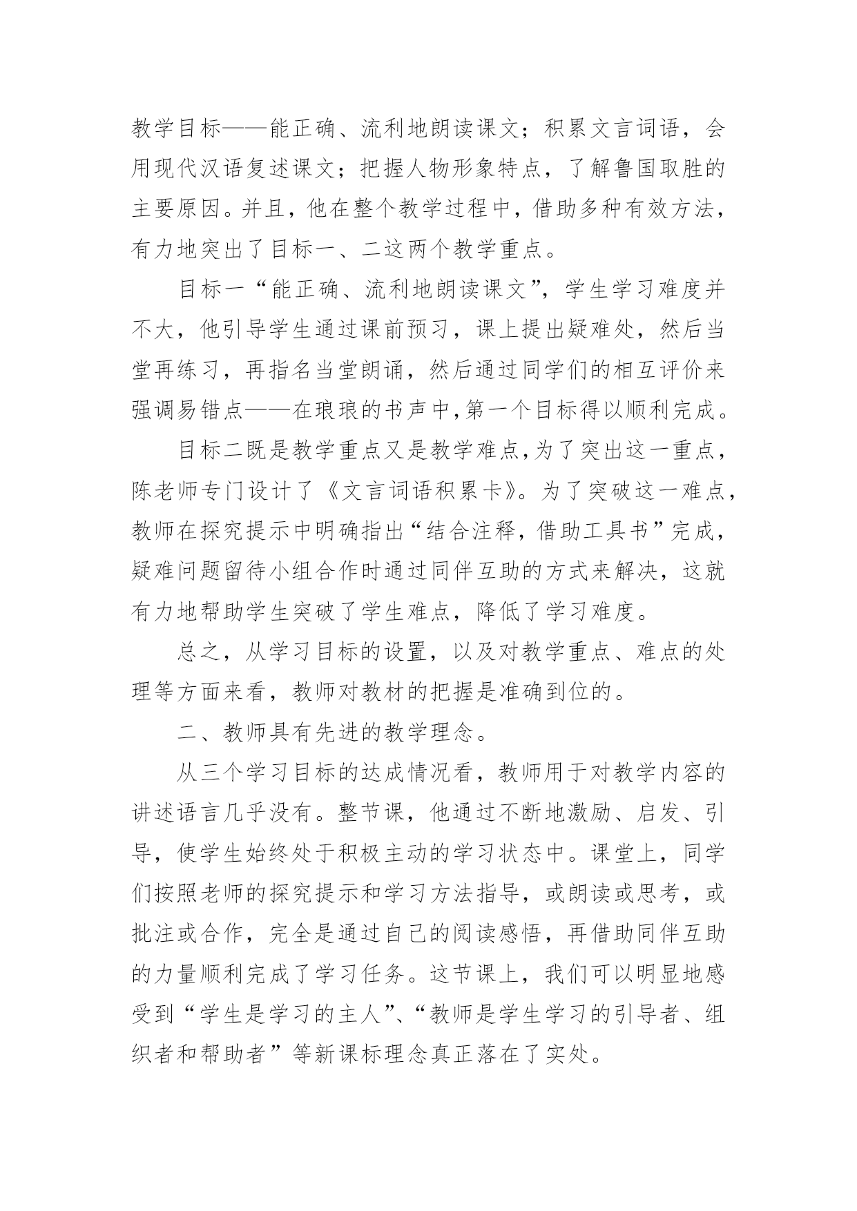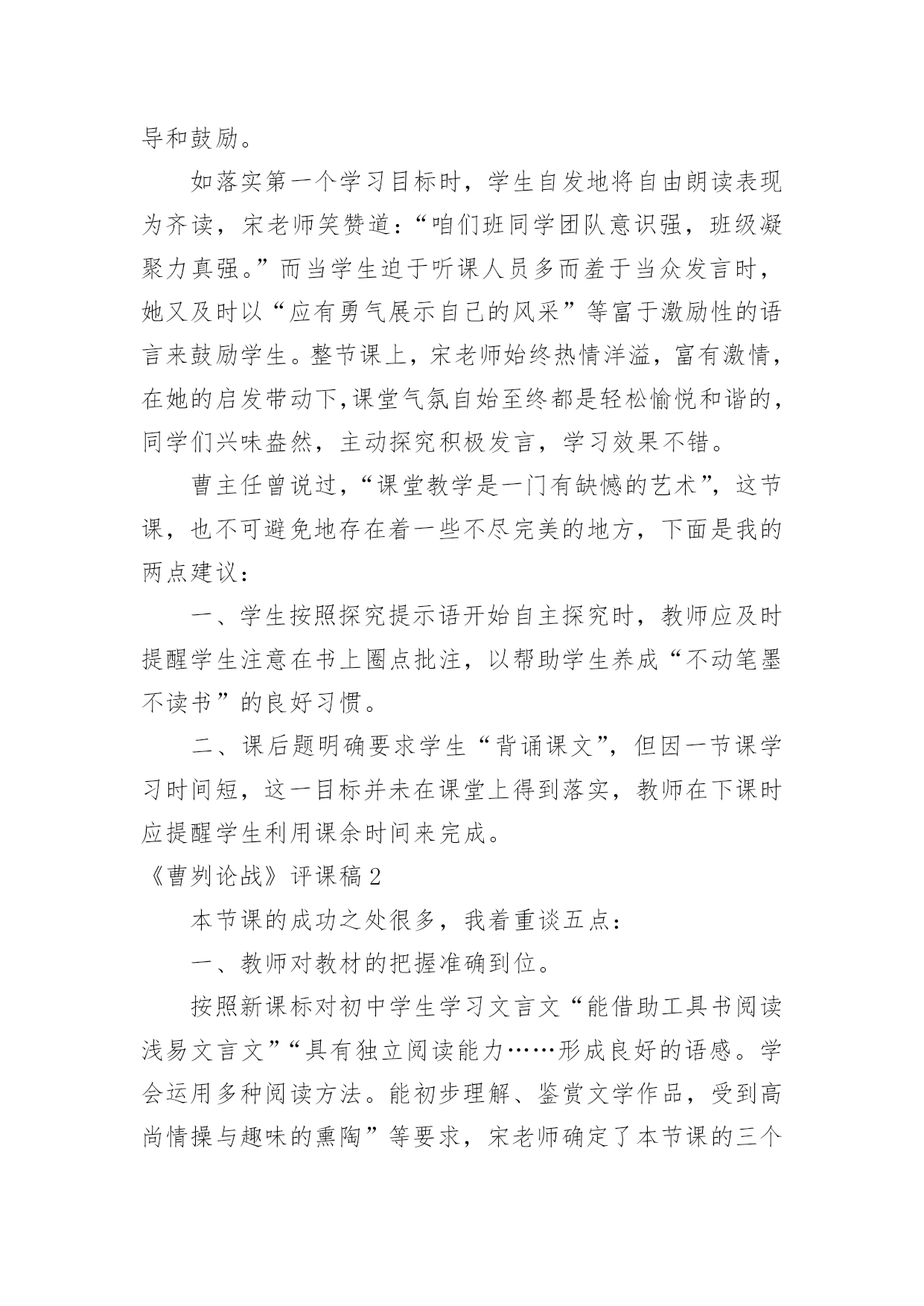 《曹刿论战》评课稿《曹刿论战》评课稿(精华)作为一无名无私奉献的教育工作者,时常需要编写评课稿,在当前新课程改革的背景下,客观、公正、科学地评价课堂教学,对探讨课堂教学规律、提高课堂教学效率、促进学生全面发展、促进教师专业成长有着十分重要的意义。那么你有了解过评课稿吗?下面是小编收集整理的《曹刿论战》评课稿,仅供参考,欢迎大家阅读。本节课的成功之处很多,我着重谈五点:一、教师对教材的把握准确到位。按照新课标对初中学生学习文言文“能借助工具书阅读浅易文言文”“具有独立阅读能力……形成良好的语感。学会运用多种