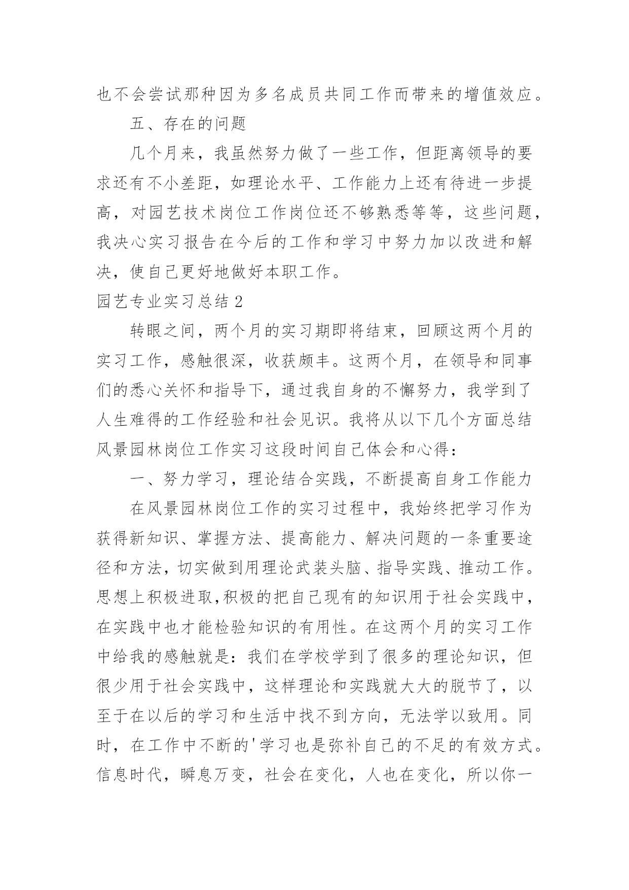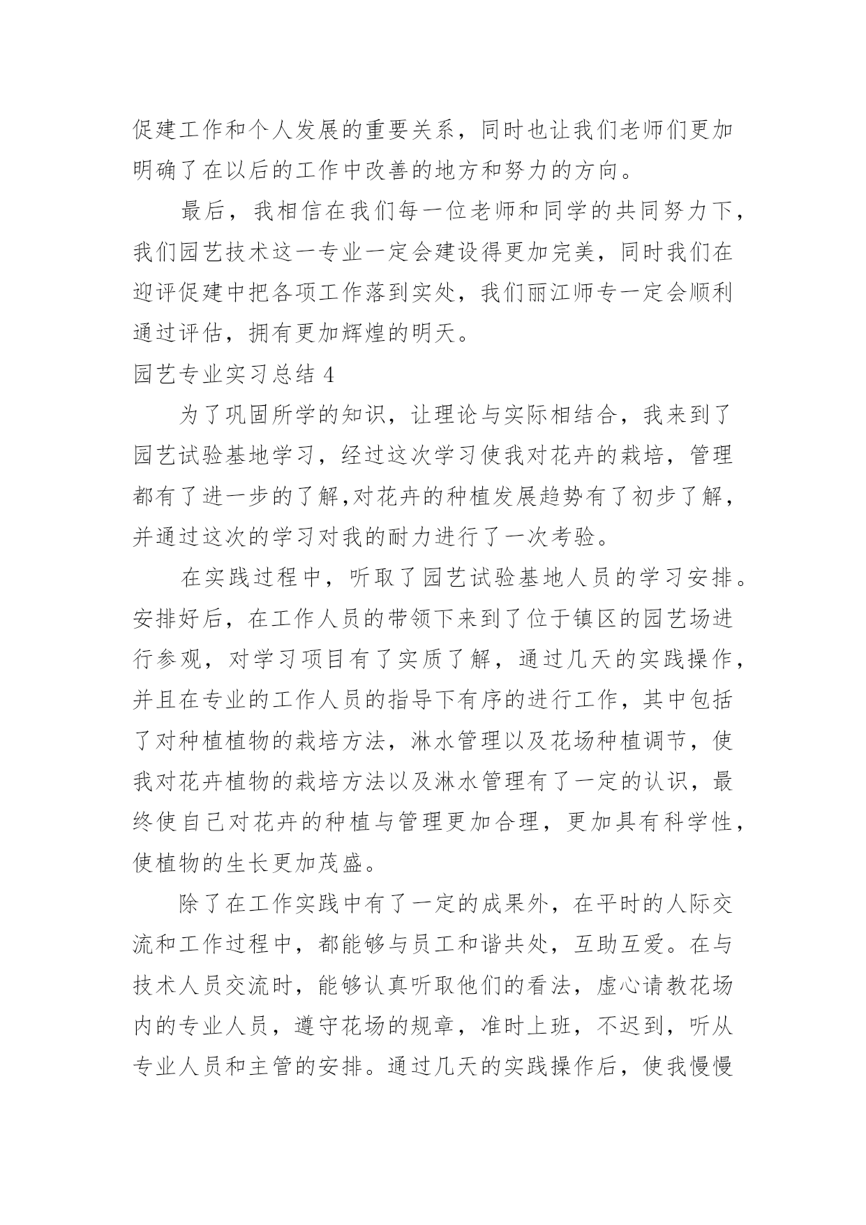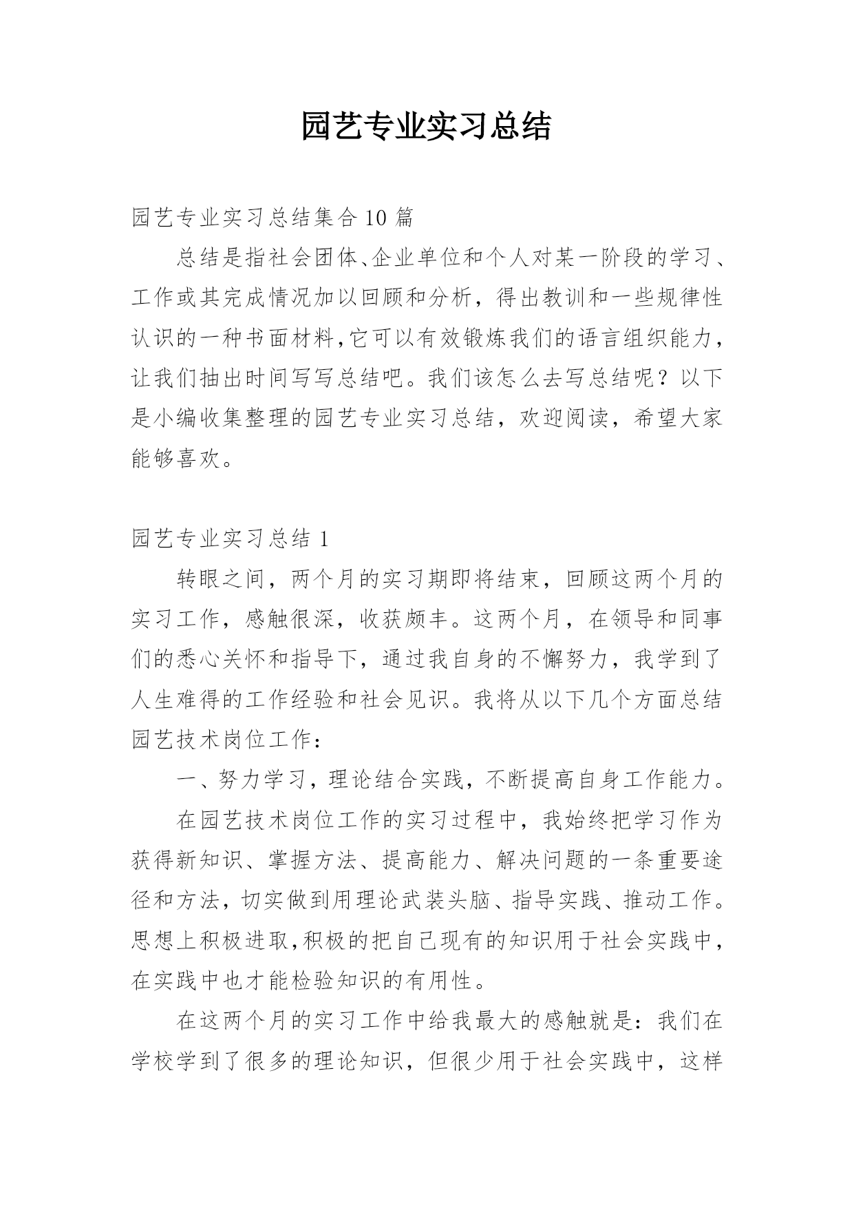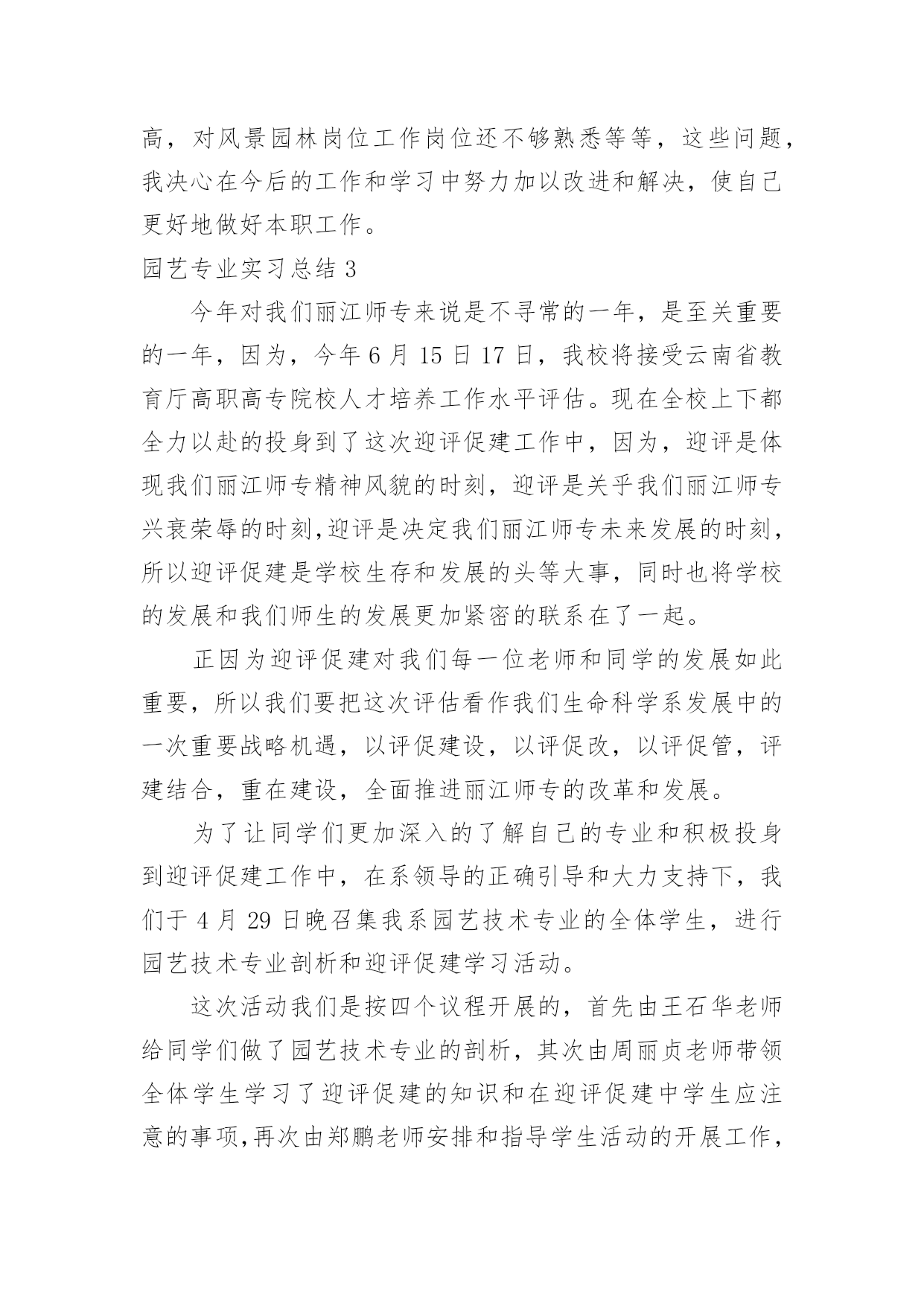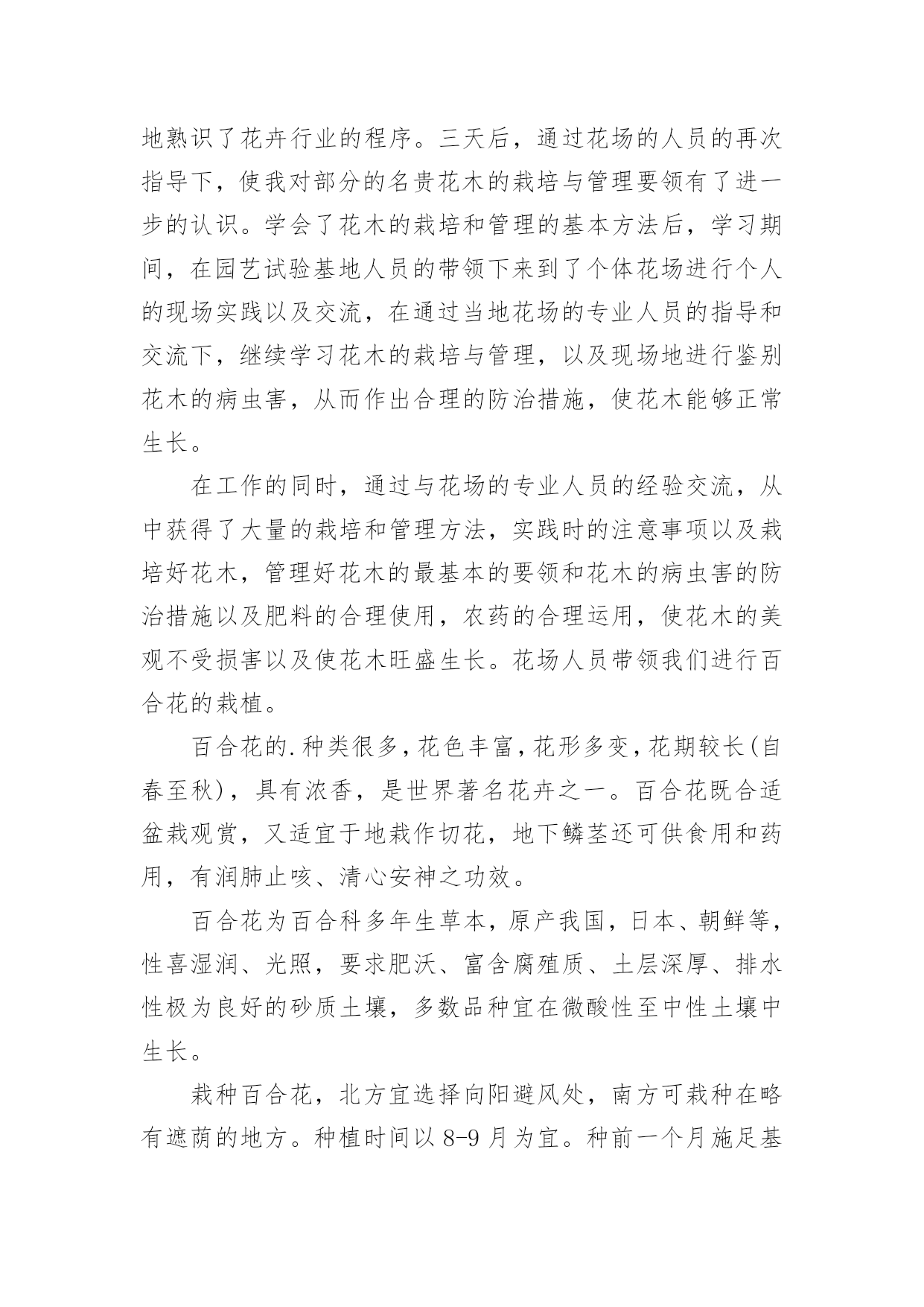 园艺专业实习总结园艺专业实习总结通用总结是事后对某一时期、某一项目或某些工作进行回顾和分析,从而做出带有规律性的结论,通过它可以正确认识以往学习和工作中的优缺点,不如静下心来好好写写总结吧。但是却发现不知道该写些什么,下面是小编收集整理的园艺专业实习总结通用,欢迎阅读与收藏。园艺专业实习总结通用1一、实习情况:实习地点:校园、南京市各个公园、广场绿地景观植物区。实习目的:通过对植物换盆,公园中大树移植栽植,及后期养护管理的学习,联系课堂上的理论知识,把树木栽培知识更好的学习与应用。指导老师:xx二、实习路