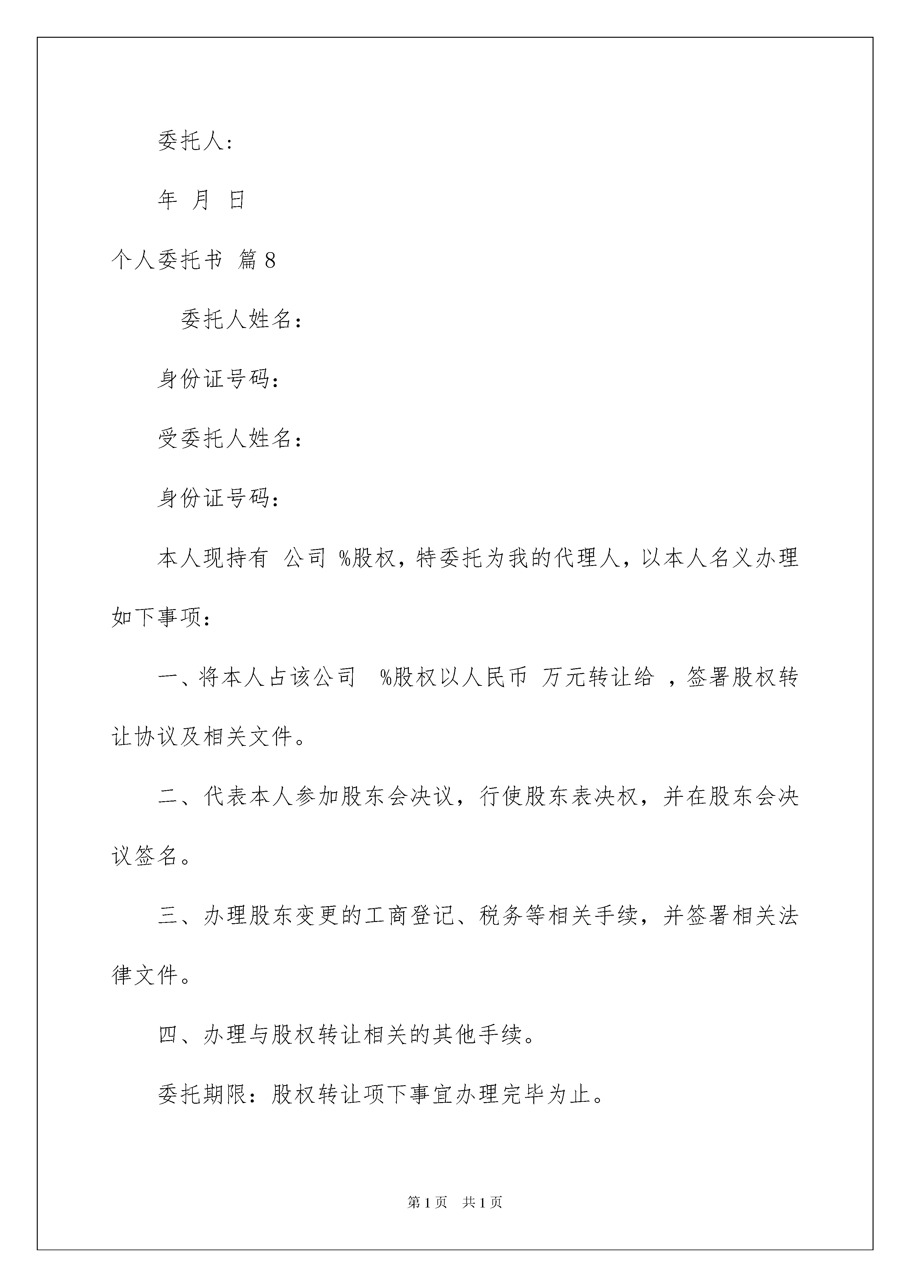 2022关于个人委托书模板集合十篇关于个人委托书模板集合十篇如果被委托人没有做出违背国家法律的任何权益,委托人无权终止委托协议。在快速变化和不断变革的新时代,委托书在我们处理事务上出现的频率越来越高,那么问题来了,到底应如何写一份恰当的委托书呢?以下是我精心整理的个人委托书10篇,欢迎阅读,希望大家能够喜欢。个人委托书篇1XX:本人作为_______