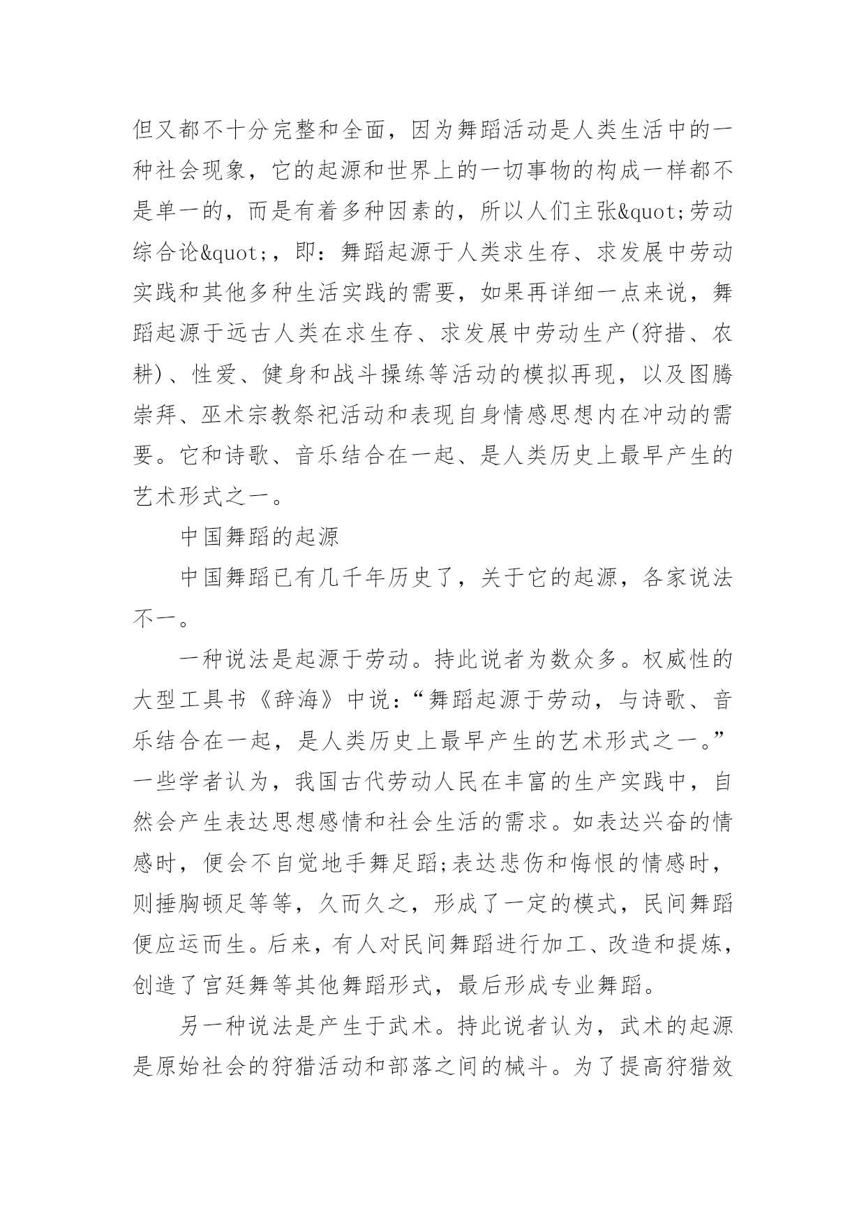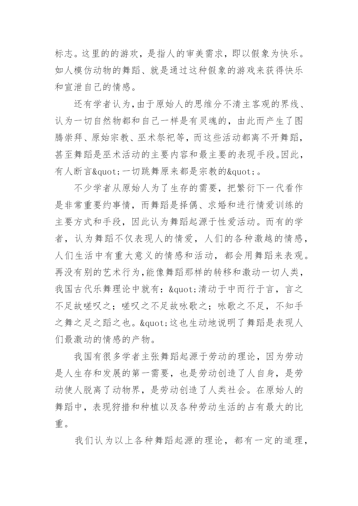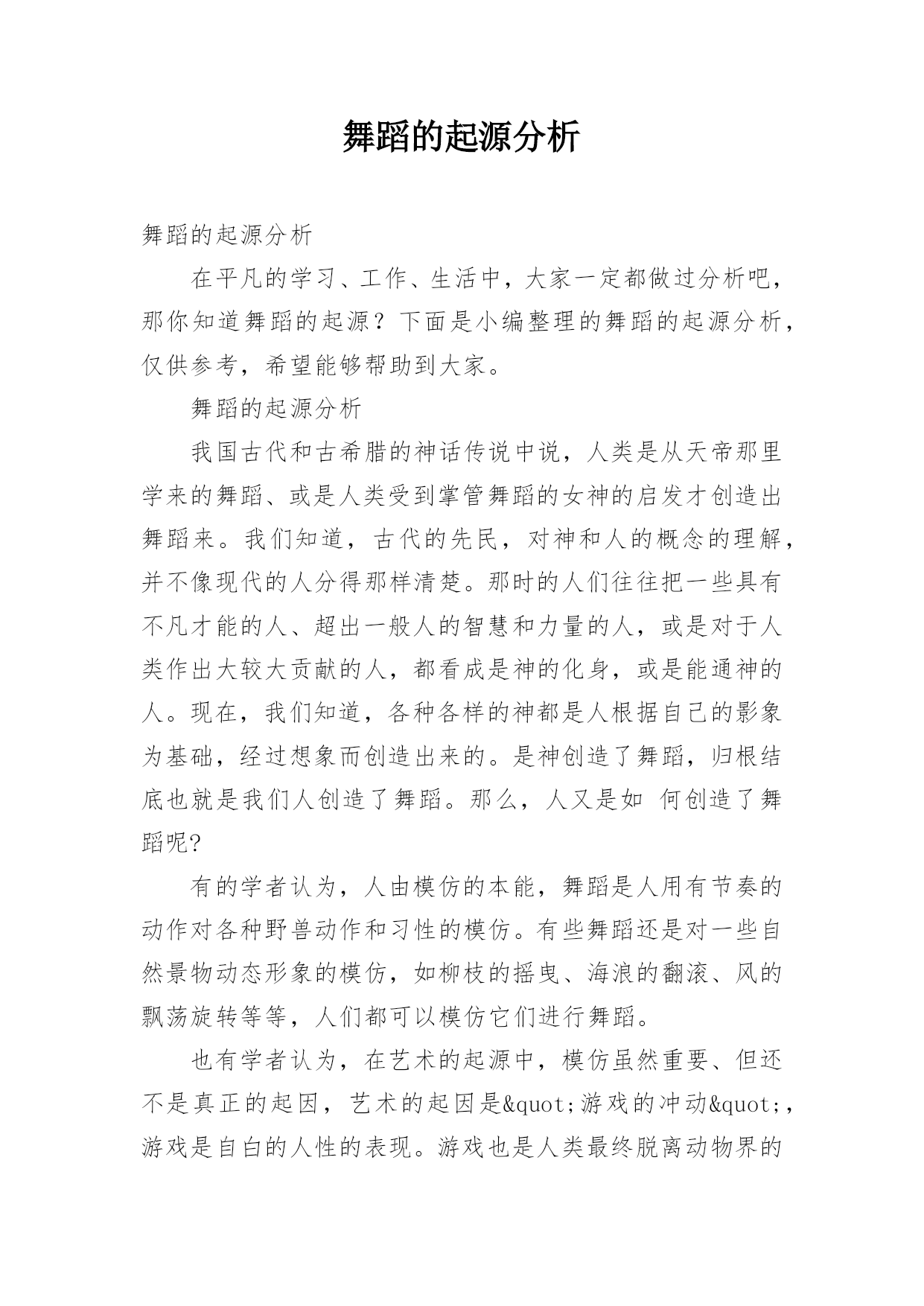 舞蹈的起源分析舞蹈的起源分析在平凡的学习、工作、生活中,大家一定都做过分析吧,那你知道舞蹈的起源?下面是小编整理的舞蹈的起源分析,仅供参考,希望能够帮助到大家。舞蹈的起源分析我国古代和古希腊的神话传说中说,人类是从天帝那里学来的舞蹈、或是人类受到掌管舞蹈的女神的启发才创造出舞蹈来。我们知道,古代的先民,对神和人的概念的理解,并不像现代的人分得那样清楚。那时的人们往往把一些具有不凡才能的人、超出一般人的智慧和力量的人,或是对于人类作出大较大贡献的人,都看成是神的化身,或是能通神的人。现在,我们知道,各种各样