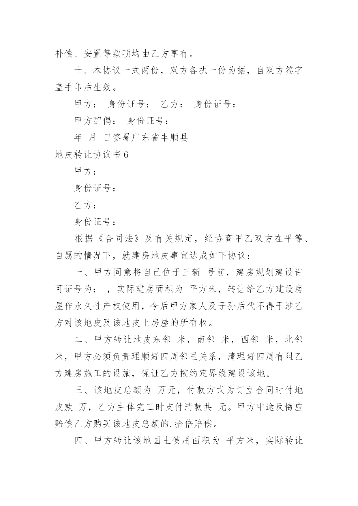 地皮转让协议书地皮转让协议书(15篇)在我们平凡的日常里,需要使用协议的场合越来越多,签订协议可以保障自身的权益不被侵害。协议到底怎么写才合适呢?以下是小编精心整理的地皮转让协议书,仅供参考,欢迎大家阅读。地皮转让协议书1转让方:________________________(简称甲方)身份证号码:________________________电话:________________承接方:________________________(简称乙方)身份证号码:_____________________