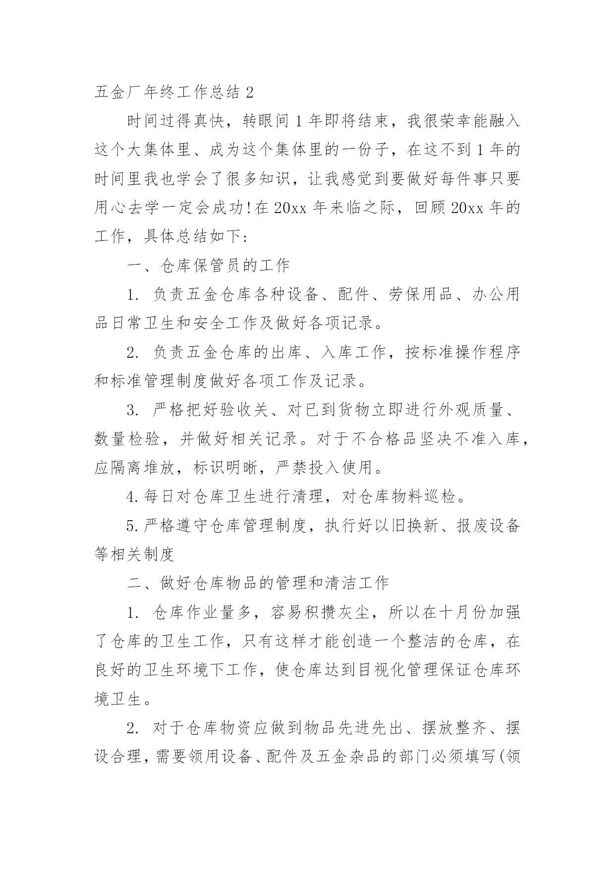 五金厂年终工作总结五金厂年终工作总结总结就是把一个时段的学习、工作或其完成情况进行一次全面系统的总结,通过它可以正确认识以往学习和工作中的优缺点,因此我们需要回头归纳,写一份总结了。我们该怎么写总结呢?下面是小编收集整理的五金厂年终工作总结,希望对大家有所帮助。五金厂年终工作总结120xx年,我厂时刻紧盯全年目标任力不放松,按照制定的各项任务,结合自身实际,广大干部职工积极配合,进一步明确目标,找准方向,强化管理,全年深入开展安全生产月活动、质量宣传月活动,顺利完成了全年的各项目标任务,为进一步发展奠定了