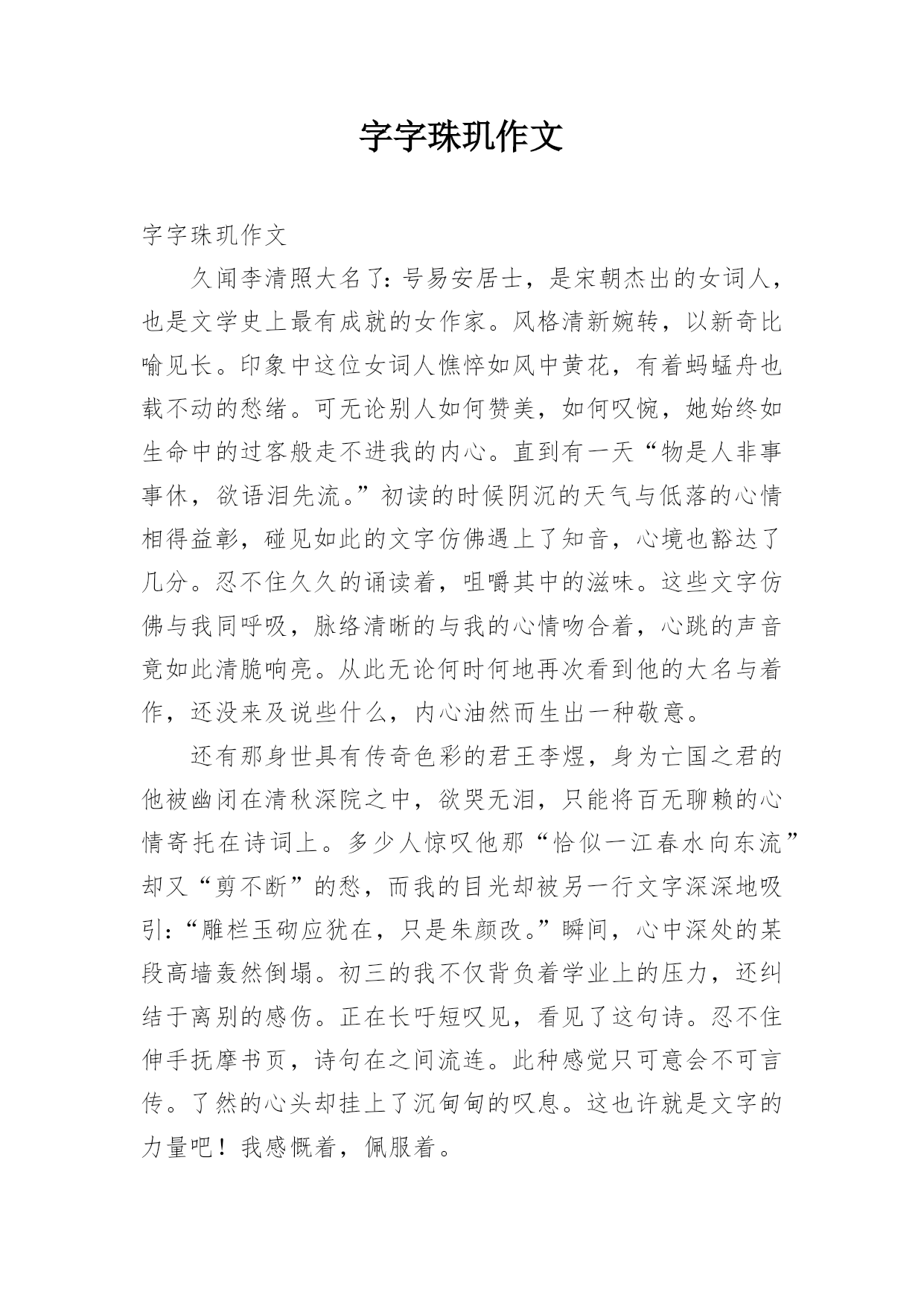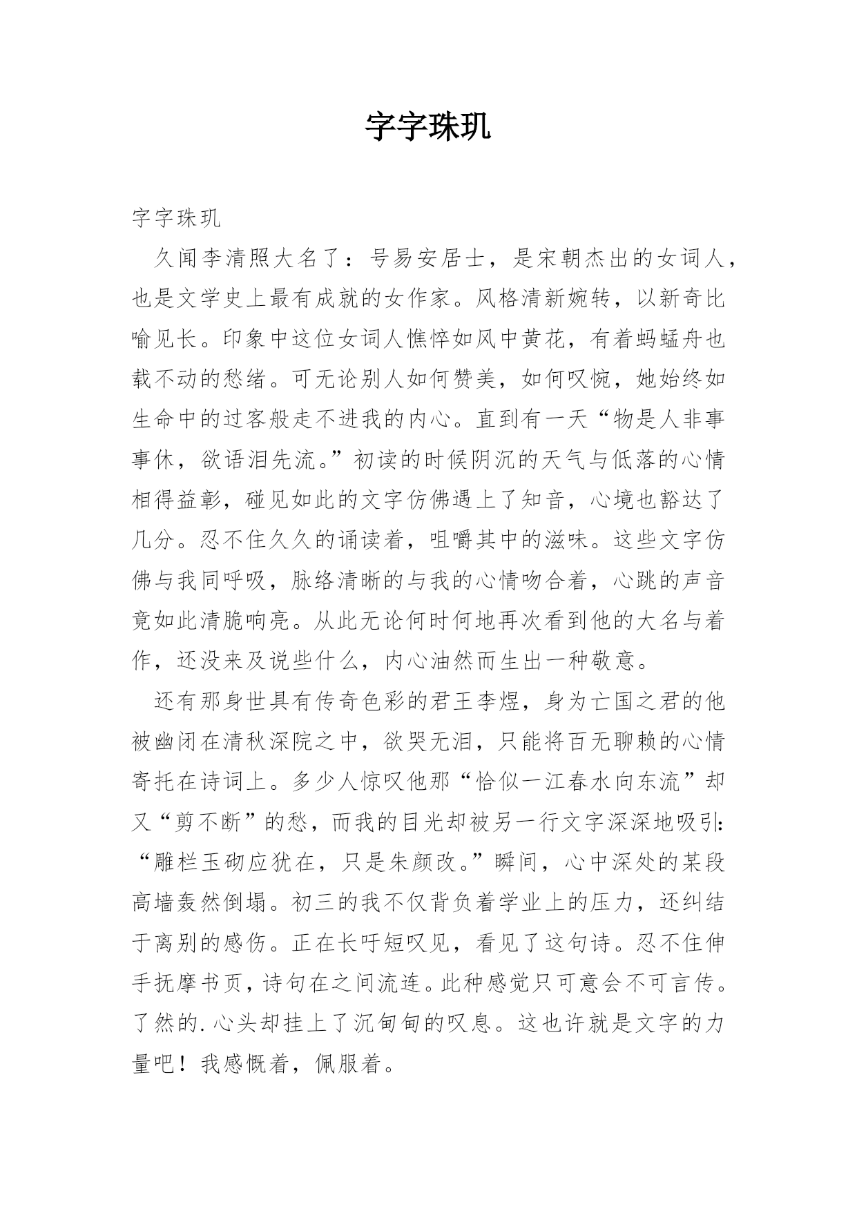 字字珠玑作文字字珠玑作文久闻李清照大名了:号易安居士,是宋朝杰出的女词人,也是文学史上最有成就的女作家。风格清新婉转,以新奇比喻见长。印象中这位女词人憔悴如风中黄花,有着蚂蜢舟也载不动的愁绪。可无论别人如何赞美,如何叹惋,她始终如生命中的过客般走不进我的内心。直到有一天“物是人非事事休,欲语泪先流。”初读的时候阴沉的天气与低落的心情相得益彰,碰见如此的文字仿佛遇上了知音,心境也豁达了几分。忍不住久久的诵读着,咀嚼其中的滋味。这些文字仿佛与我同呼吸,脉络清晰的与我的心情吻合着,心跳的声音竟如此清脆响亮。从此