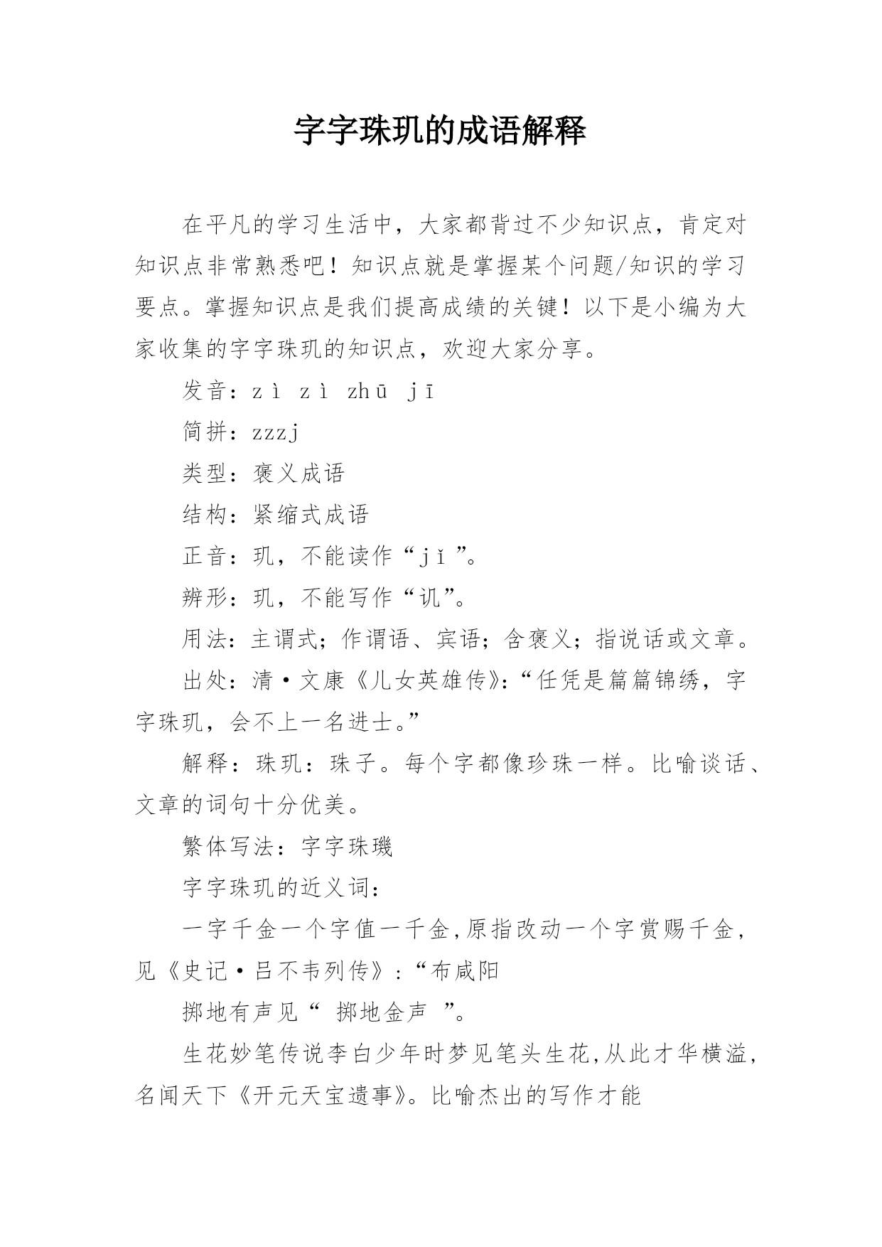 字字珠玑的成语解释字字珠玑的成语解释在平凡的学习生活中,大家都背过不少知识点,肯定对知识点非常熟悉吧!知识点就是掌握某个问题/知识的学习要点。掌握知识点是我们提高成绩的关键!以下是小编为大家收集的字字珠玑的知识点,欢迎大家分享。发音:zìzìzhūjī简拼:zzzj类型:褒义成语结构:紧缩式成语正音:玑,不能读作“jǐ”。辨形:玑,不能写作“讥”。用法:主谓式;作谓语、宾语;含褒义;指说话或文章。出处:清·文康《儿女英雄传》:“任凭是篇篇锦绣,字字珠玑,会不上一名进士。”解释:珠玑:珠子。每个字都像珍珠一