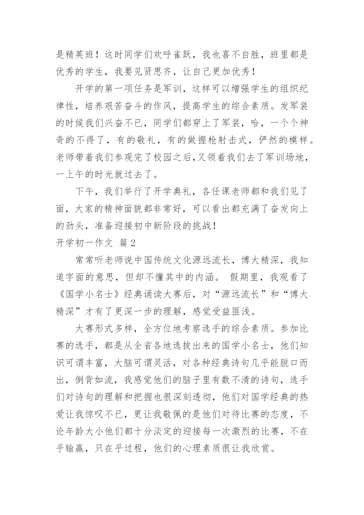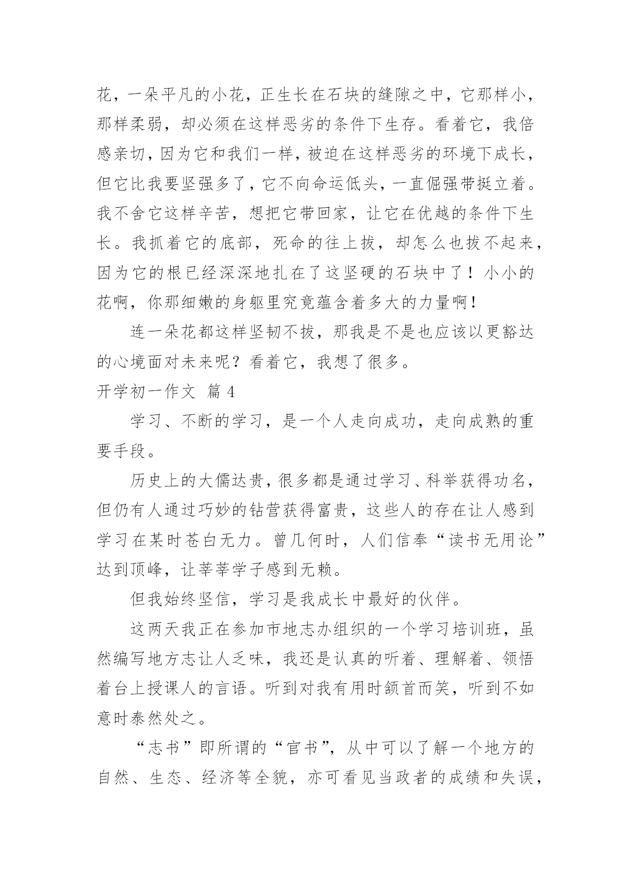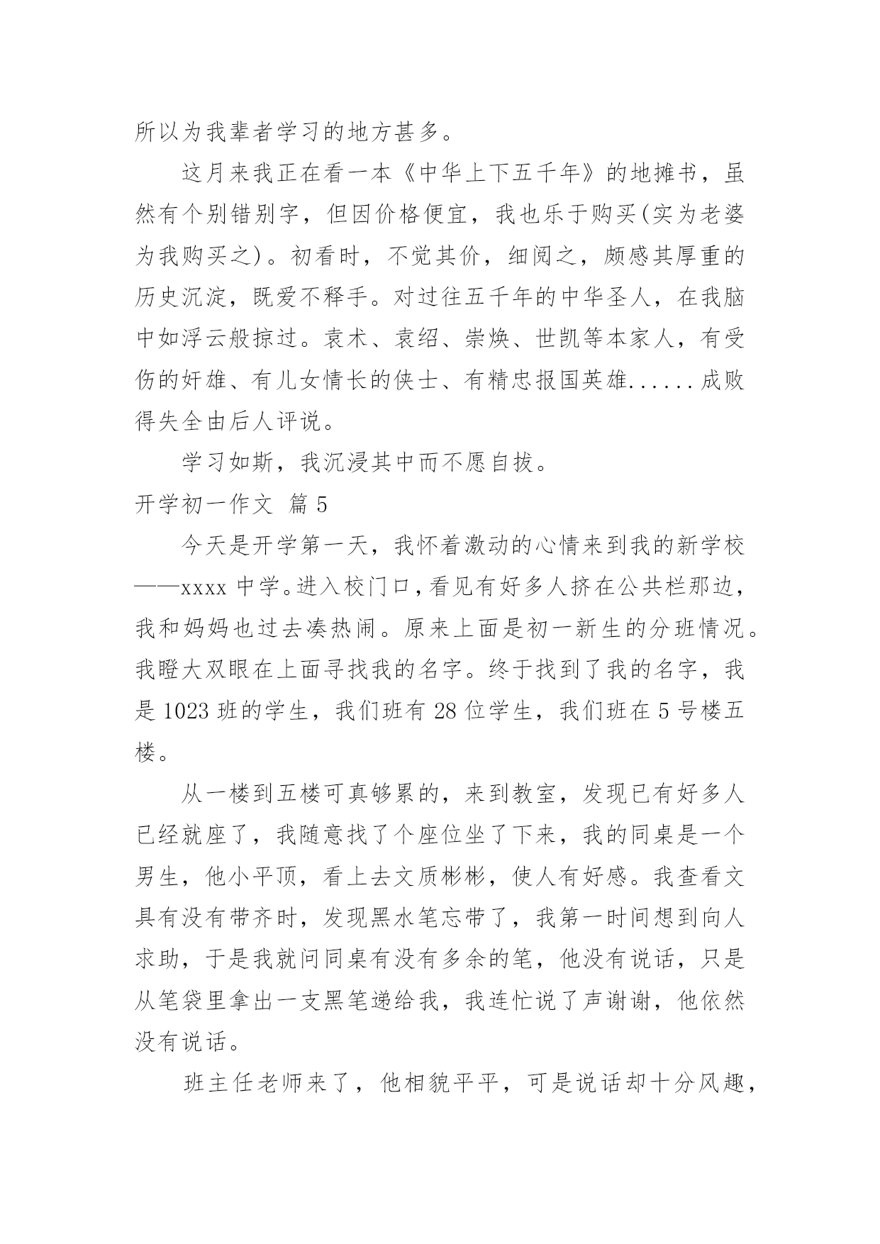 开学初一作文【必备】开学初一作文合集6篇无论是身处学校还是步入社会,大家都接触过作文吧,作文是人们把记忆中所存储的有关知识、经验和思想用书面形式表达出来的记叙方式。那要怎么写好作文呢?以下是小编为大家收集的开学初一作文6篇,欢迎大家借鉴与参考,希望对大家有所帮助。开学初一作文篇1令我感到兴奋又自豪。因为这天我光荣地从小学的门槛走出,进入了一个新的阶段——中学。当我穿着一身红白相间的校服进入学校时,心中不免有些激动,这是我第一次以中学生的`身份开始学习啊!从今以后我就是一名中学生了!初中的生活还真挺特别,当