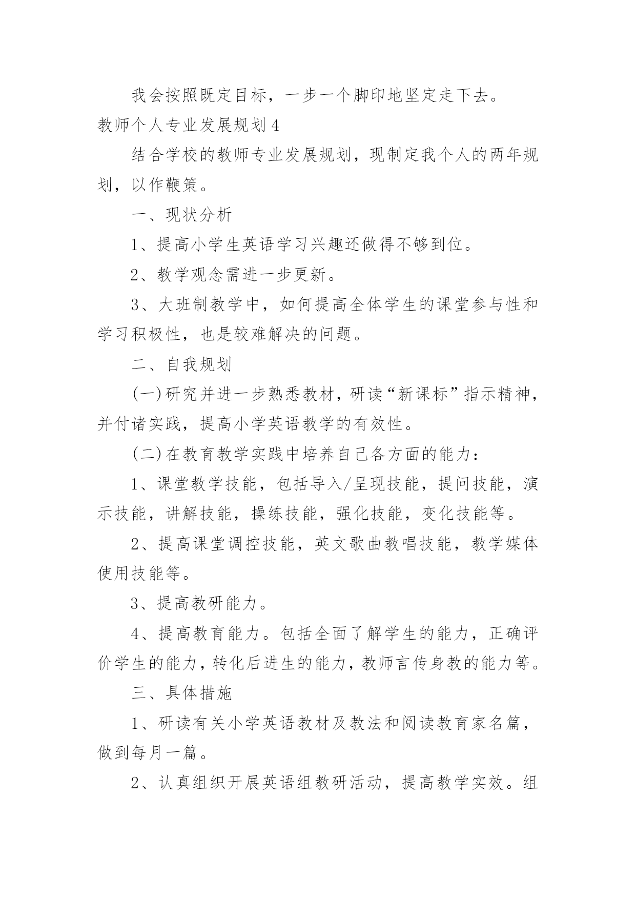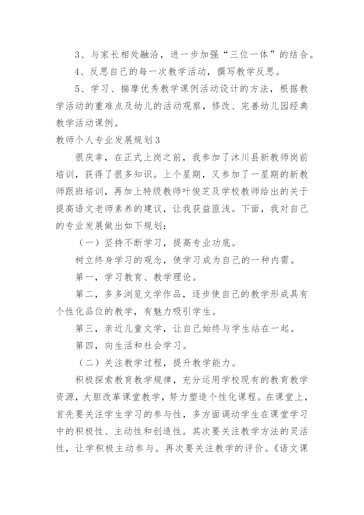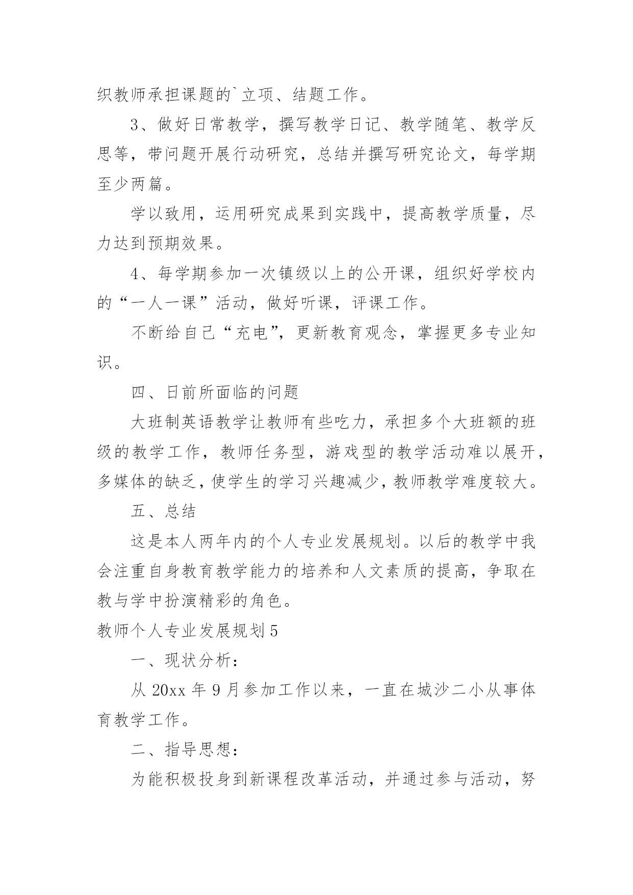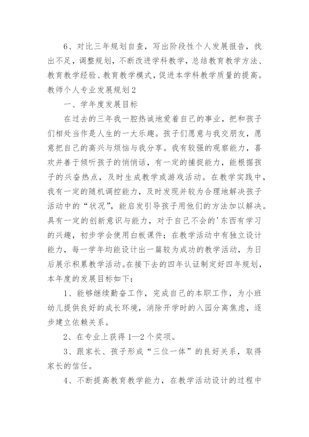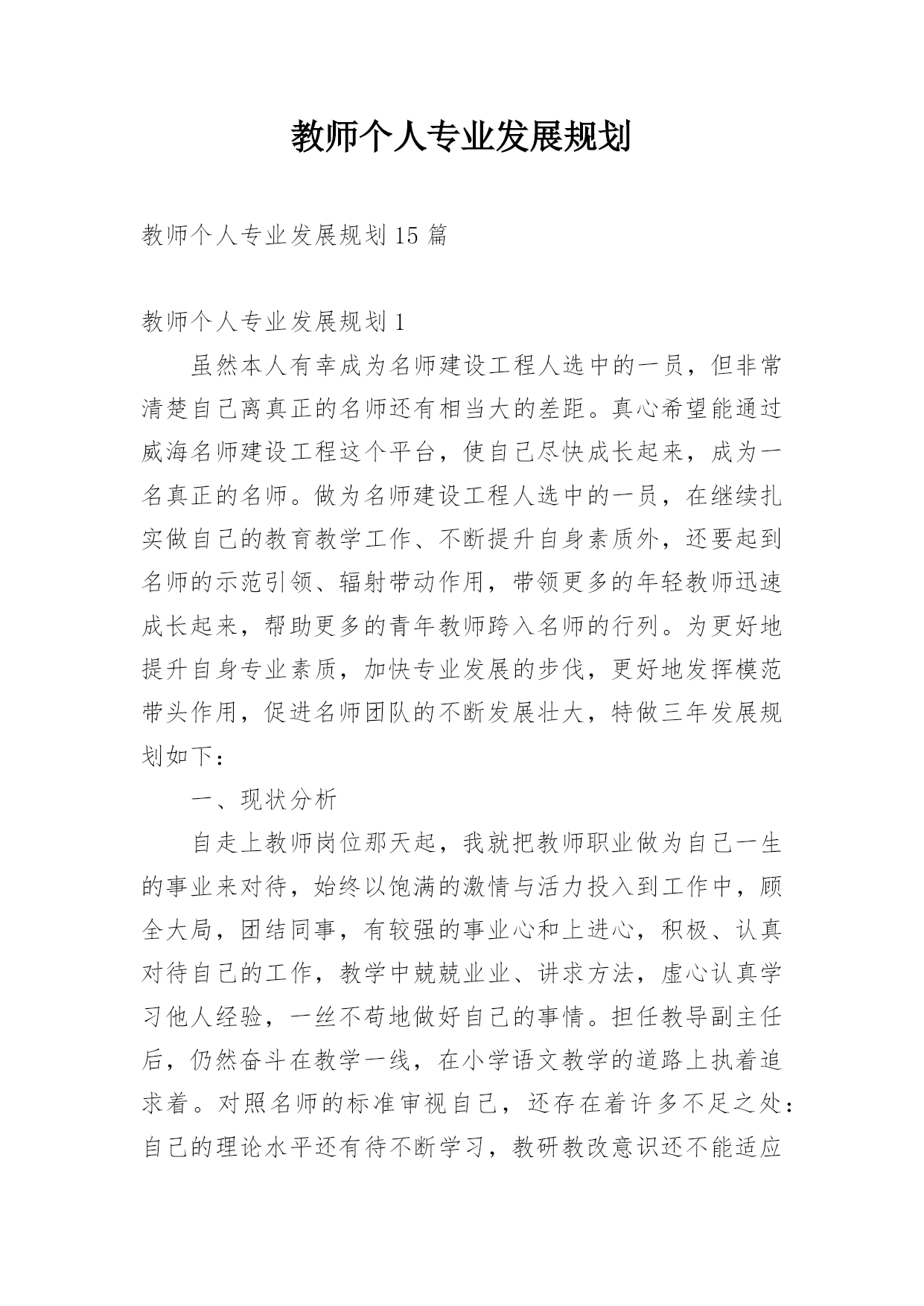 教师个人专业发展规划教师个人专业发展规划15篇教师个人专业发展规划1虽然本人有幸成为名师建设工程人选中的一员,但非常清楚自己离真正的名师还有相当大的差距。真心希望能通过威海名师建设工程这个平台,使自己尽快成长起来,成为一名真正的名师。做为名师建设工程人选中的一员,在继续扎实做自己的教育教学工作、不断提升自身素质外,还要起到名师的示范引领、辐射带动作用,带领更多的年轻教师迅速成长起来,帮助更多的青年教师跨入名师的行列。为更好地提升自身专业素质,加快专业发展的步伐,更好地发挥模范带头作用,促进名师团队的不断发