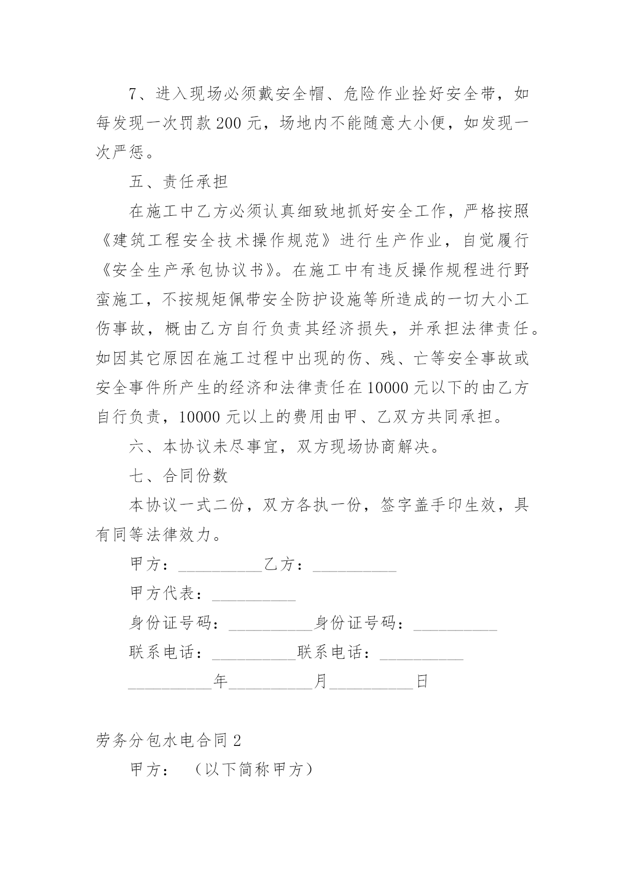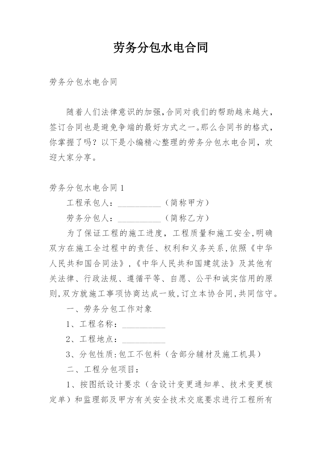 劳务分包水电合同劳务分包水电合同随着人们法律意识的加强,合同的类型越来越多,合同是企业发展中一个非常重要的因素。那么一份详细的合同要怎么写呢?以下是小编精心整理的劳务分包水电合同,欢迎阅读与收藏。劳务分包水电合同1工程承包人:__________(简称甲方)劳务分包人:__________(简称乙方)为了保证工程的施工进度,工程质量和施工安全,明确双方在施工全过程中的责任、权利和义务关系,依照《中华人民共和国合同法》,《中华人民共和国建筑法》及其他有关法律、行政法规、遵循平等、自愿、公平和诚实信用的原则,