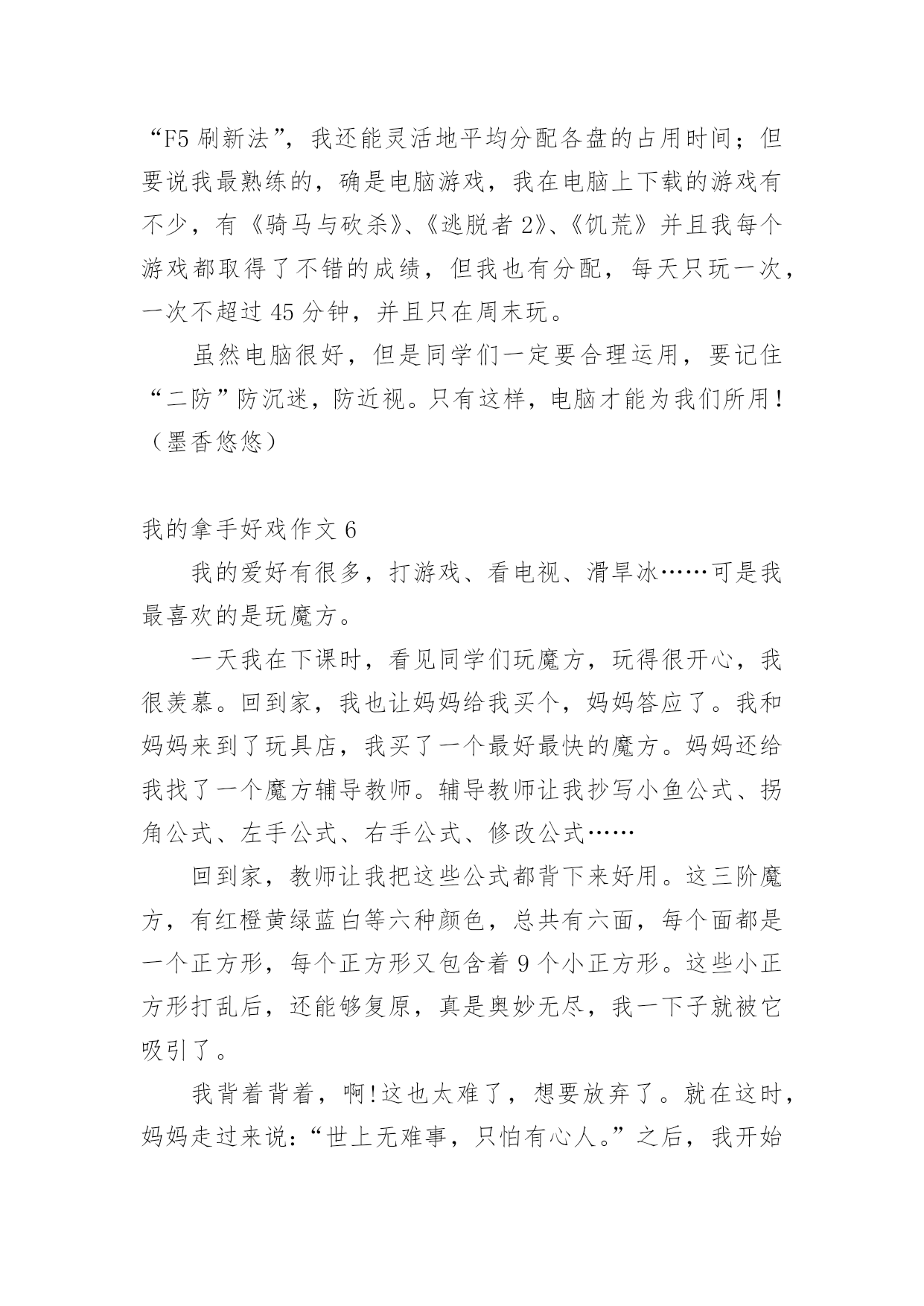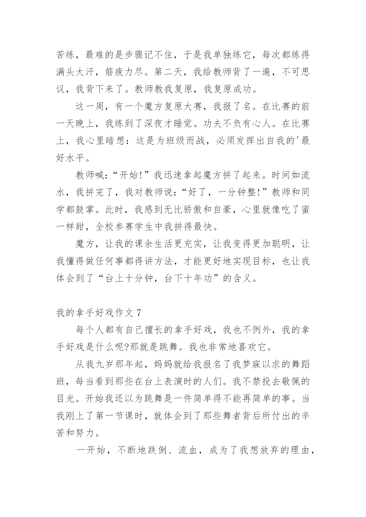 我的拿手好戏作文我的拿手好戏作文汇编(15篇)无论在学习、工作或是生活中,大家总免不了要接触或使用作文吧,作文是人们把记忆中所存储的有关知识、经验和思想用书面形式表达出来的记叙方式。还是对作文一筹莫展吗?下面是小编帮大家整理的我的拿手好戏作文,欢迎大家分享。我的拿手好戏作文1你们有没有自己的拿手好戏呢?相信你一定有,我也不例外,最擅长的当然是画画喽!我才上幼儿园的时候妈妈就送我去学画画了。我学的是儿童画,常常是老师在白板上画出一个漂亮的图画,我总能像复印一样,把画儿画得和老师的一模一样,只不过时间长了点儿