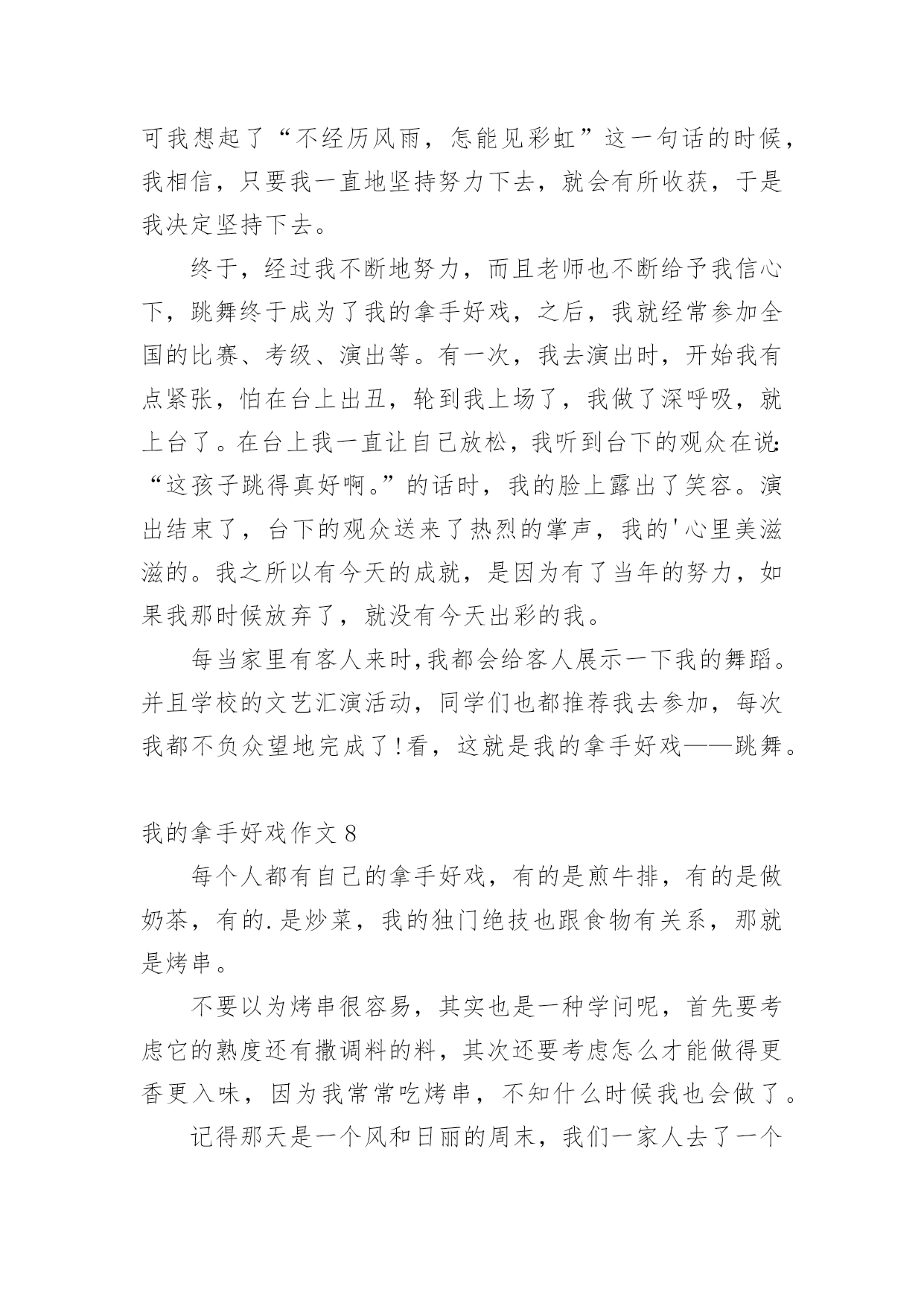 我的拿手好戏作文我的拿手好戏作文【优秀15篇】在平日的学习、工作和生活里,许多人都有过写作文的经历,对作文都不陌生吧,作文是由文字组成,经过人的思想考虑,通过语言组织来表达一个主题意义的文体。相信许多人会觉得作文很难写吧,下面是小编精心整理的我的拿手好戏作文,欢迎大家分享。我的拿手好戏作文1俗话说:“十八般武艺,样样是好戏。”每个人都有自己的特长,比如做菜、唱歌、跳舞等,而我最拿手的就是画画。第一次接触画画时我才五岁。有一次,老师让我们画一只蜥蜴。看老师给我们示范画,我感觉非常的简单,于是老师一讲完,我就