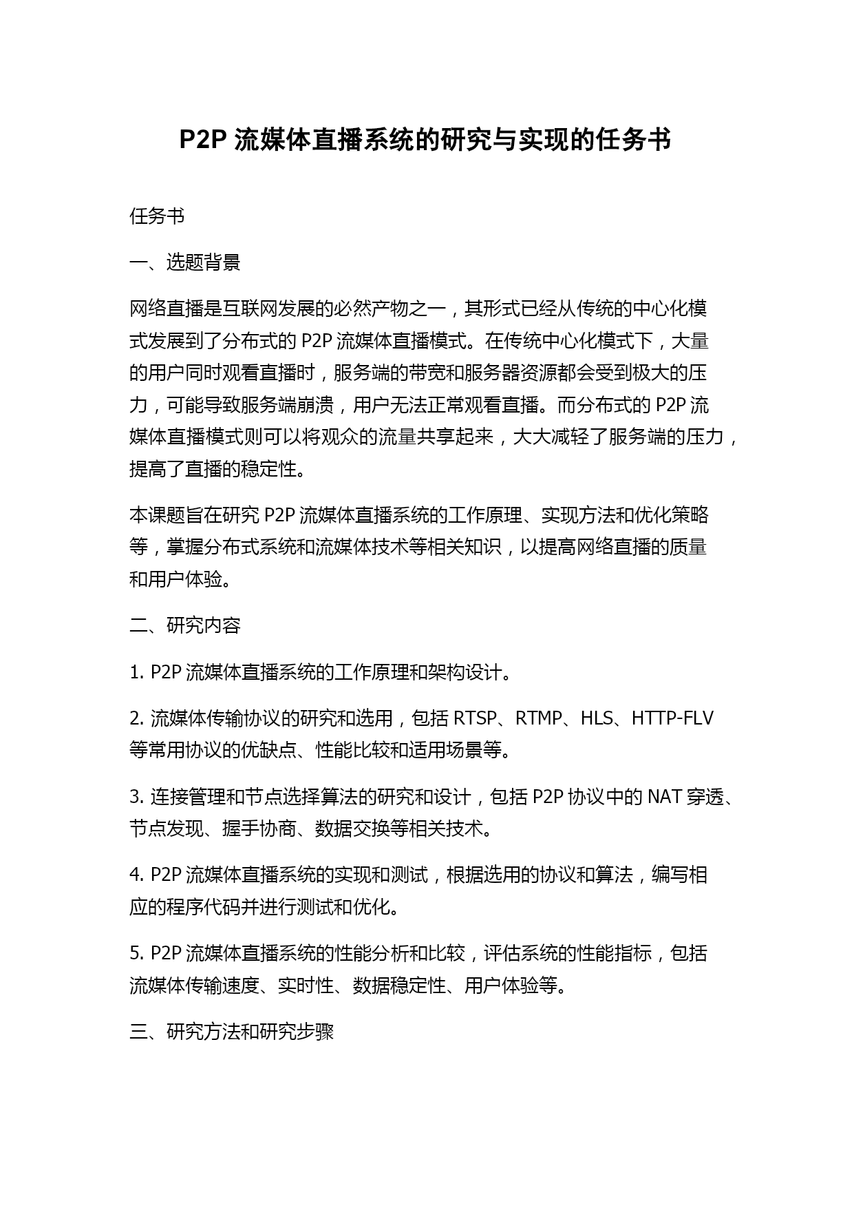 P2P流媒体系统的研究与实现的任务书任务书一、任务背景随着互联网的发展,流媒体应用已经成为人们生活的重要组成部分,如今P2P流媒体技术也逐渐成熟,并应用于各种类型的应用中,大大提高了流媒体传输的效率和稳定性。本课题旨在研究P2P流媒体系统的技术原理以及实现方法,通过实验验证其稳定性和可扩展性。二、任务目标1.学习P2P流媒体系统技术原理,包括协议、数据结构等方面的知识。2.设计并实现一个P2P流媒体系统的协议框架和数据结构。3.实现P2P流媒体系统的基本功能,如文件分发和传输、节点管理、拓扑构建等功能。4