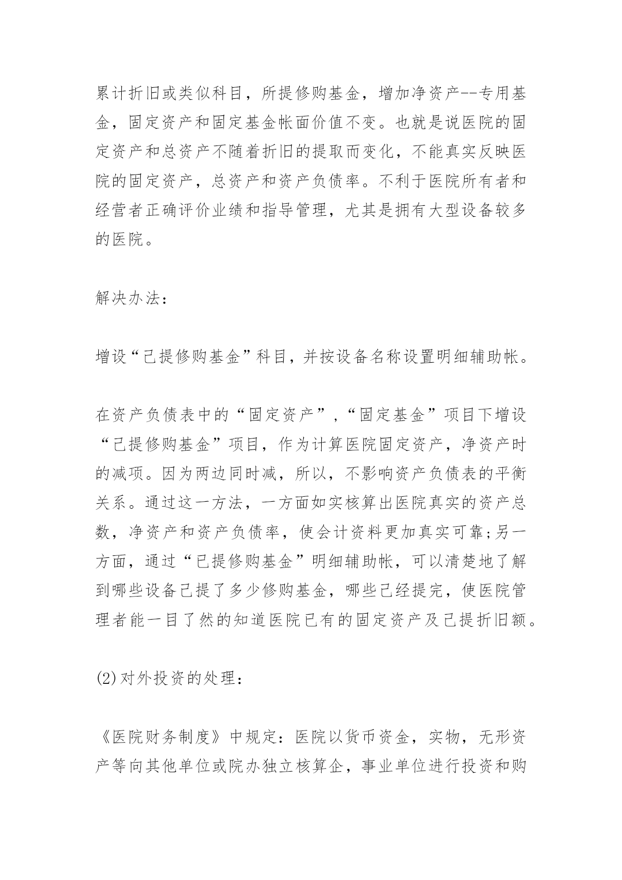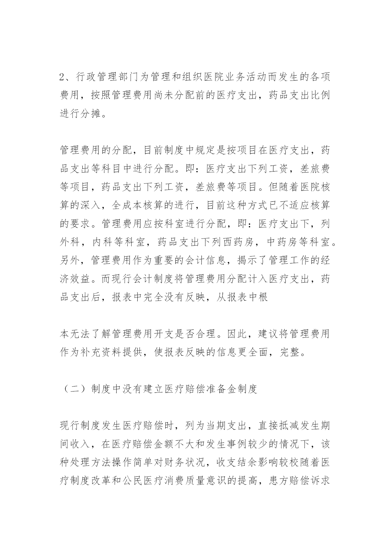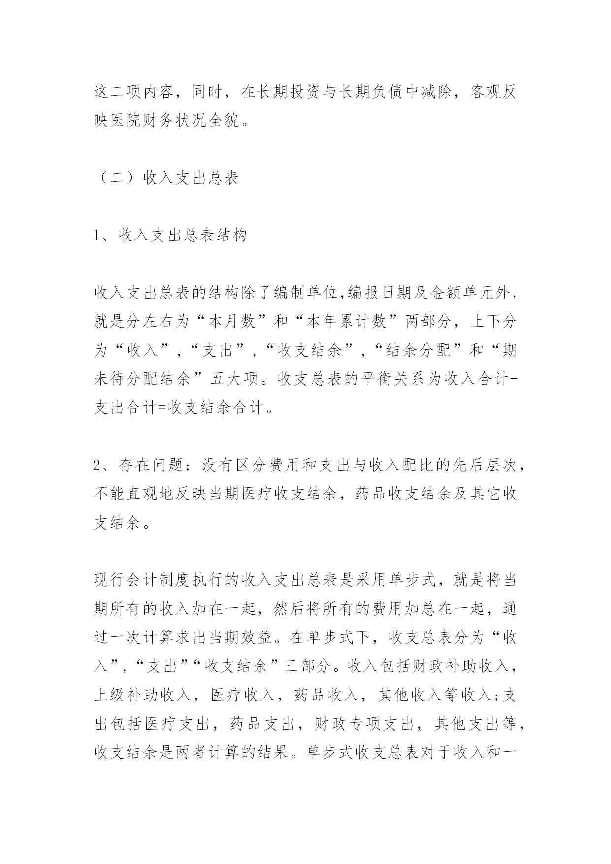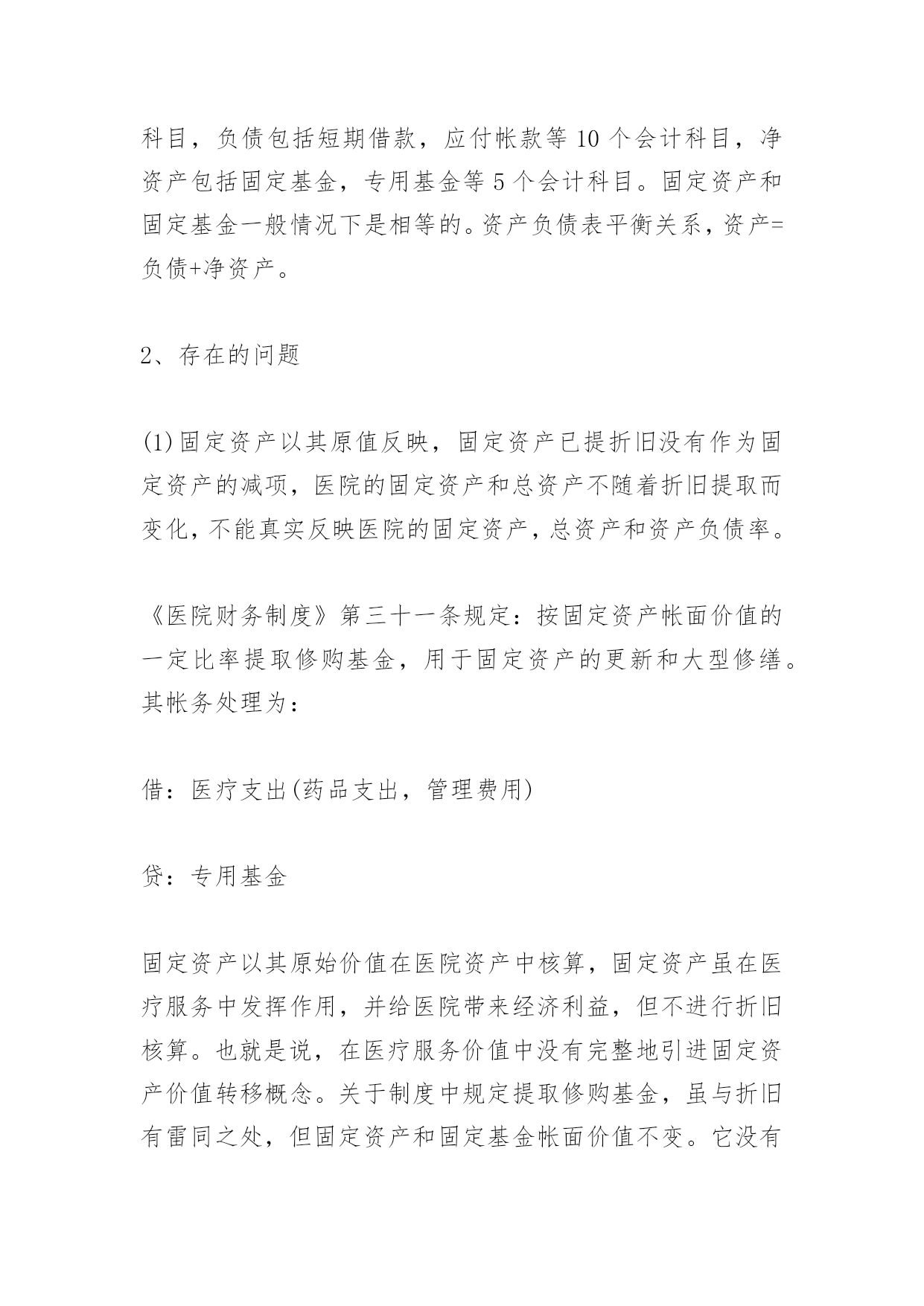 浅谈新医院财务会计制度对财务信息的影响论文浅谈新医院财务会计制度对财务信息的影响论文通过对大部分医院的传统财会制度的解析,笔者发现其在财务计算或处理时,通常会出现财务信息不可靠和不完整的状况。由于管理体制的滞后,财会制度无法“跟上”新医院发展的“步伐”,而通过对现代化医院的财务会计制度的解析和研讨,笔者认为:新医院财务会计制度可以提升医院财务信息的可靠性和质量,并可以解决传统体制中有关医院资产信息的核算不完整或信息不可靠等问题。一、传统医院财务会计制度存在的问题1.医院资产信息失真⑴固定资产和净资产失真。