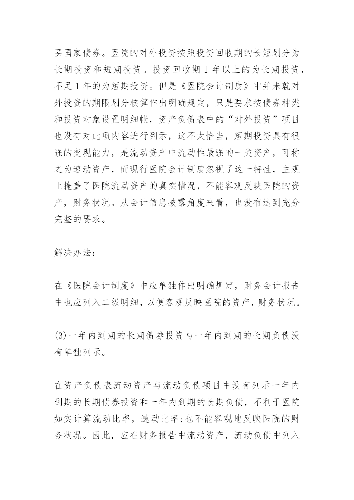 浅谈新医院财务会计制度对财务信息的影响论文通过对大部分医院的传统财会制度的解析,笔者发现其在财务计算或处理时,通常会出现财务信息不可靠和不完整的状况。由于管理体制的滞后,财会制度无法“跟上”新医院发展的“步伐”,而通过对现代化医院的财务会计制度的解析和研讨,笔者认为:新医院财务会计制度可以提升医院财务信息的可靠性和质量,并可以解决传统体制中有关医院资产信息的核算不完整或信息不可靠等问题。一、传统医院财务会计制度存在的问题1.医院资产信息失真⑴固定资产和净资产失真。依据传统的医院财务会计体制的规定,医院应依