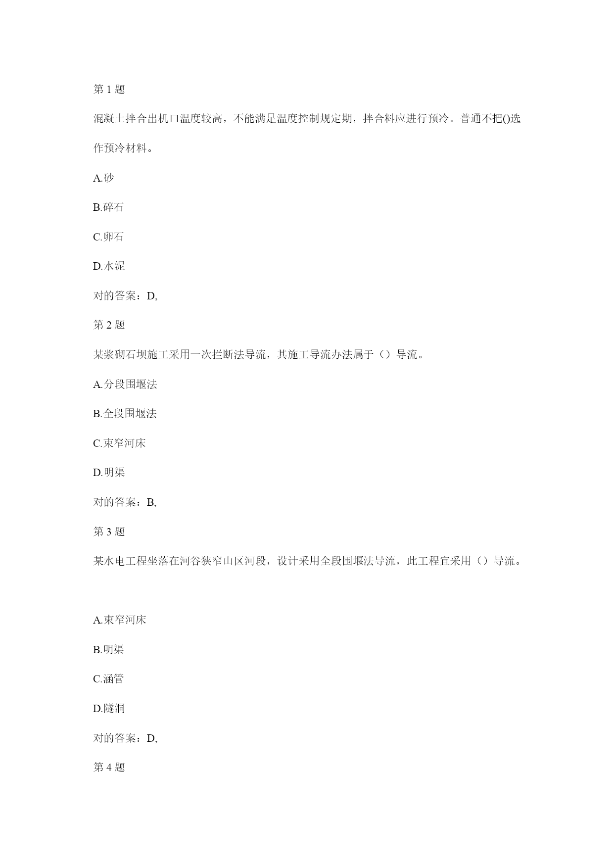 第1题混凝土的拌合出机口温度较高,不能满足温度控制规定期,拌合料应进行预冷。一般不把()选作预冷材料。A.砂B.碎石C.卵石D.水泥对的答案:D,第2题某浆砌石坝施工采用一次拦断法导流,其施工导流方法属于()导流。A.分段围堰法B.全段围堰法C.束窄河床D.明渠对的答案:B,第3题某水电工程坐落在河谷狭窄的山区河段,设计采用全段围堰法导流,此工程宜采用()导流。A.束窄河床B.明渠C.涵管D.隧洞对的答案:D,第4题水利水电工程施工临时设施重要涉及施工交通运送和()两部分。A.施工工厂设施B.综合加工系统
