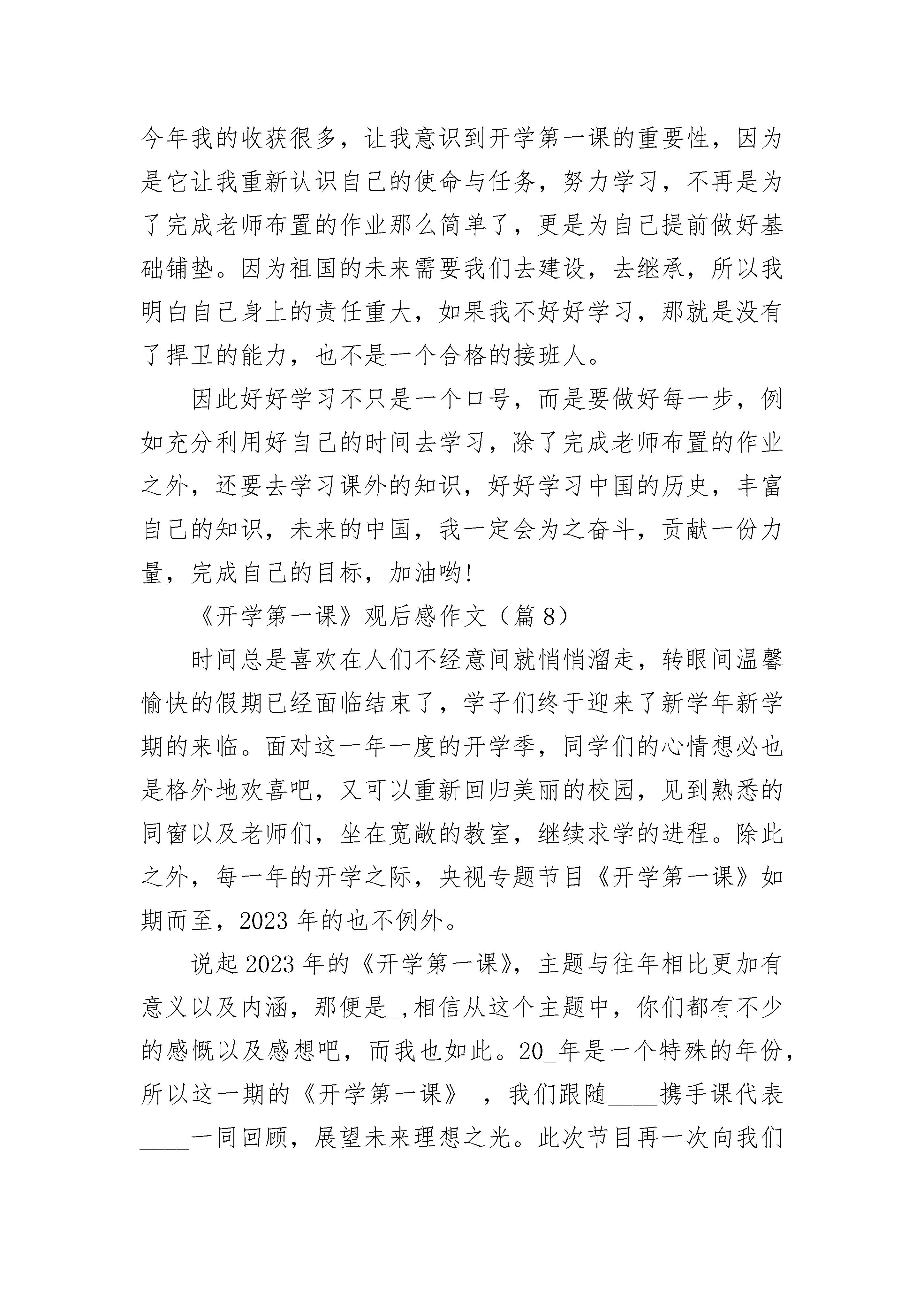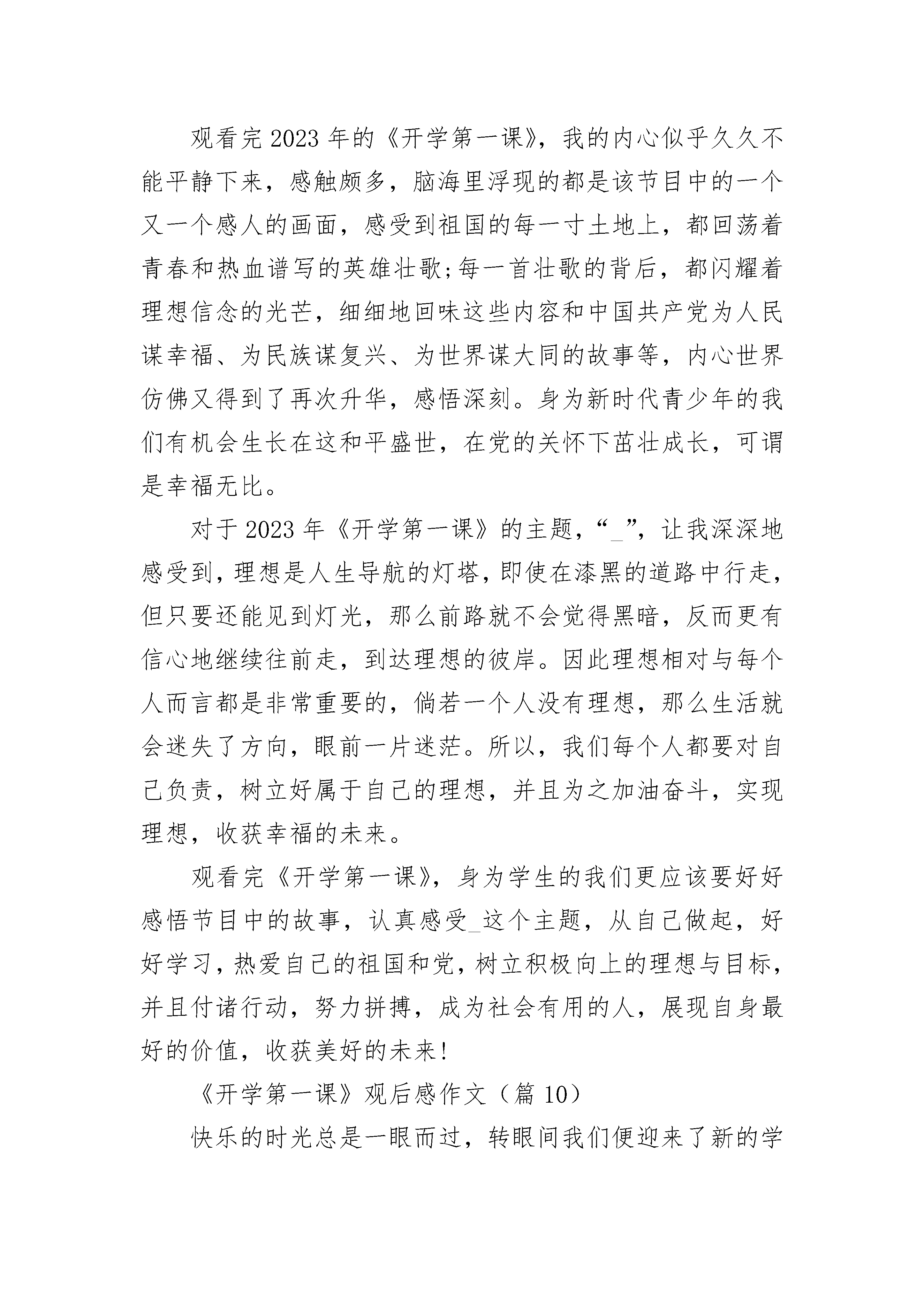 《开学第一课》2023优秀观后感作文范文《开学第一课》观后感作文(篇1)假期已经结束了,又到了新学期的开始,2023年的《开学第一课》教育传片也随着我们的开学到来了。今年的《开学第一课》主题是“_”。2023年的《开学第一课》是老师组织同学们一起看的,同学们都坐在自己位子上,认真的,目不转睛的看着课室里播放着的大屏幕。《开学第一课》是一堂课外知识课,是给中小学生们看的节目,节目里开始从确立祖国与五星红旗的概念开始,然后再通过观看一代代中国人民的伟大英雄壮举,这样可以让我们深深的感受到了我们新中国的崛起