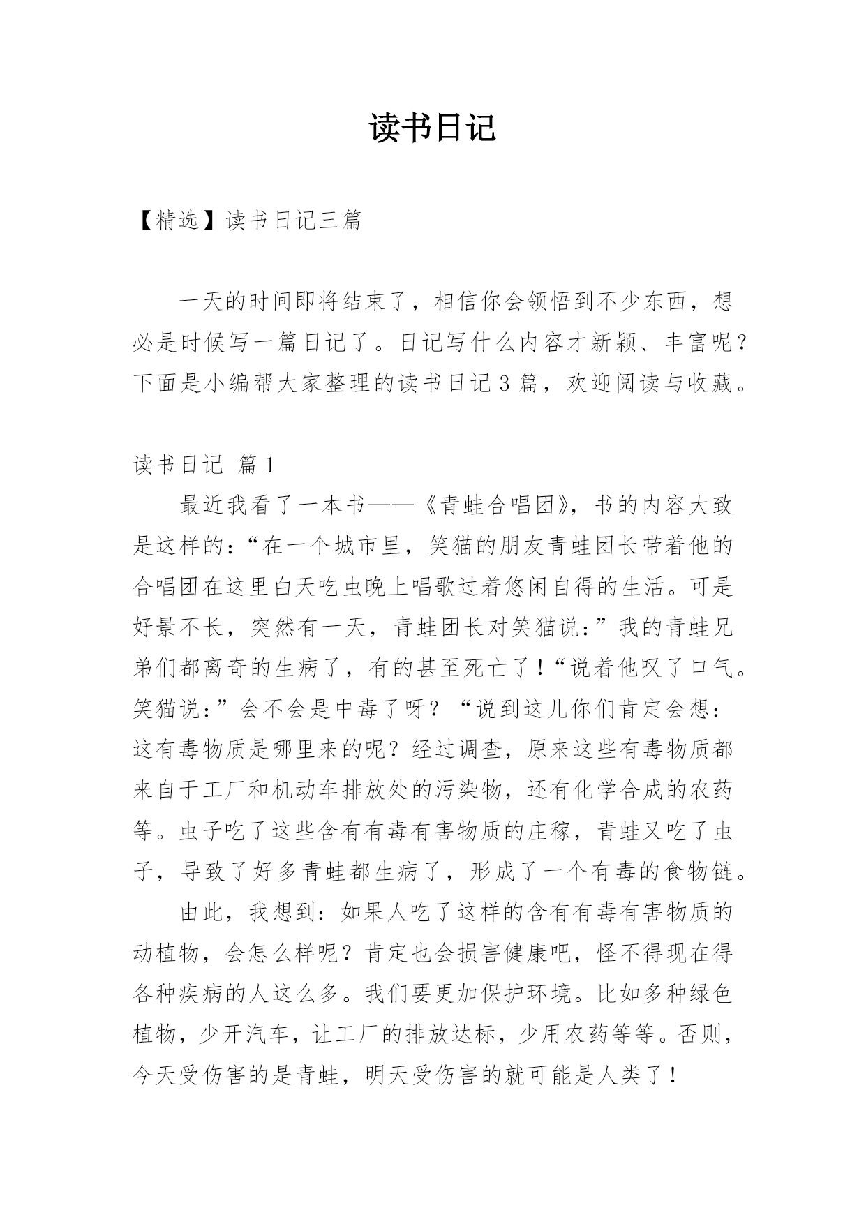 读书日记【精选】读书日记三篇一天的时间即将结束了,相信你会领悟到不少东西,想必是时候写一篇日记了。日记写什么内容才新颖、丰富呢?下面是小编帮大家整理的读书日记3篇,欢迎阅读与收藏。读书日记篇1最近我看了一本书——《青蛙合唱团》,书的内容大致是这样的:“在一个城市里,笑猫的朋友青蛙团长带着他的合唱团在这里白天吃虫晚上唱歌过着悠闲自得的生活。可是好景不长,突然有一天,青蛙团长对笑猫说:”我的青蛙兄弟们都离奇的生病了,有的甚至死亡了!“说着他叹了口气。笑猫说:”会不会是中毒了呀?“说到这儿你们肯定会想:这有毒物