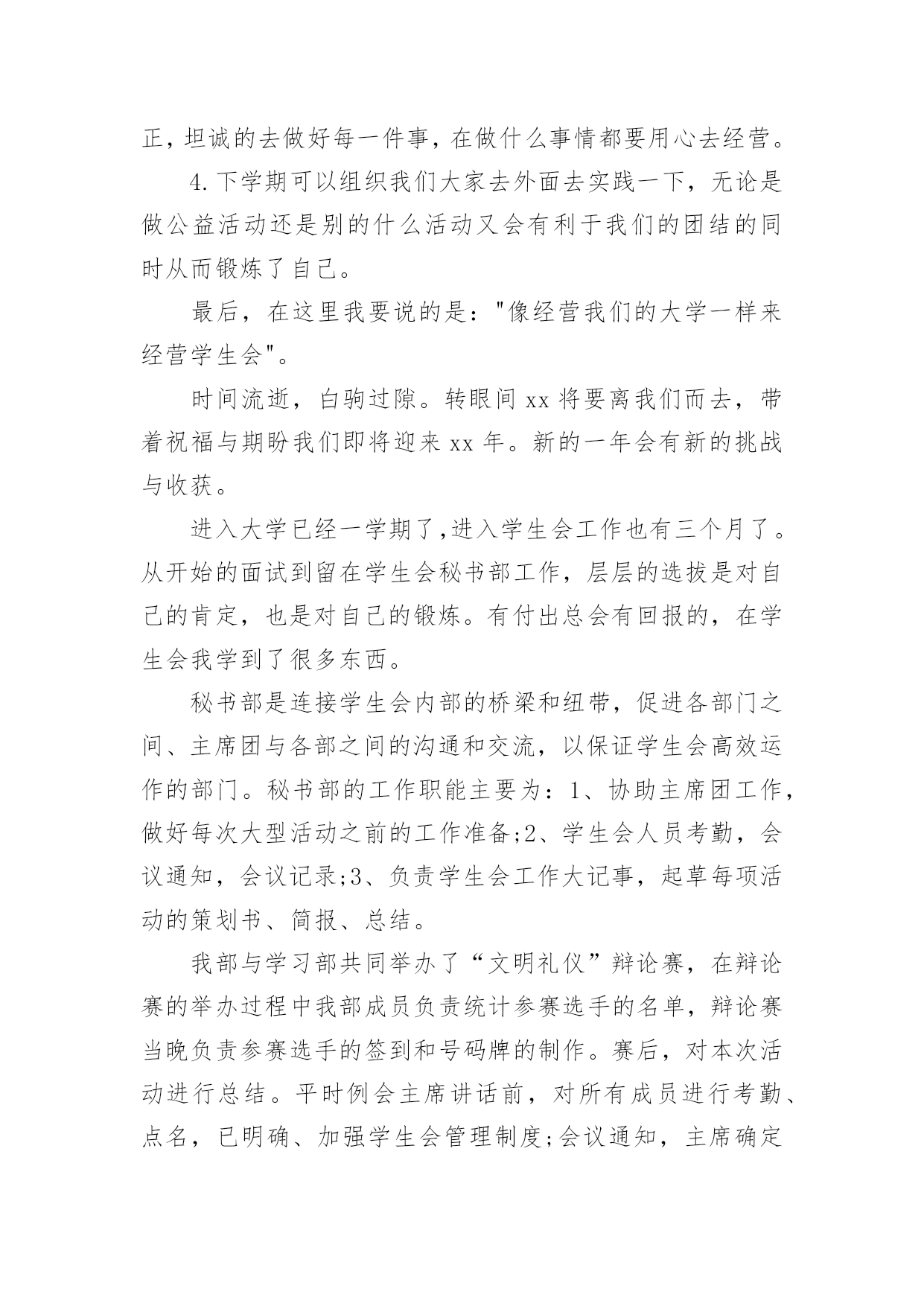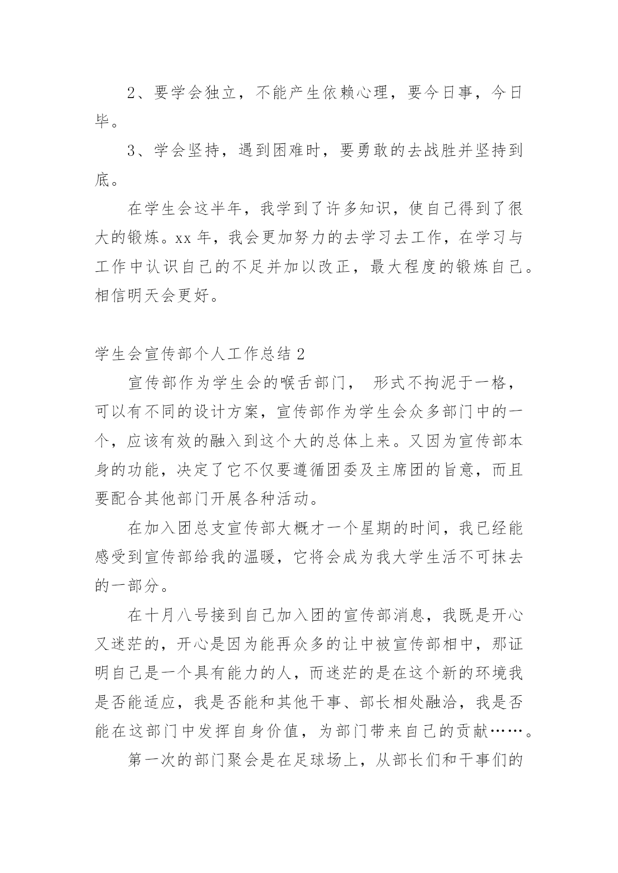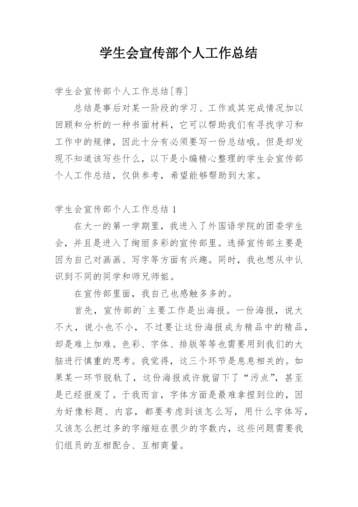 学生会宣传部个人工作总结学生会宣传部个人工作总结[荐]总结是事后对某一阶段的学习、工作或其完成情况加以回顾和分析的一种书面材料,它可以帮助我们有寻找学习和工作中的规律,因此十分有必须要写一份总结哦。但是却发现不知道该写些什么,以下是小编精心整理的学生会宣传部个人工作总结,仅供参考,希望能够帮助到大家。学生会宣传部个人工作总结1在大一的第一学期里,我进入了外国语学院的团委学生会,并且是进入了绚丽多彩的宣传部里。选择宣传部主要是因为自己对画画、写字等方面有兴趣。同时,我也想从中认识到不同的同学和师兄师姐。在宣