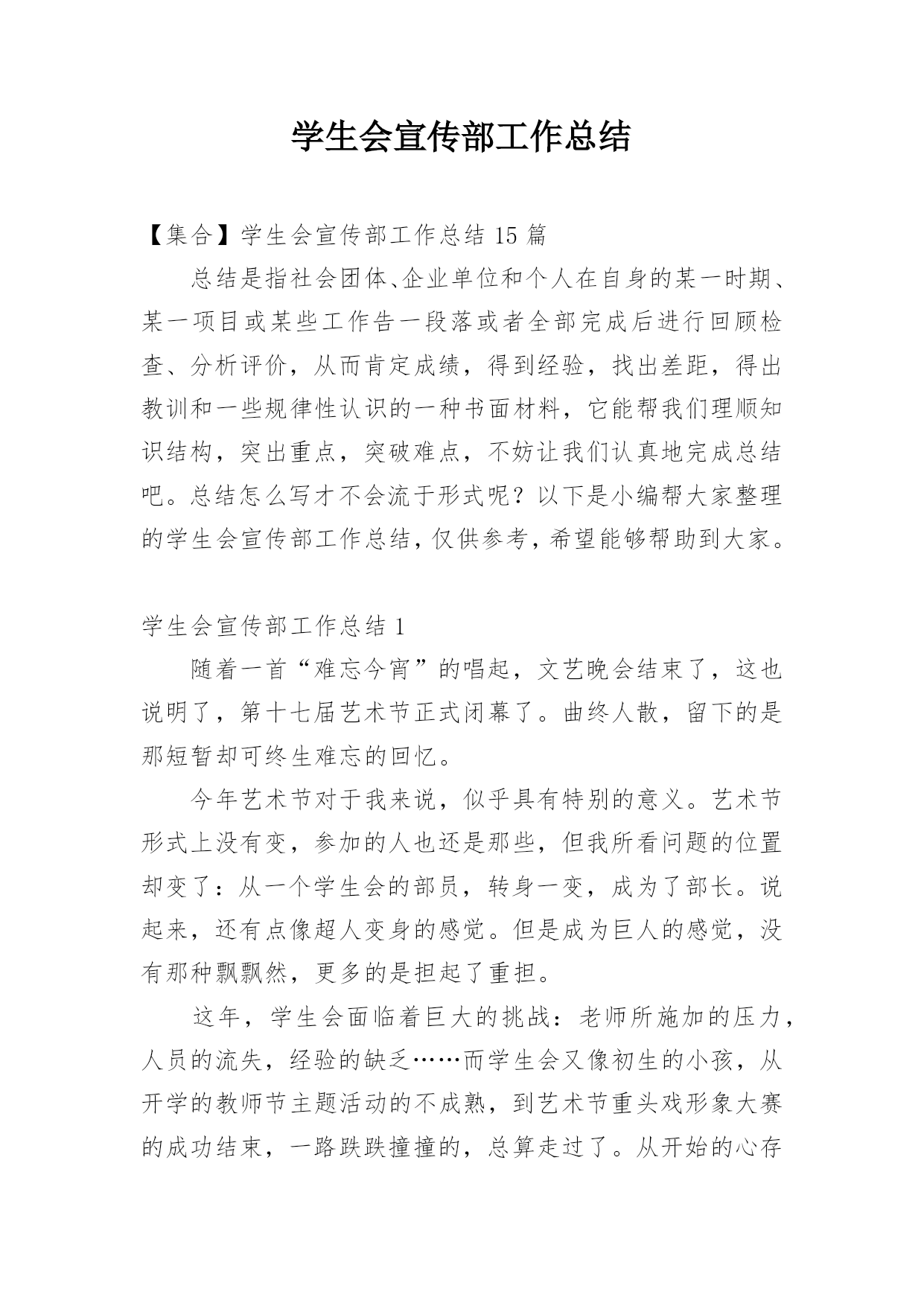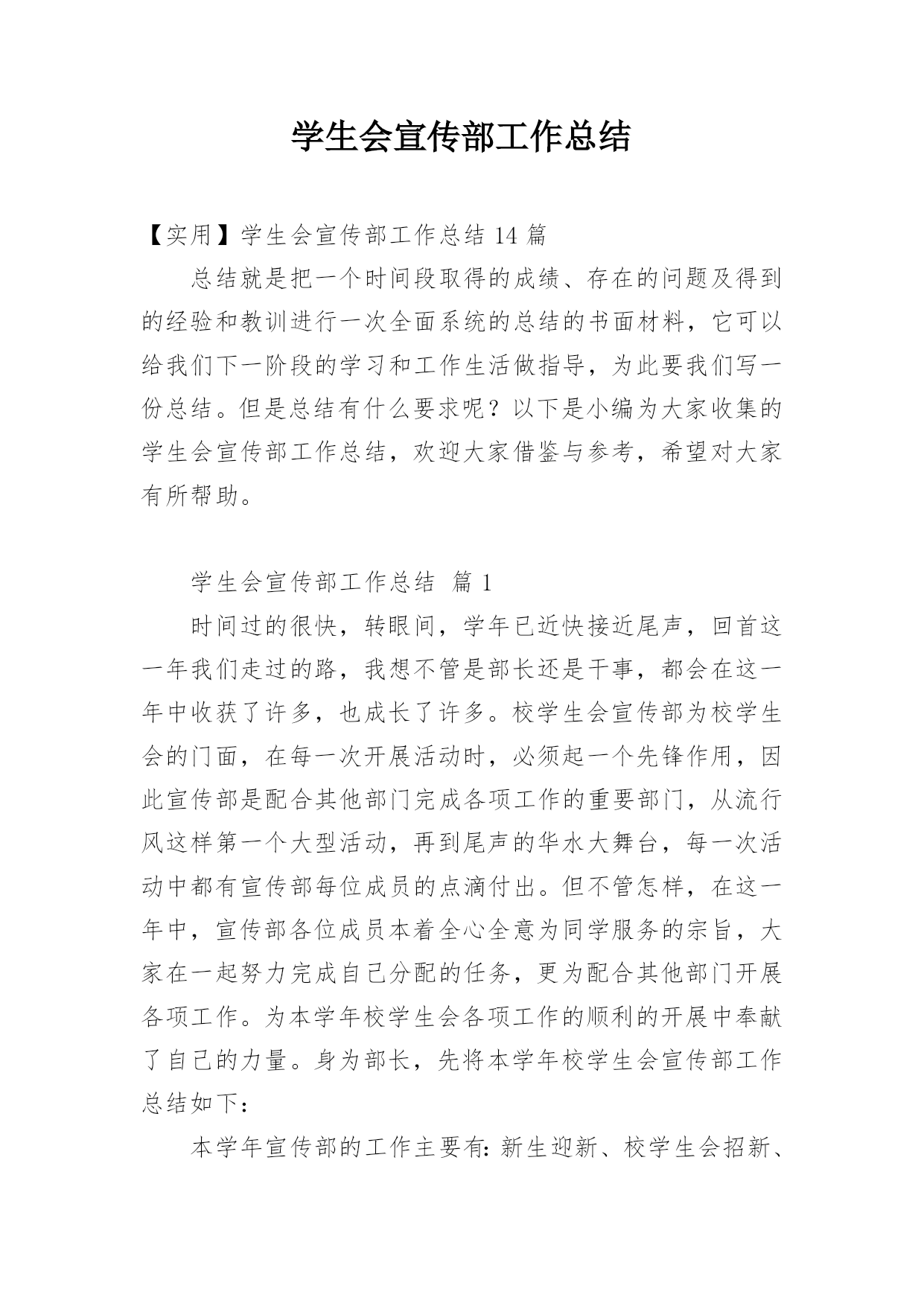 学生会宣传部工作总结【实用】学生会宣传部工作总结14篇总结就是把一个时间段取得的成绩、存在的问题及得到的经验和教训进行一次全面系统的总结的书面材料,它可以给我们下一阶段的学习和工作生活做指导,为此要我们写一份总结。但是总结有什么要求呢?以下是小编为大家收集的学生会宣传部工作总结,欢迎大家借鉴与参考,希望对大家有所帮助。学生会宣传部工作总结篇1时间过的很快,转眼间,学年已近快接近尾声,回首这一年我们走过的路,我想不管是部长还是干事,都会在这一年中收获了许多,也成长了许多。校学生会宣传部为校学生会的门面,在每