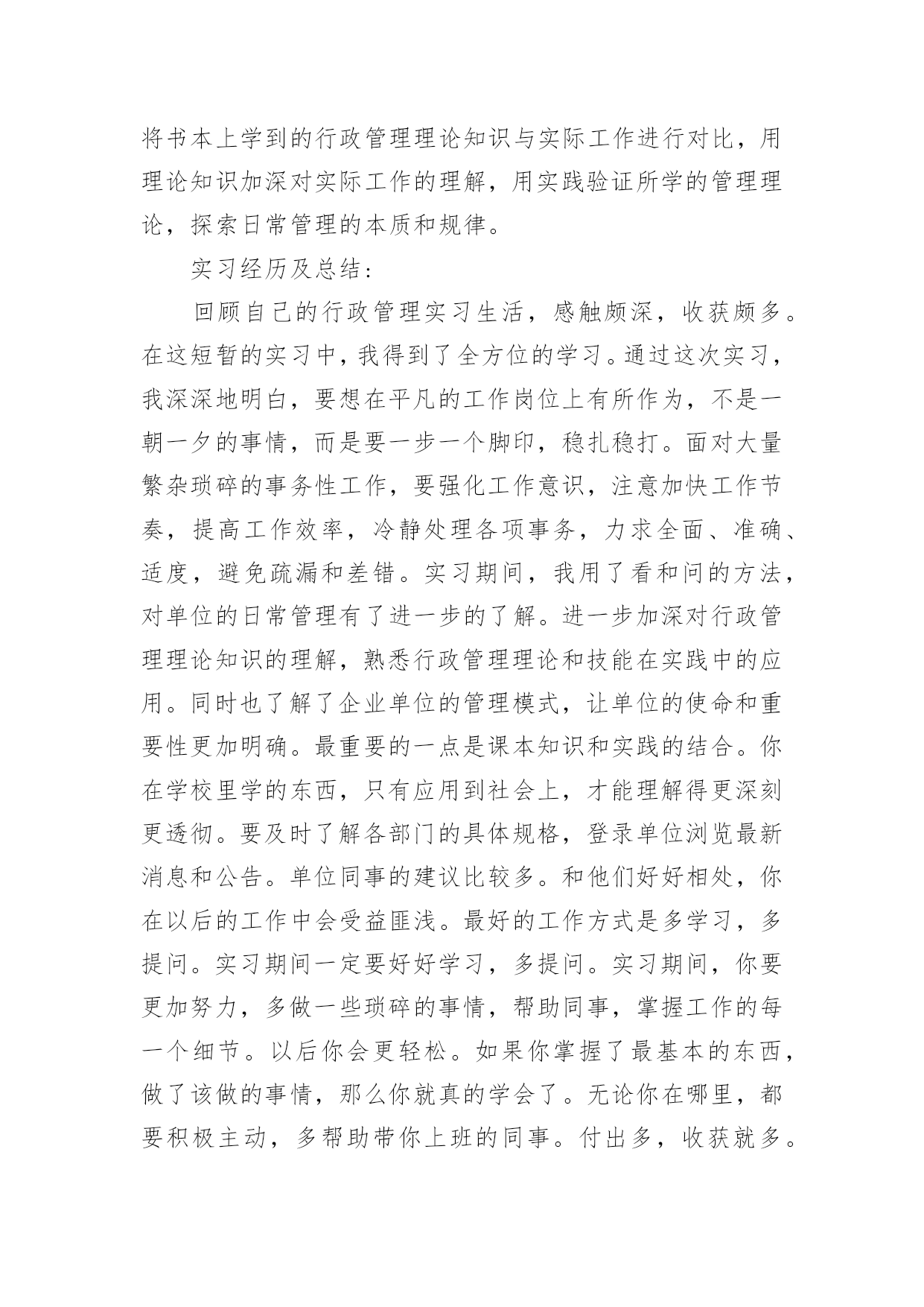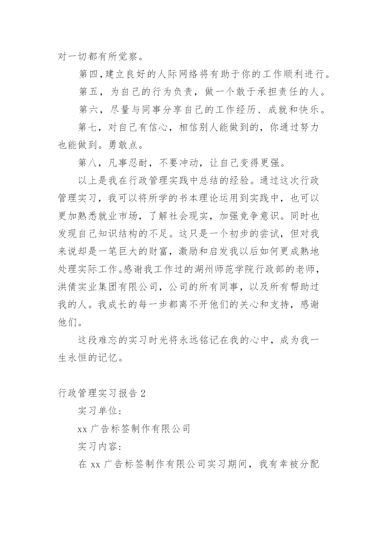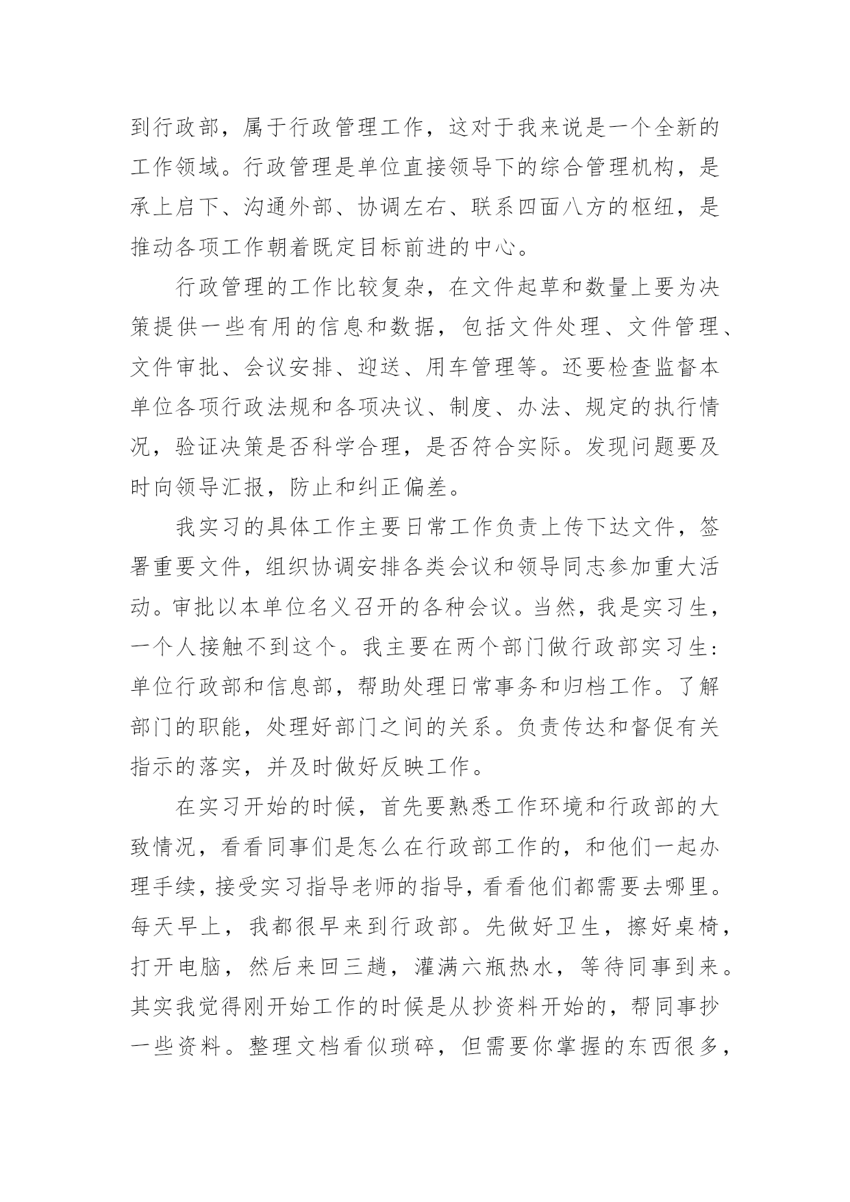 行政管理实习报告行政管理实习报告(汇编2篇)在不断进步的时代,越来越多人会去使用报告,不同种类的报告具有不同的用途。那么你真正懂得怎么写好报告吗?下面是小编帮大家整理的行政管理实习报告,欢迎大家分享。行政管理实习报告1时光荏苒,已经是20xx年12月了,我已经完成了在光明公司为期3个月的实习,作为大学生涯的最后一课,实习不仅重要,而且独特。正是通过实习,我逐渐掌握了如何将学校所教的理论知识恰当地运用到实际工作中,让自己慢慢褪去学生的浮躁和幼稚,真正接触这个社会,逐渐融入这个社会,实现自己走向社会独立成长的