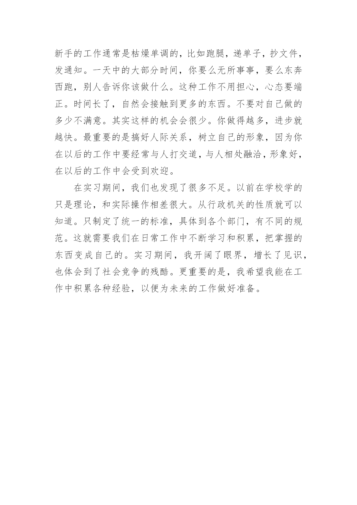 行政管理的实习报告行政管理的实习报告模板集锦8篇在当下这个社会中,报告与我们愈发关系密切,不同的报告内容同样也是不同的。你所见过的报告是什么样的呢?以下是小编帮大家整理的行政管理的实习报告8篇,供大家参考借鉴,希望可以帮助到有需要的朋友。行政管理的实习报告篇11实习目的通过毕业实习,我们可以把理论和实践更好地结合在一起,加深对理论知识的理解,并巩固所学的专业知识,进一步提高认识问题、分析问题、解决问题的能力,加强与人沟通交流的能力,为今后走向社会、服务社会做好心理准备和业务准备,做好从一个在校学生过渡到社