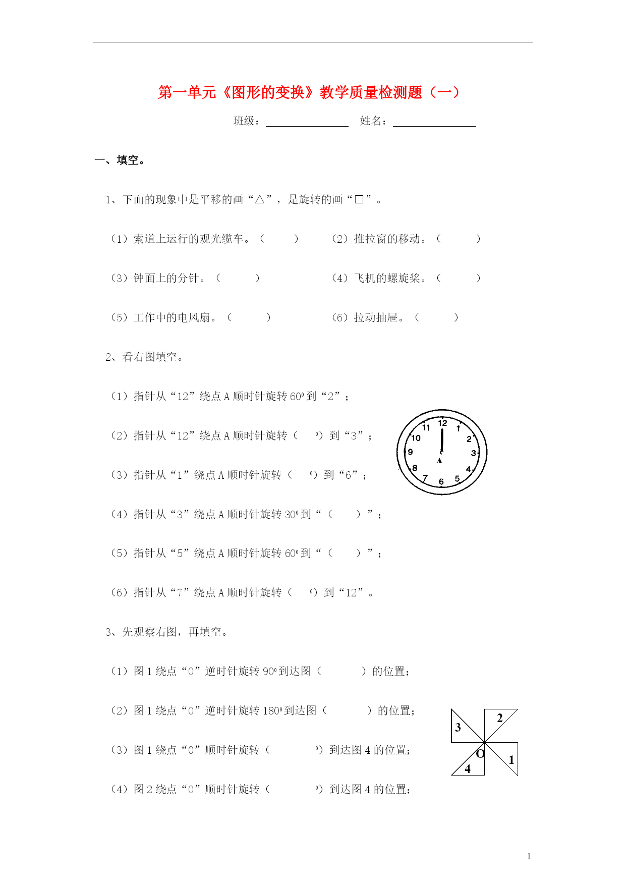 第一单元《图形的变换》教学质量检测题(一)班级:姓名:一、填空。1、下面的现象中是平移的画“△”,是旋转的画“□”。(1)索道上运行的观光缆车。()(2)推拉窗的移动。()(3)钟面上的分针。()(4)飞机的螺旋桨。()(5)工作中的电风扇。()(6)拉动抽屉。()2、看右图填空。A(1)指针从“12”绕点A顺时针旋转600到“2”;(2)指针从“12”绕点A顺时针旋转(0)到“3”;(3)指针从“1”绕点A顺时针旋转(0)到“6”;(4)指针从“3”绕点A顺时针旋转300到