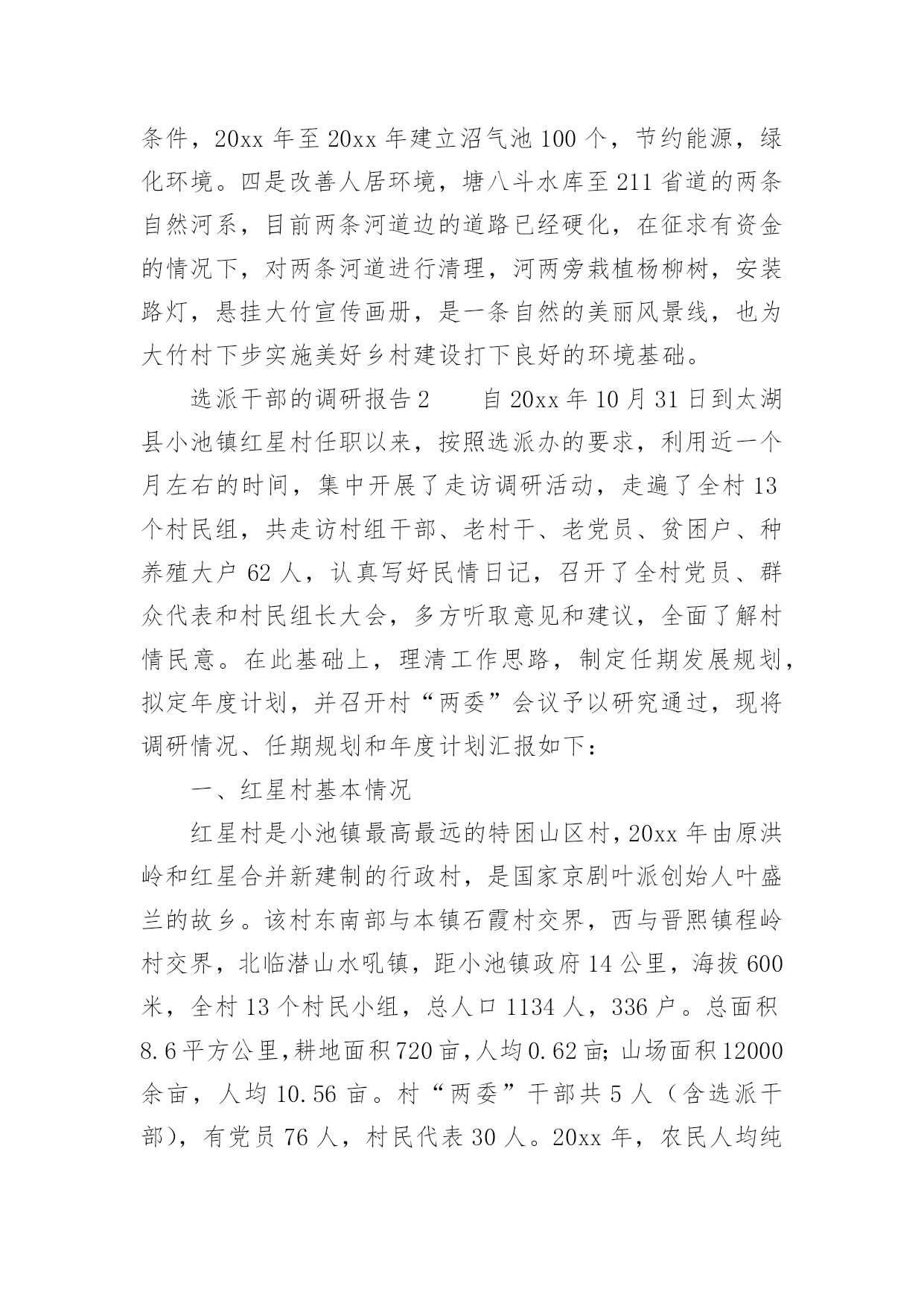 关于选派干部调研报告根据市委组织部和市扶贫办的统一部署和安排我被选派到xx县刘畈乡九田村担任第一书记兼驻村扶贫工作队队长。10月30日驻村任职以后按照市委要求认真对村情概况、组织建设情况、经济发展情况、社会事业情况等进行了深入地调查研究。其间通过与村”两委”班子座谈、实地察看村情、听取群众意见、走访党员代表和村民代表等形式围绕新农村建设、村集体经济发展与村民增收、社会稳定、基层组织建设等方面深入开展调研活动基本掌握了九田村经济社会发展整体现状。现将此次调研情况报告如下:一、