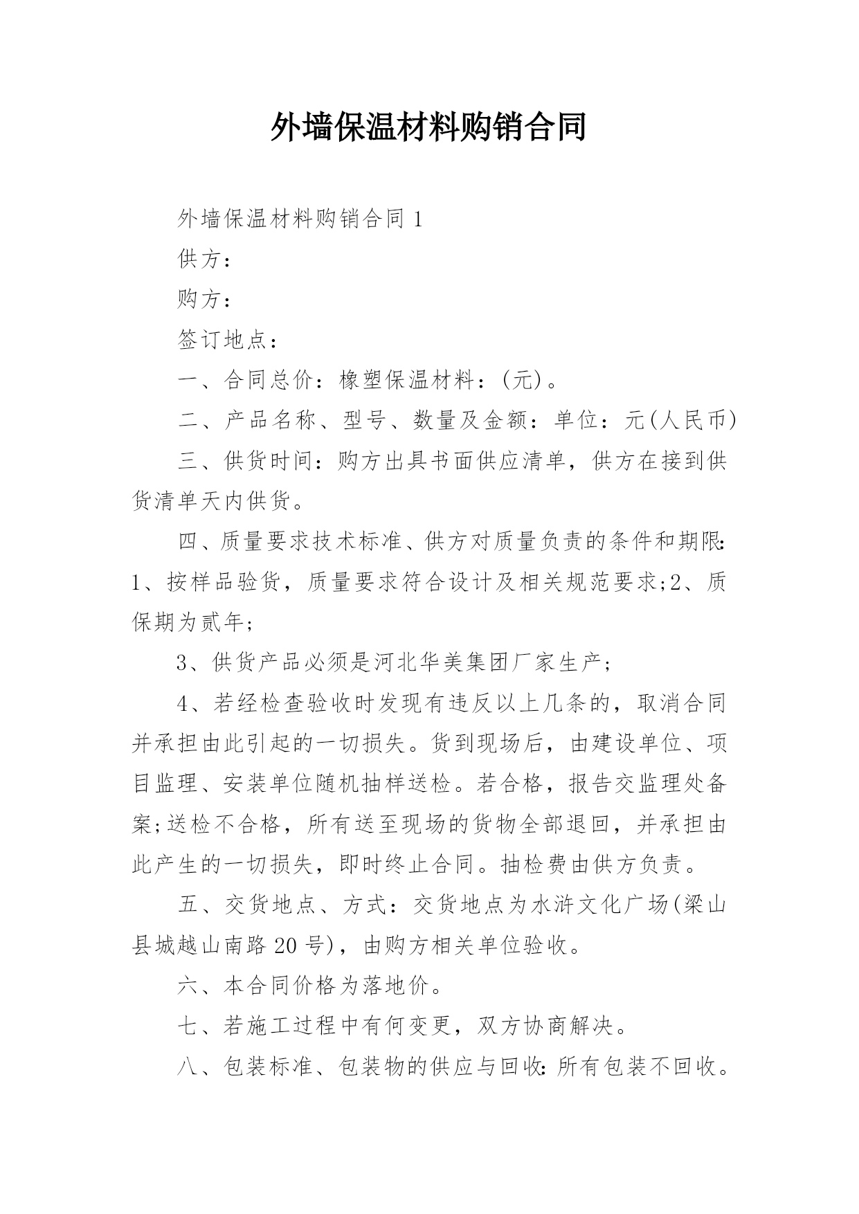外墙保温材料购销合同外墙保温材料购销合同现今很多公民的维权意识在不断增强,合同出现的次数越来越多,它可以保护民事法律关系。合同有不同的类型,当然也有不同的目的,以下是小编整理的外墙保温材料购销合同,欢迎大家借鉴与参考,希望对大家有所帮助。外墙保温材料购销合同1合同编号:__________需方:_______________供方:_______________签订地点:__________供需双方通过友好协商,本着互惠互利、真诚合作、共同发展、优势互补的原则,根据国家相关法律、法规,签订本合同,由供需双方