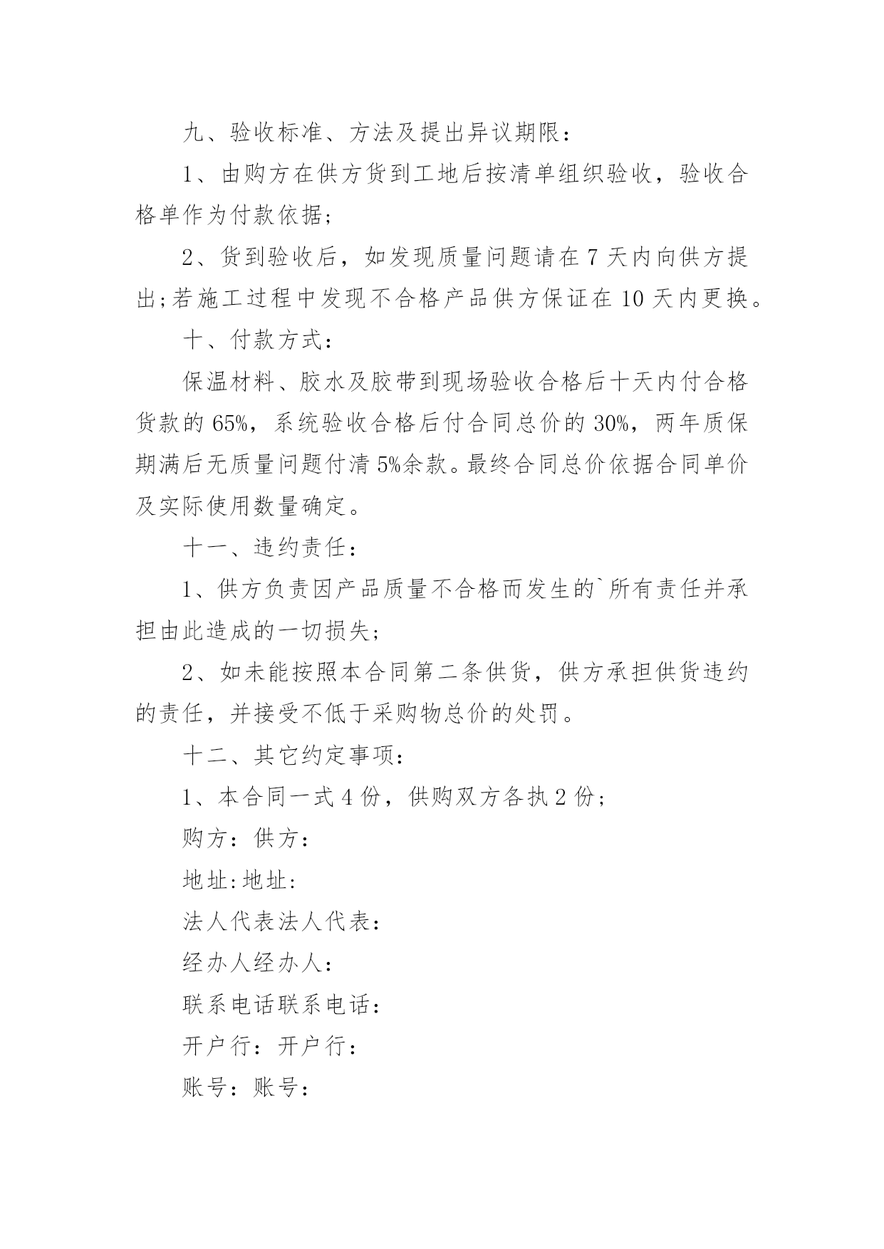 外墙保温材料购销合同外墙保温材料购销合同1供方:购方:签订地点:一、合同总价:橡塑保温材料:(元)。二、产品名称、型号、数量及金额:单位:元(人民币)三、供货时间:购方出具书面供应清单,供方在接到供货清单天内供货。四、质量要求技术标准、供方对质量负责的条件和期限:1、按样品验货,质量要求符合设计及相关规范要求;2、质保期为贰年;3、供货产品必须是河北华美集团厂家生产;4、若经检查验收时发现有违反以上几条的,取消合同并承担由此引起的一切损失。货到现场后,由建设单位、项目监理、安装单位随机抽样送检。若合格,报