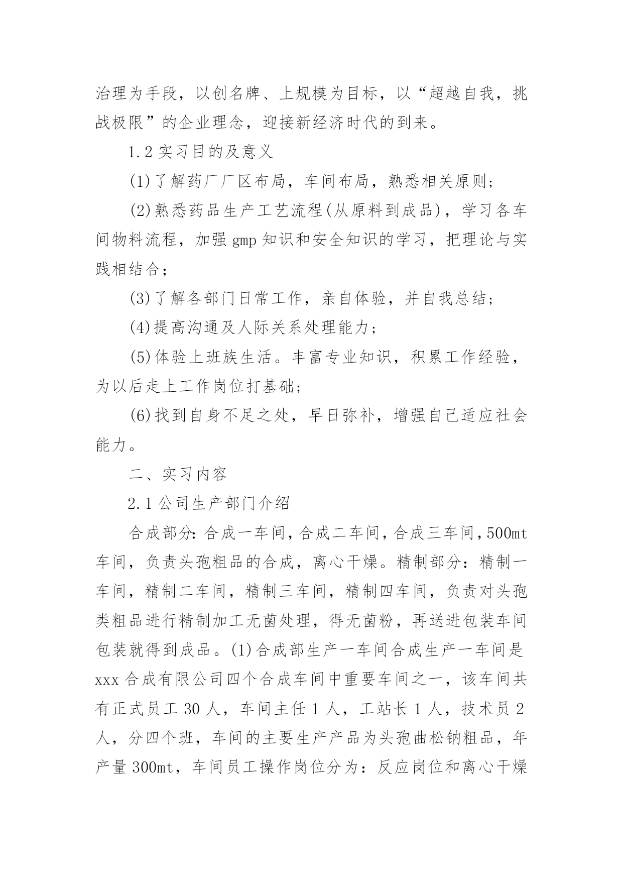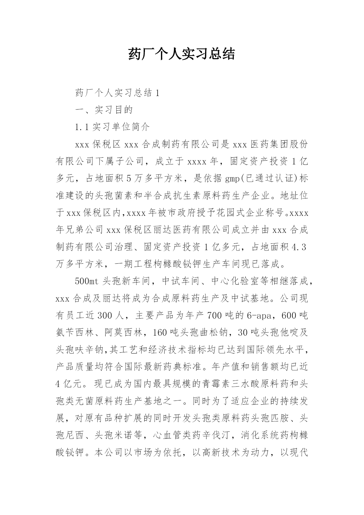 药厂实习个人总结药厂实习个人总结6篇总结是把一定阶段内的有关情况分析研究,做出有指导性的经验方法以及结论的书面材料,通过它可以全面地、系统地了解以往的学习和工作情况,是时候写一份总结了。那么总结应该包括什么内容呢?以下是小编收集整理的药厂实习个人总结,欢迎阅读与收藏。药厂实习个人总结1一、实习目的1.1实习单位简介xxx保税区xxx合成制药有限公司是xxx医药集团股份有限公司下属子公司,成立于xxxx年,固定资产投资1亿多元,占地面积5万多平方米,是依据gmp(已通过认证)标准建设的头孢菌素和半合成抗生素