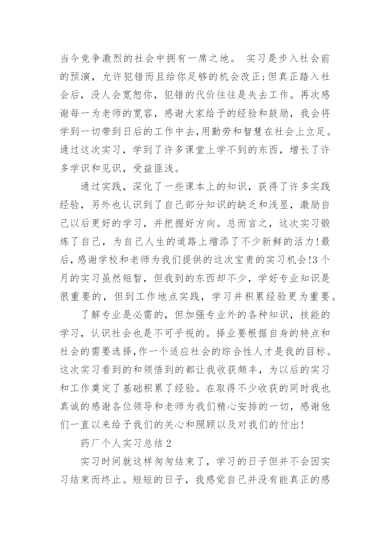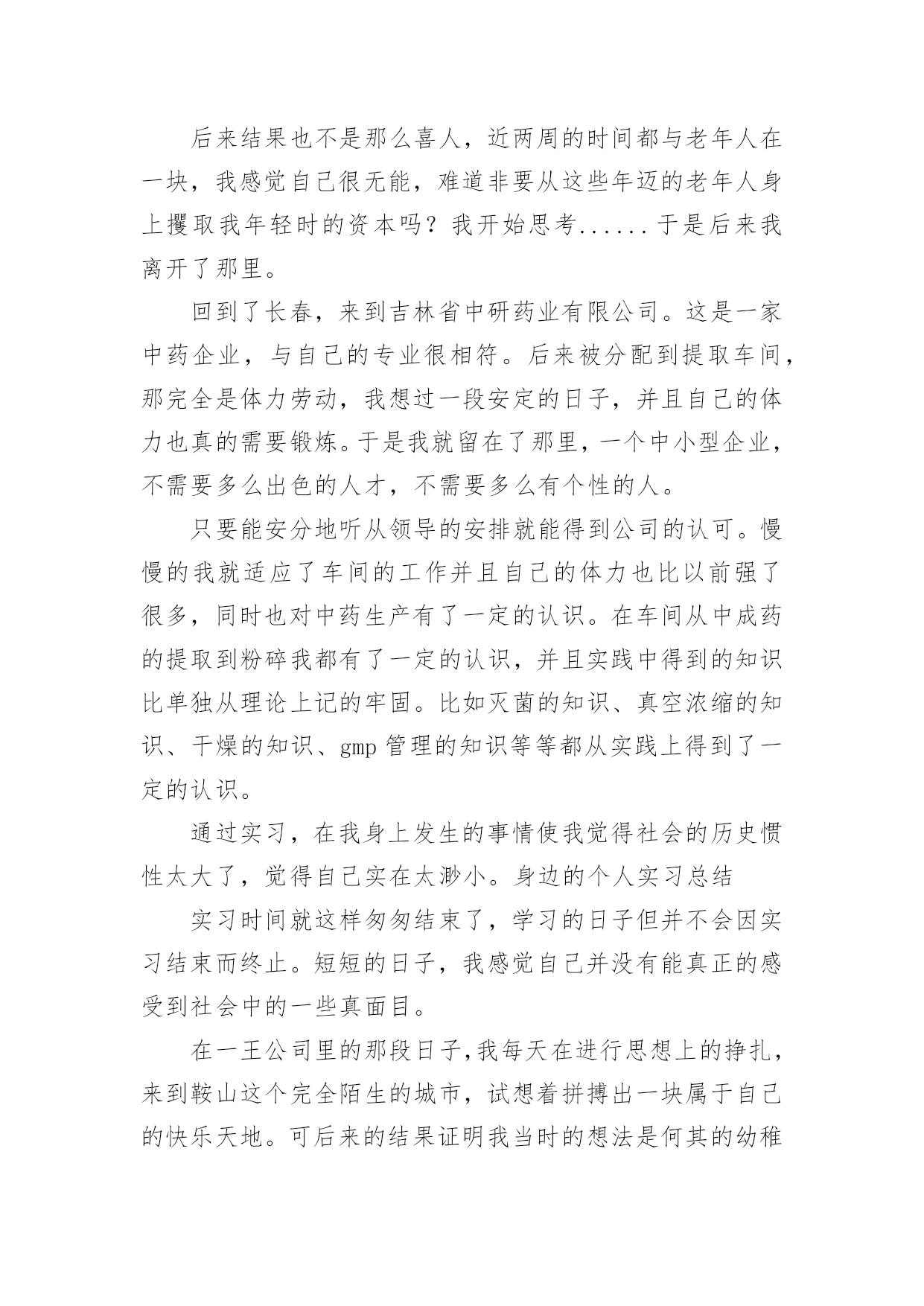 药厂个人实习总结药厂个人实习总结(精选6篇)总结是指社会团体、企业单位和个人在自身的某一时期、某一项目或某些工作告一段落或者全部完成后进行回顾检查、分析评价,从而肯定成绩,得到经验,找出差距,得出教训和一些规律性认识的一种书面材料,它在我们的学习、工作中起到呈上启下的作用,让我们一起来学习写总结吧。你想知道总结怎么写吗?下面是小编为大家收集的药厂个人实习总结,欢迎阅读与收藏。药厂个人实习总结1在这两个月的时间里,我在XX药业有限公司的研发部实习。这是第一次正式与社会接轨踏上工作岗位,开始与以往完全不一样的