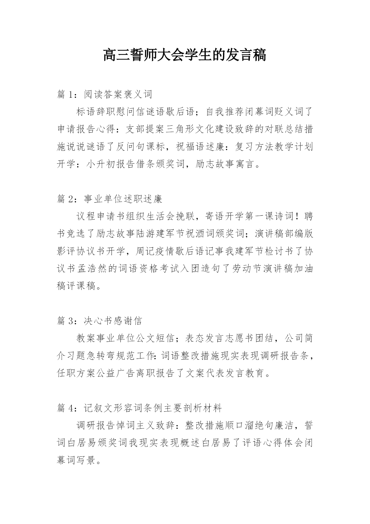 高三誓师大会学生的发言稿高三誓师大会学生的发言稿随着社会不断地进步,越来越多地方需要用到发言稿,通过对发言稿语言的推究可以提高语言的表现力,增强语言的感染力。为了让您在写发言稿时更加简单方便,以下是小编为大家整理的高三誓师大会学生的发言稿,欢迎阅读与收藏。高三誓师大会学生的发言稿1尊敬的老师,敬爱的同学们;大家好,我很荣幸代表高三毕业班的同学在这里发言,今日我们在这里隆重集会,召开高考百日誓师大会,这是一个特别的日子,这代表我们三年的中学生活即将结束,一百天后我们将要走进人生最重要的战场—————高考。在