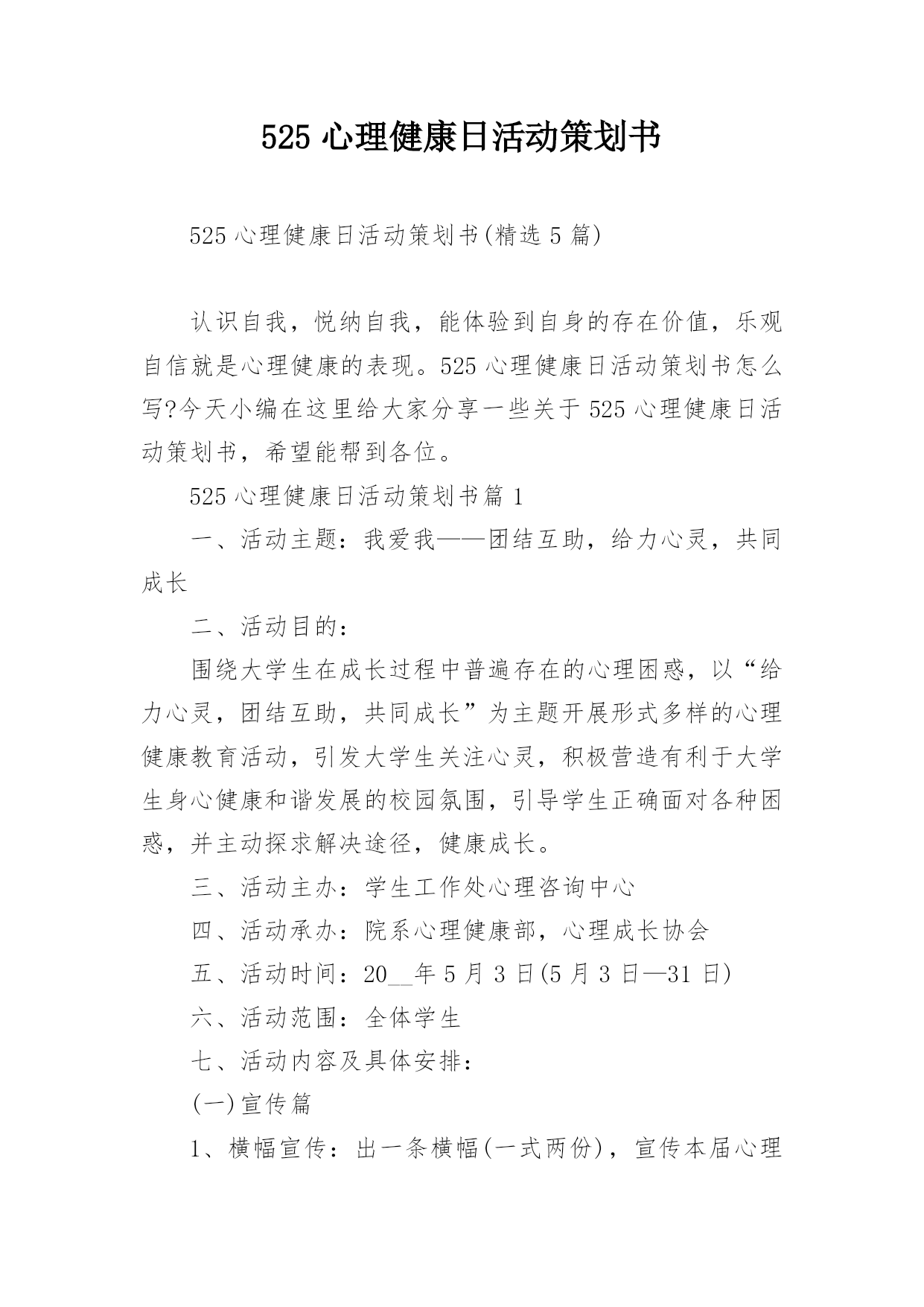 525心理健康日活动策划书525心理健康日活动策划书(精选5篇)认识自我,悦纳自我,能体验到自身的存在价值,乐观自信就是心理健康的表现。525心理健康日活动策划书怎么写?今天小编在这里给大家分享一些关于525心理健康日活动策划书,希望能帮到各位。525心理健康日活动策划书篇1一、活动主题:我爱我——团结互助,给力心灵,共同成长二、活动目的:围绕大学生在成长过程中普遍存在的心理困惑,以“给力心灵,团结互助,共同成长”为主题开展形式多样的心理健康教育活动,引发大学生关注心灵,积极营造有利于大学生身心健康和谐发