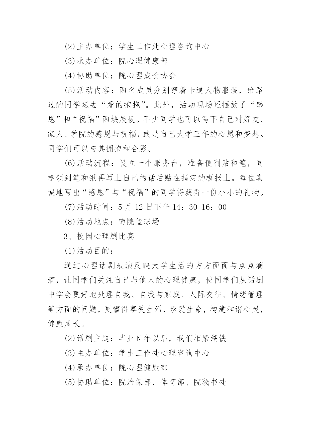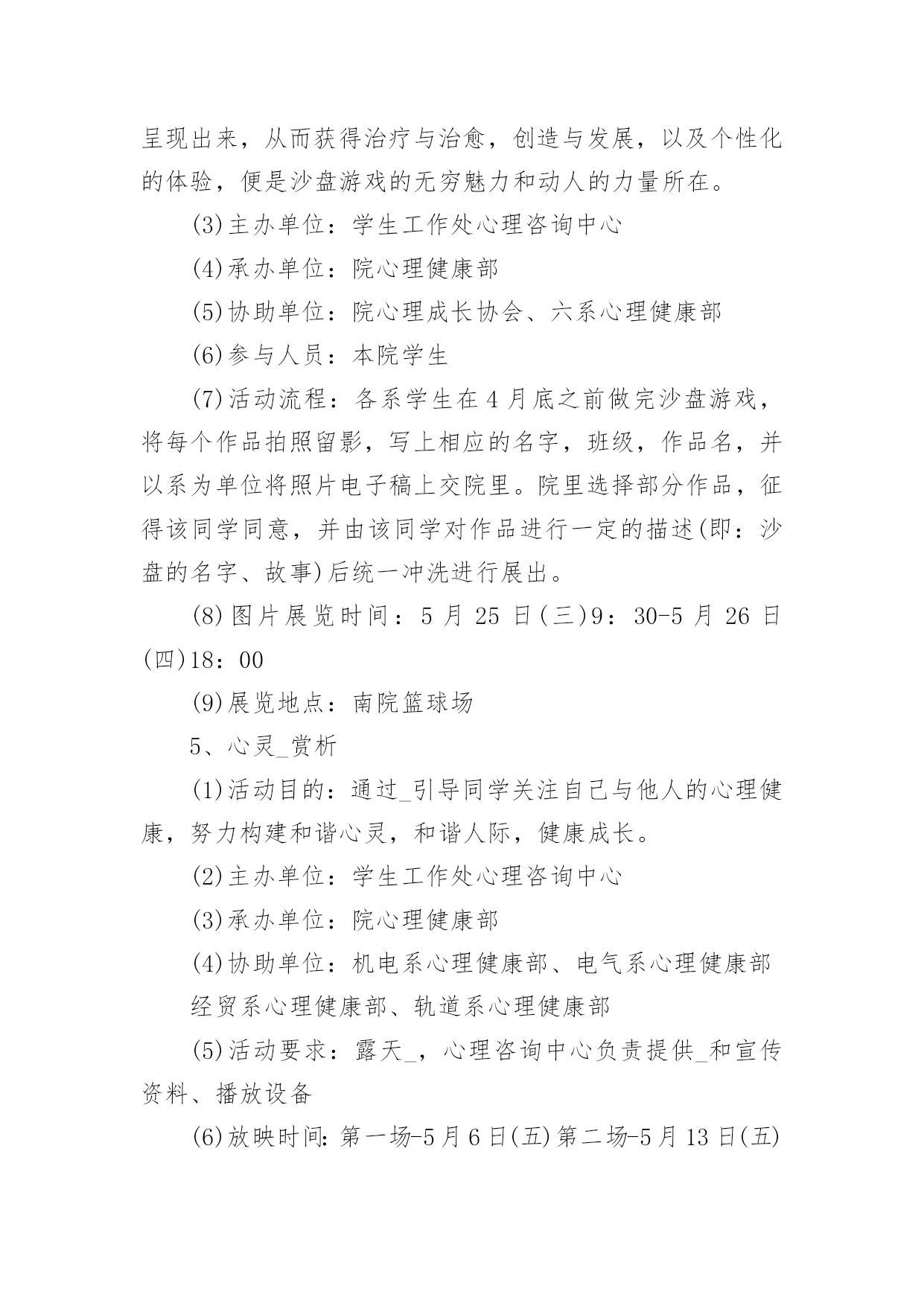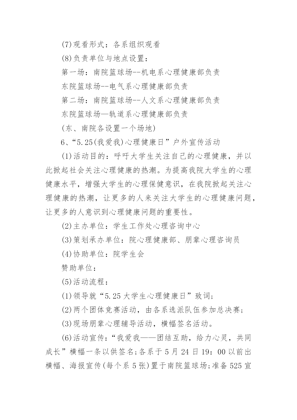 525心理健康日活动策划书525心理健康日活动策划书9篇时光匆匆,我们在忙碌中奔走,一段时间的工作已告一段落,我们的工作再谱新的篇章,同样也要定好新的目标,让我们一起来学习写策划书吧。那么策划书有什么格式呢?以下是小编精心整理的525心理健康日活动策划书,欢迎大家借鉴与参考,希望对大家有所帮助。525心理健康日活动策划书1活动主题:关爱你我他,从心做起活动目的:在社会飞速进步的同时,人们的压力与日俱增,在今天的大学校园心理问题一直困扰着一部分学生,他们需要我们给予关怀和帮助,而5.25谐音"我爱我"心理健