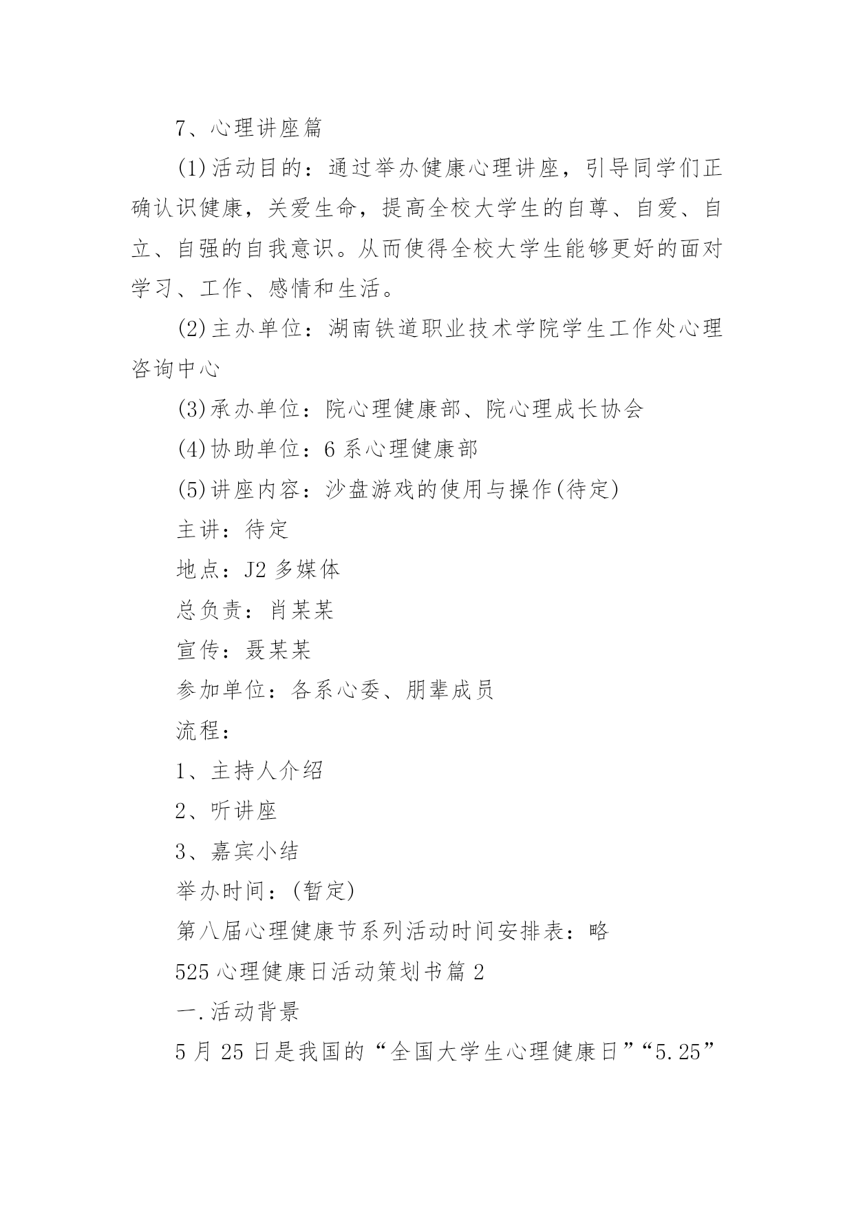 525心理健康日活动策划书525心理健康日活动策划书(精选12篇)时间过得太快,让人不知所措,工作已经告一段落了,我们的工作将会有更高的难度,更高的工作目标,是不是要好好写一份策划书了。那么我们该怎么去写策划书呢?以下是小编收集整理的525心理健康日活动策划书,供大家参考借鉴,希望可以帮助到有需要的朋友。525心理健康日活动策划书篇1主办单位:心理健康教育中心承办单位:校学生会心理部协办单位:校学生会文娱部活动时间:活动地点:广东机电职业技术学院北校区一、活动名称20xx年“5.25”心理健康活动月二、活