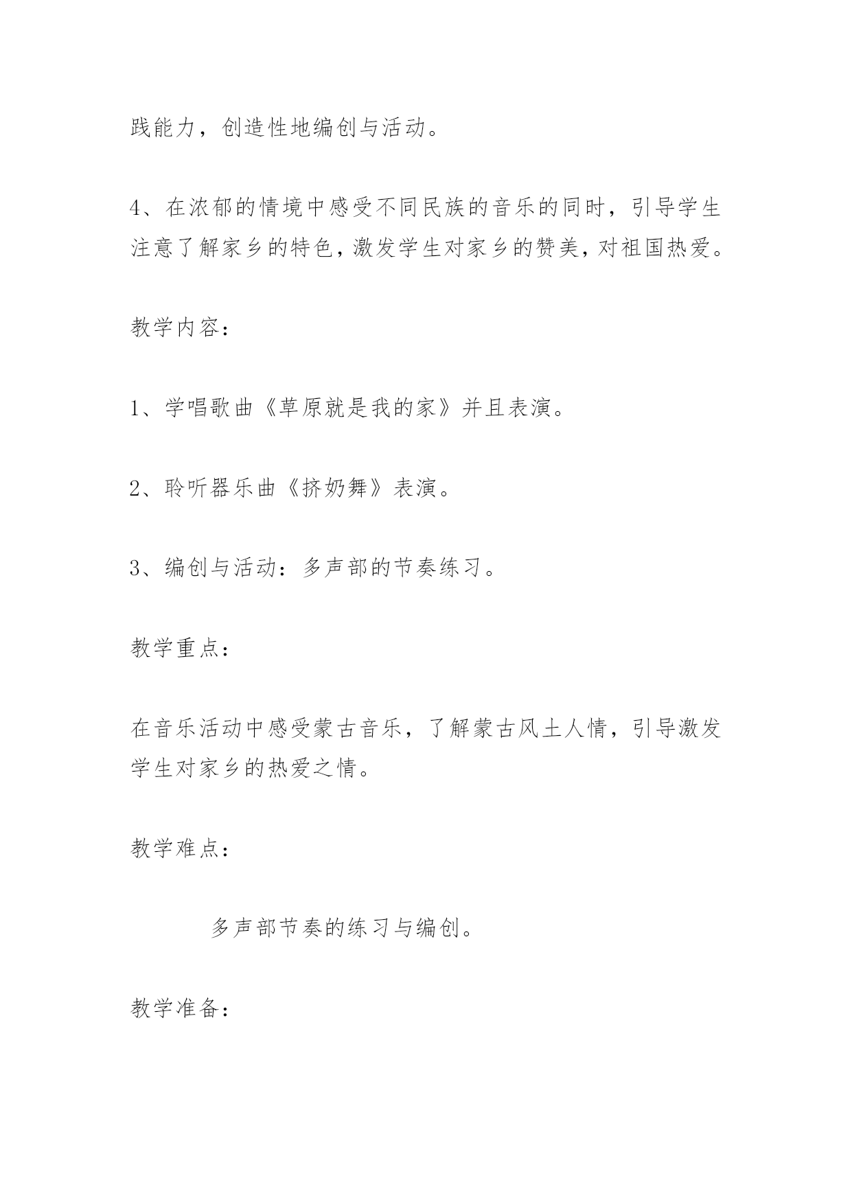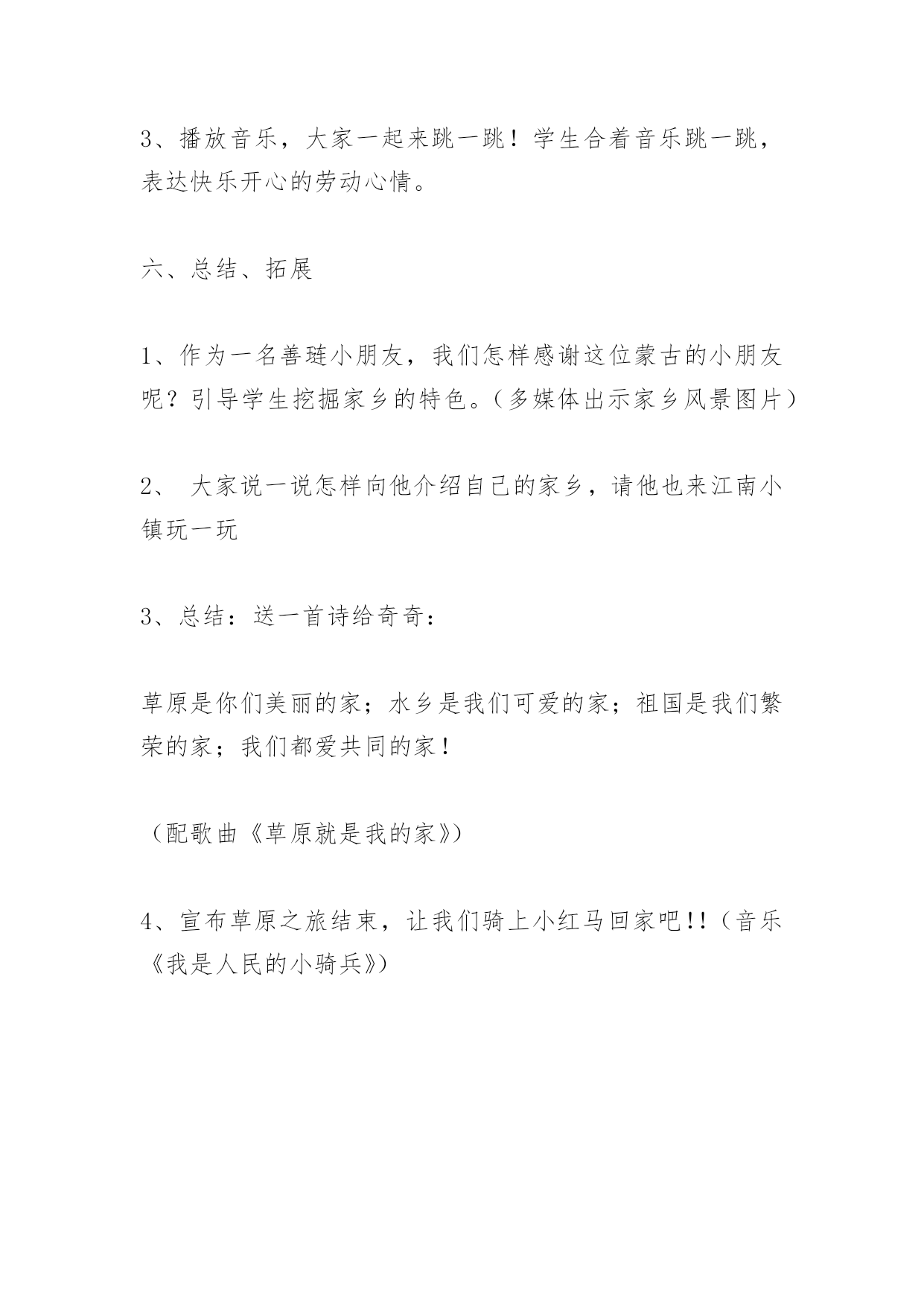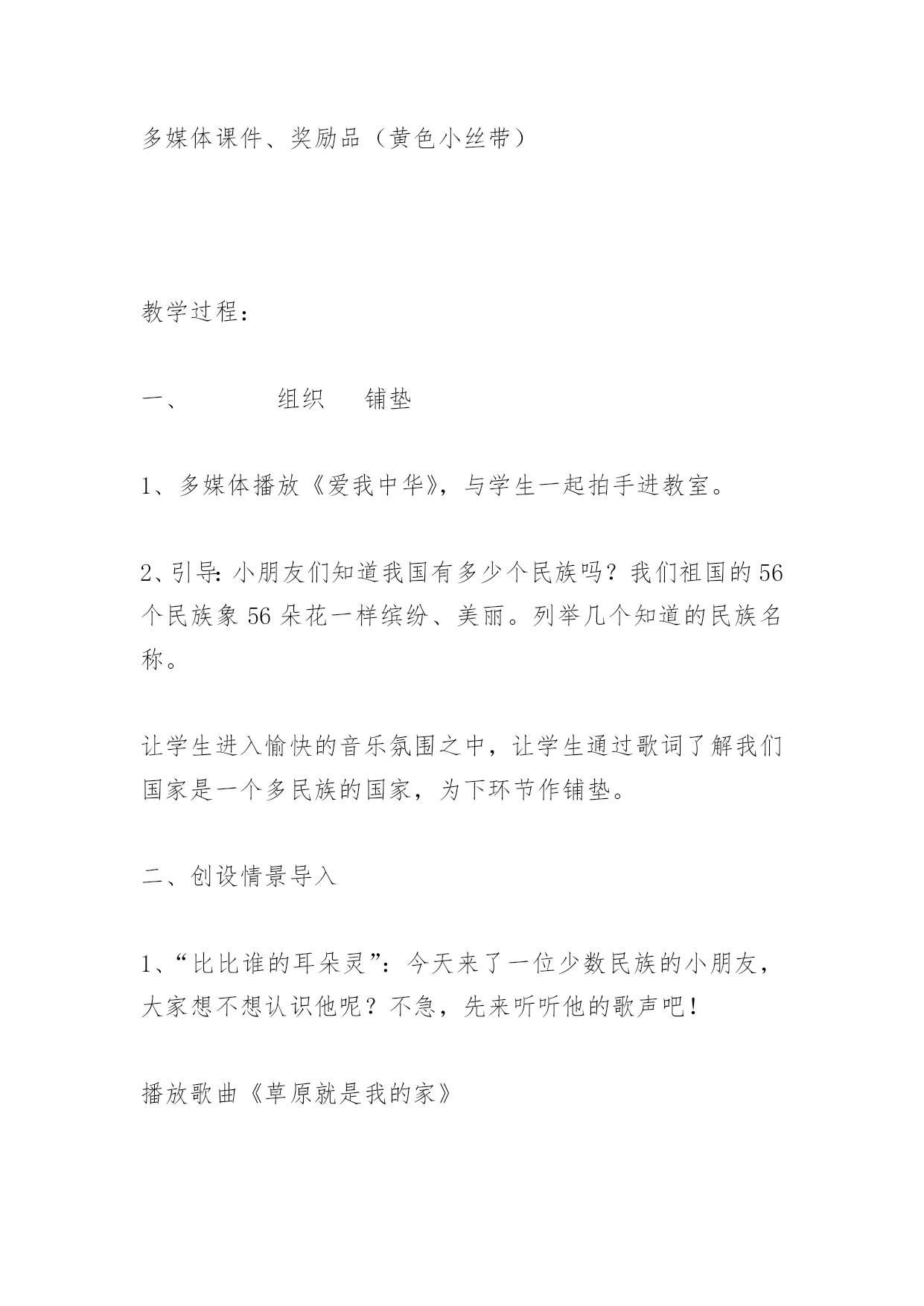 美丽的草原我的家美丽的草原我的家美丽的草原我的家——人音版第二册第五课《跳起舞》教学目标:1、学唱歌曲《草原就是我的家》,表现出对草原的赞美之情。2、通过聆听和表演等音乐活动去了解蒙古的风土人情,感受蒙古音乐的风格特征,进而产生对草原及蒙古人民的喜爱之情。3、通过合作式的学习发展学生的群体意识、合作精神和实践能力,创造性地编创与活动。4、在浓郁的情境中感受不同民族的音乐的同时,引导学生注意了解家乡的特色,激发学生对家乡的赞美,对祖国热爱。教学内容:1、学唱歌曲《草原就是我的家》并且表演。2、聆听器乐曲《挤