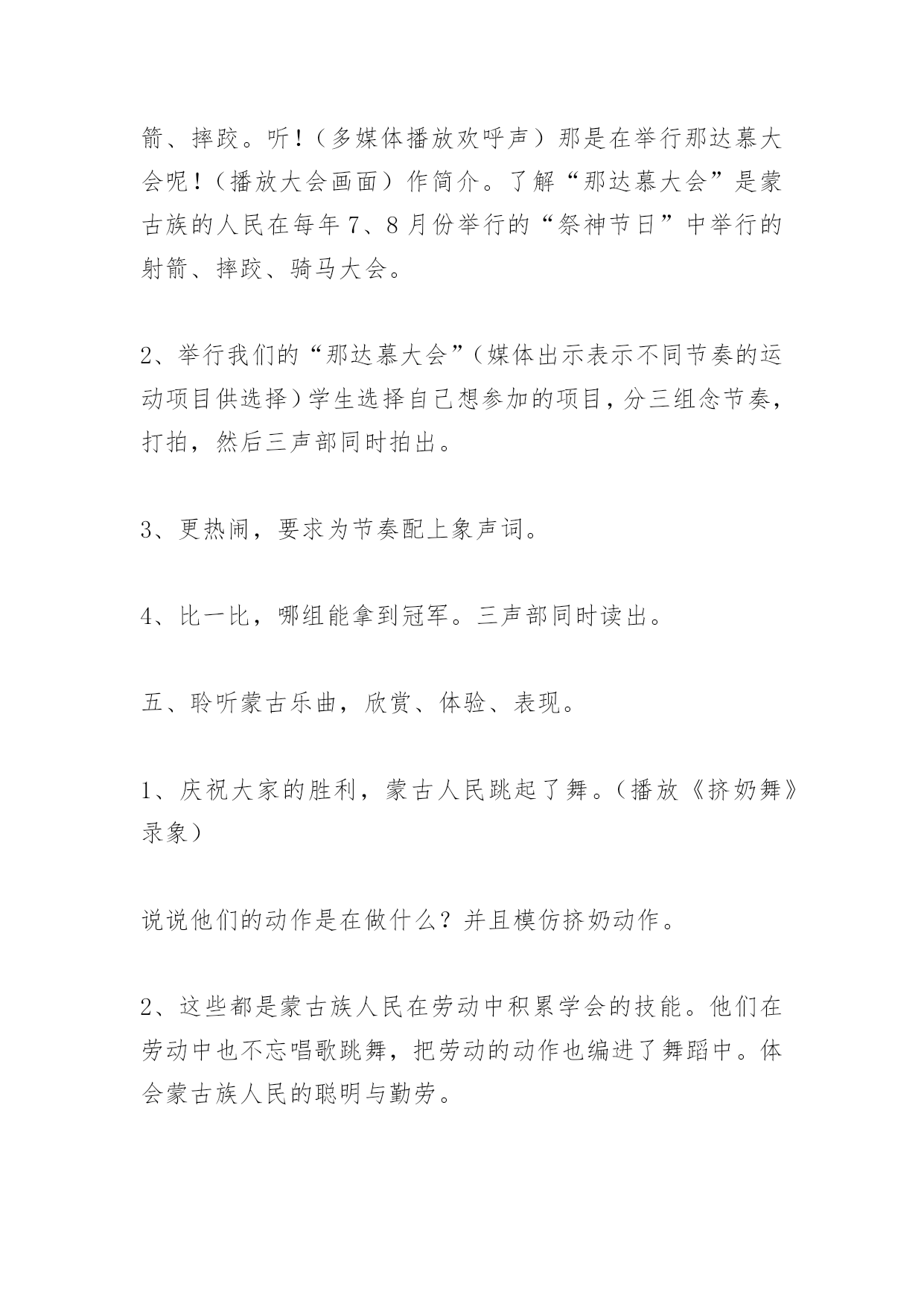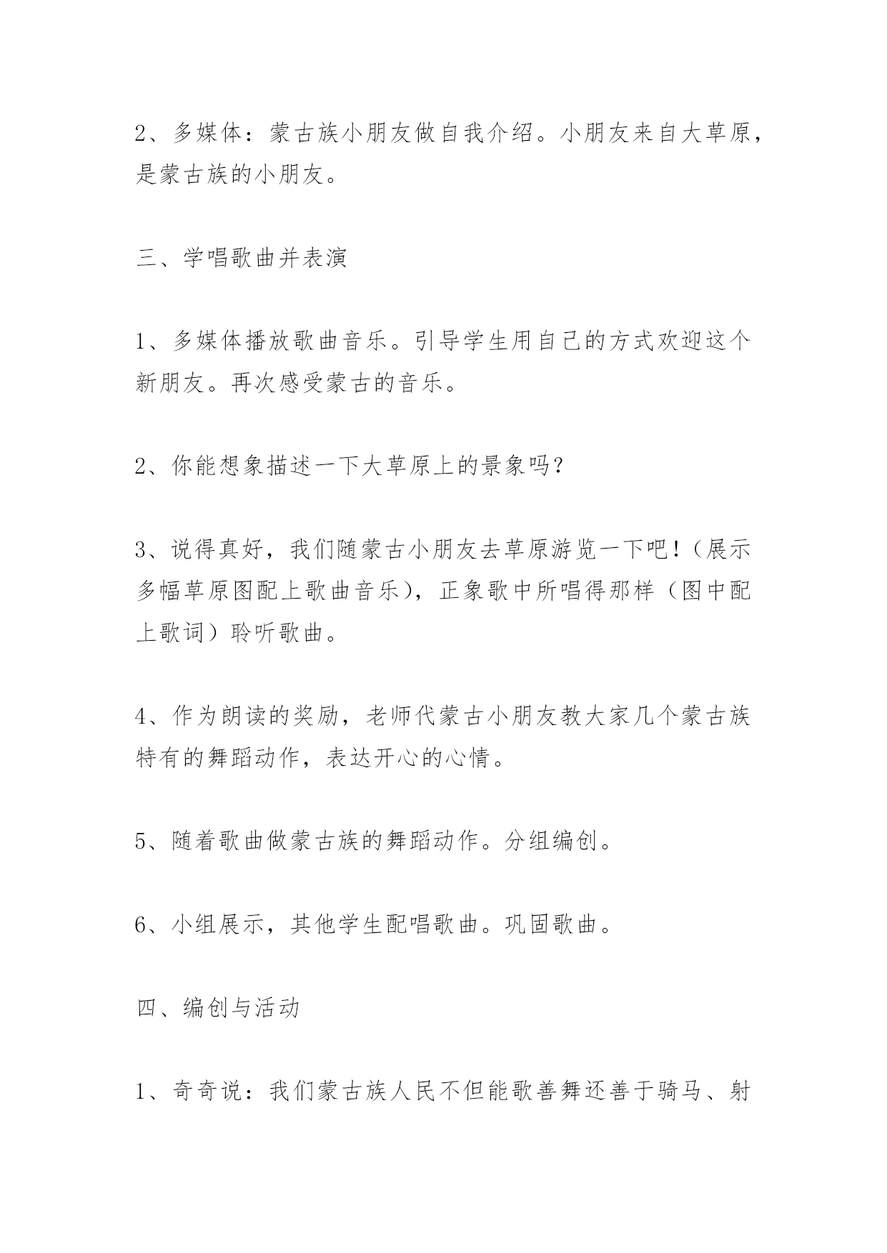 美丽的草原我的家美丽的草原我的家美丽的草原我的家 ——人音版第二册第五课《跳起舞》教学目标:1、学唱歌曲《草原就是我的家》,表现出对草原的赞美之情。2、通过聆听和表演等音乐活动去了解蒙古的风土人情,感受蒙古音乐的风格特征,进而产生对草原及蒙古人民的喜爱之情。3、通过合作式的学习发展学生的群体意识、合作精神和实践能力,创造性地编创与活动。4、在浓郁的情境中感受不同民族的音乐的同时,引导学生注意了解家乡的特色,激发学生对家乡的赞美,对祖国热爱。教学内容:1、学唱歌