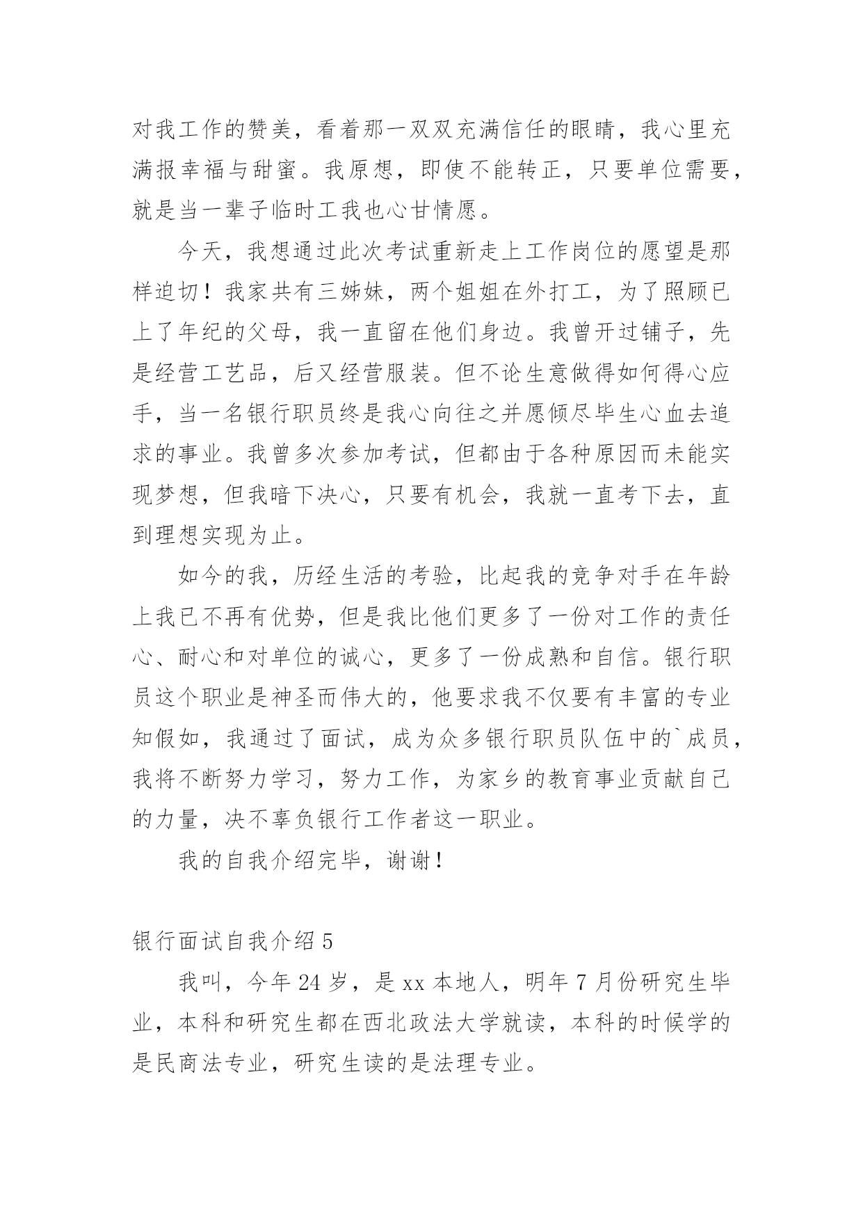 银行面试自我介绍银行面试自我介绍[精]当我们在一个陌生场合中,我们时常会需要作自我介绍,自我介绍是让陌生人彼此认识的好方法。你所见过的自我介绍是什么样的呢?下面是小编精心整理的银行面试自我介绍,希望能够帮助到大家。银行面试自我介绍篇1我叫xx,来自xxx,20xx年x毕业于xx银行学校金融专业。毕业后在xx银行xx支行工作x年,后又在xx市xx银行工作过一年的时间。人往高处走,水往低处流。前两份工作因没有太大的发展潜力,故我辞去工作,以谋求更好,更有发展前途的工作。之前x年的工作使我有了丰富的银行临柜能力