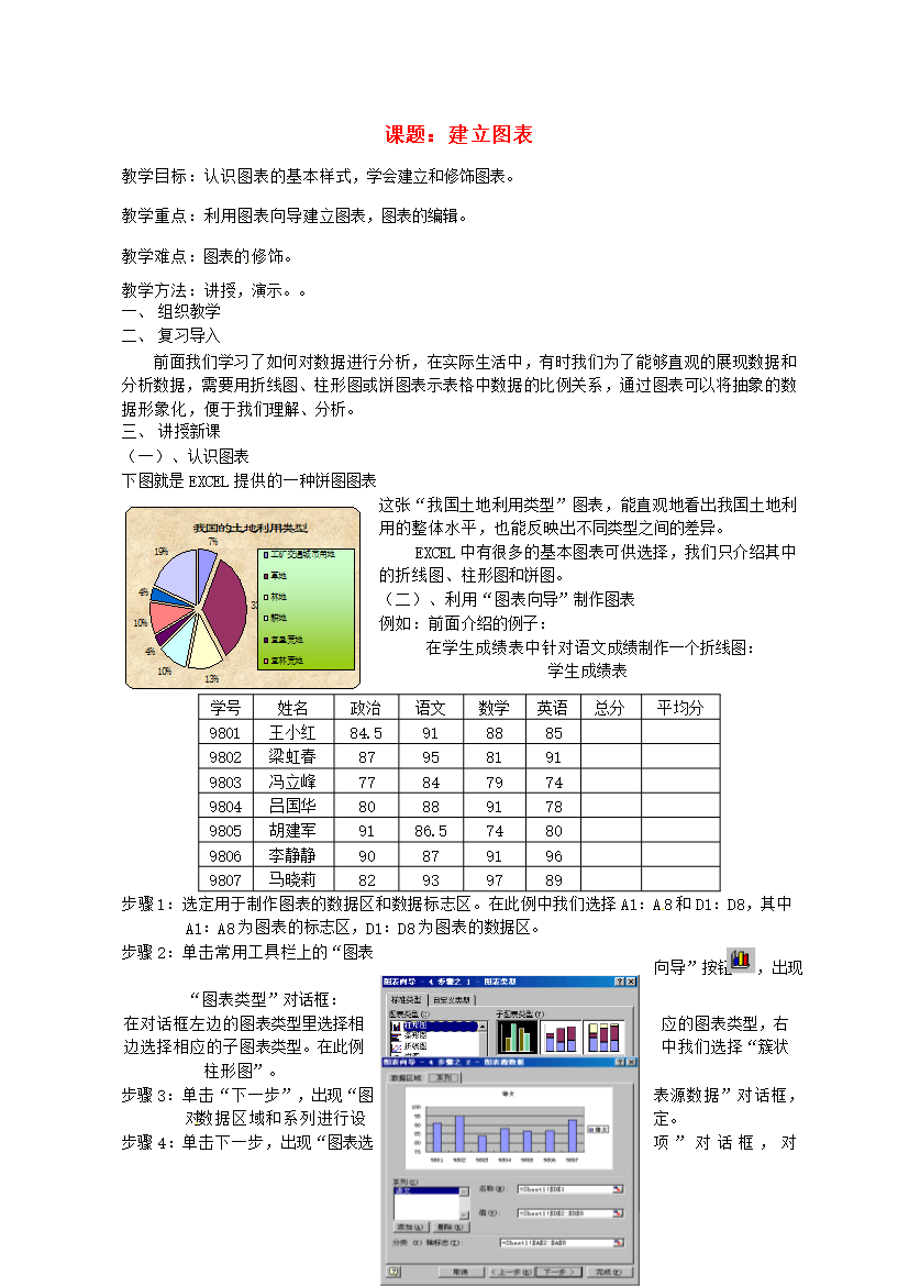 课题:建立图表教学目标:认识图表的基本样式,学会建立和修饰图表。教学重点:利用图表向导建立图表,图表的编辑。教学难点:图表的修饰。教学方法:讲授,演示。。组织教学复习导入前面我们学习了如何对数据进行分析,在实际生活中,有时我们为了能够直观的展现数据和分析数据,需要用折线图、柱形图或饼图表示表格中数据的比例关系,通过图表可以将抽象的数据形象化,便于我们理解、分析。讲授新课(一)、认识图表下图就是EXCEL提供的一种饼图图表这张“我国土地利用类型”图表,能直观地看出我国土地利用的整体水平,也能反映出不同类型之
