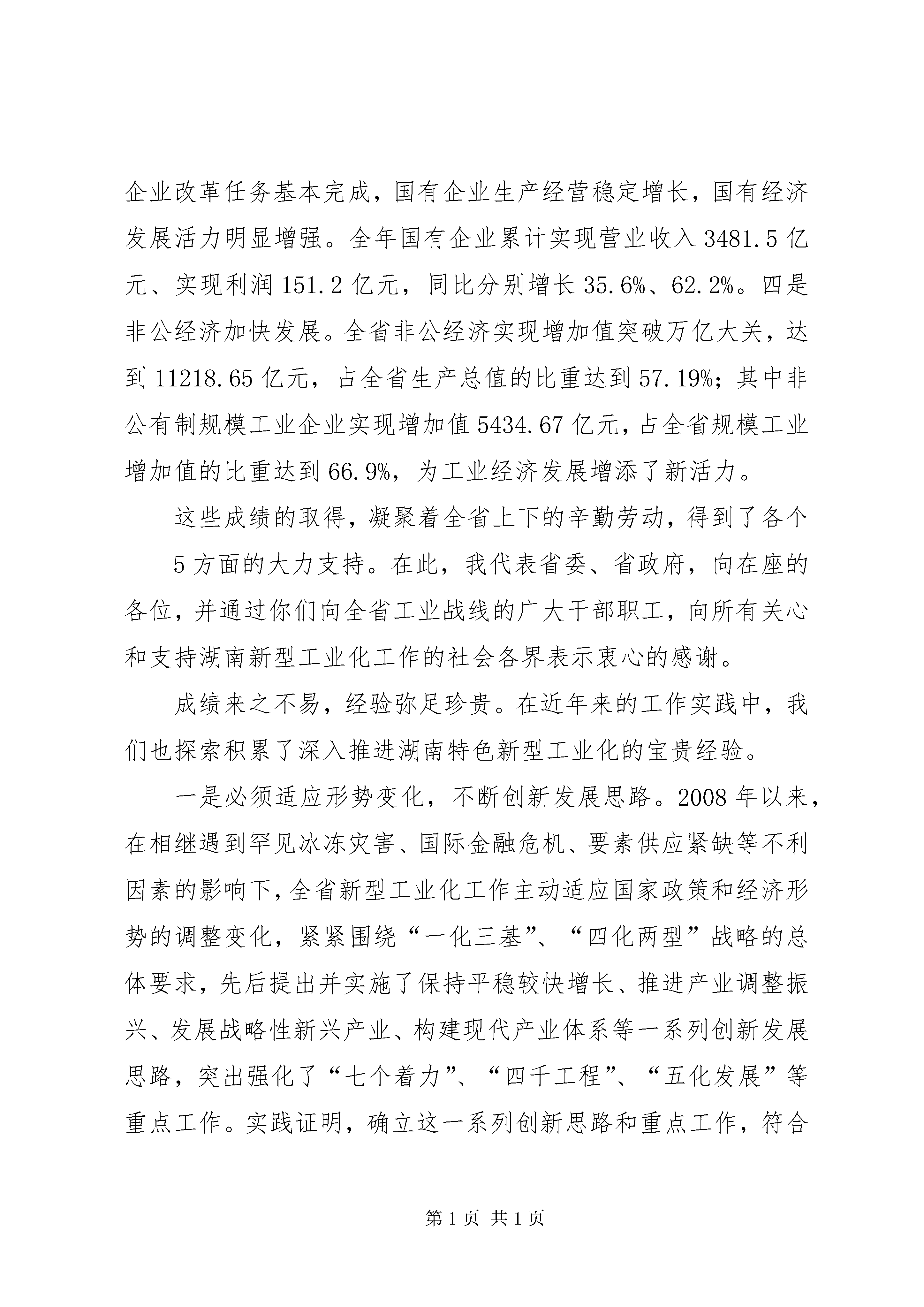 县委书记严兴德在全县加速推进新型工业化工作会议上的讲话陈肇雄在全省加速推进新型工业化工作会议上的讲话2011-03-0213:33湖南经济网编辑:张先华转变发展方式服务“四化两型”努力实现全省工业经济新的科学跨越发展XX省委常委、副省长陈肇雄(2011年2月25日)同志们:这次会议的主要任务是,深入贯彻落实中央经济工作会议、全国工业和信息化工作会议以及省委经济工作会议、省“两会”精神,回顾总结2010年及“十一五”期间全省推进新型工业化工作,研究部署“十二五”时期的发展思路,对2