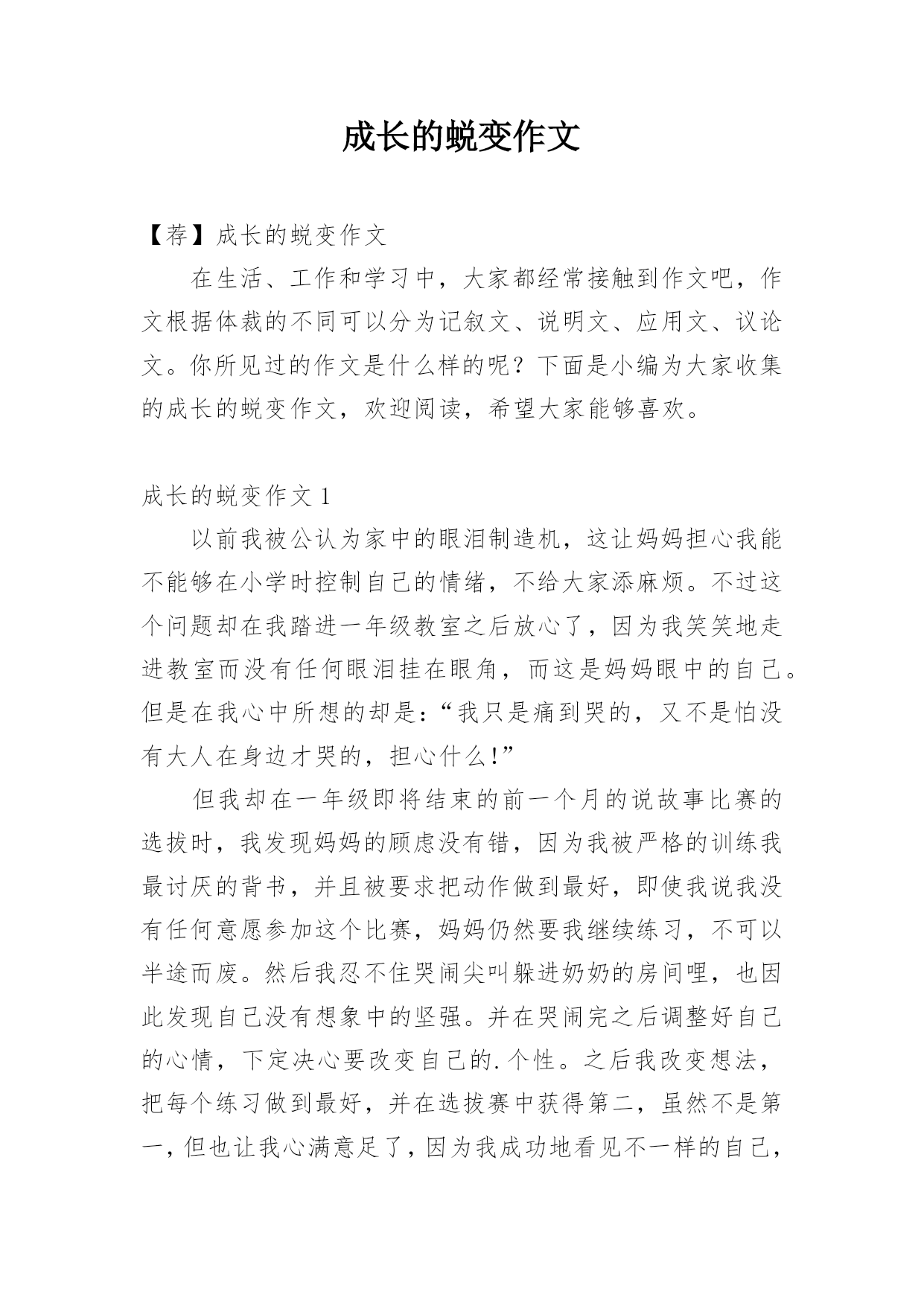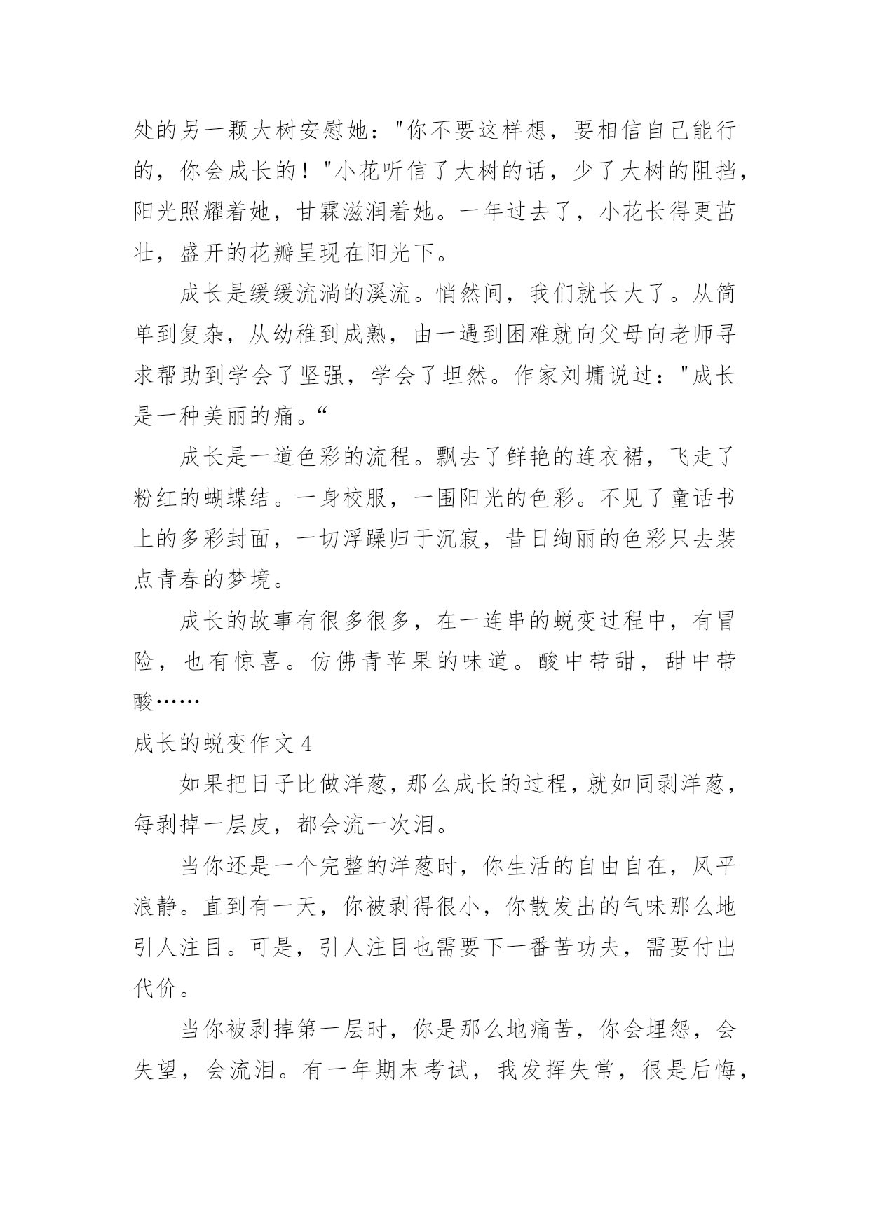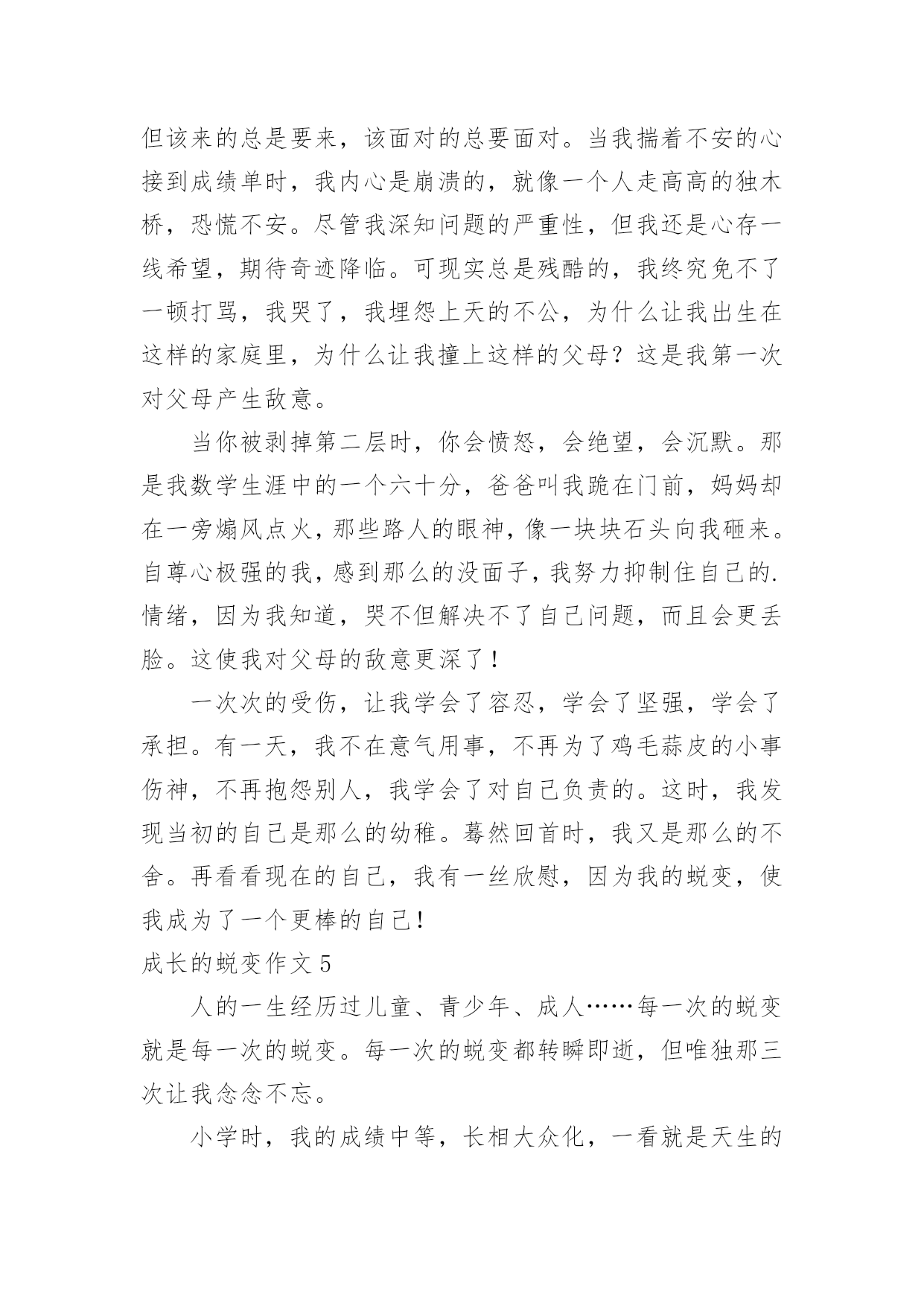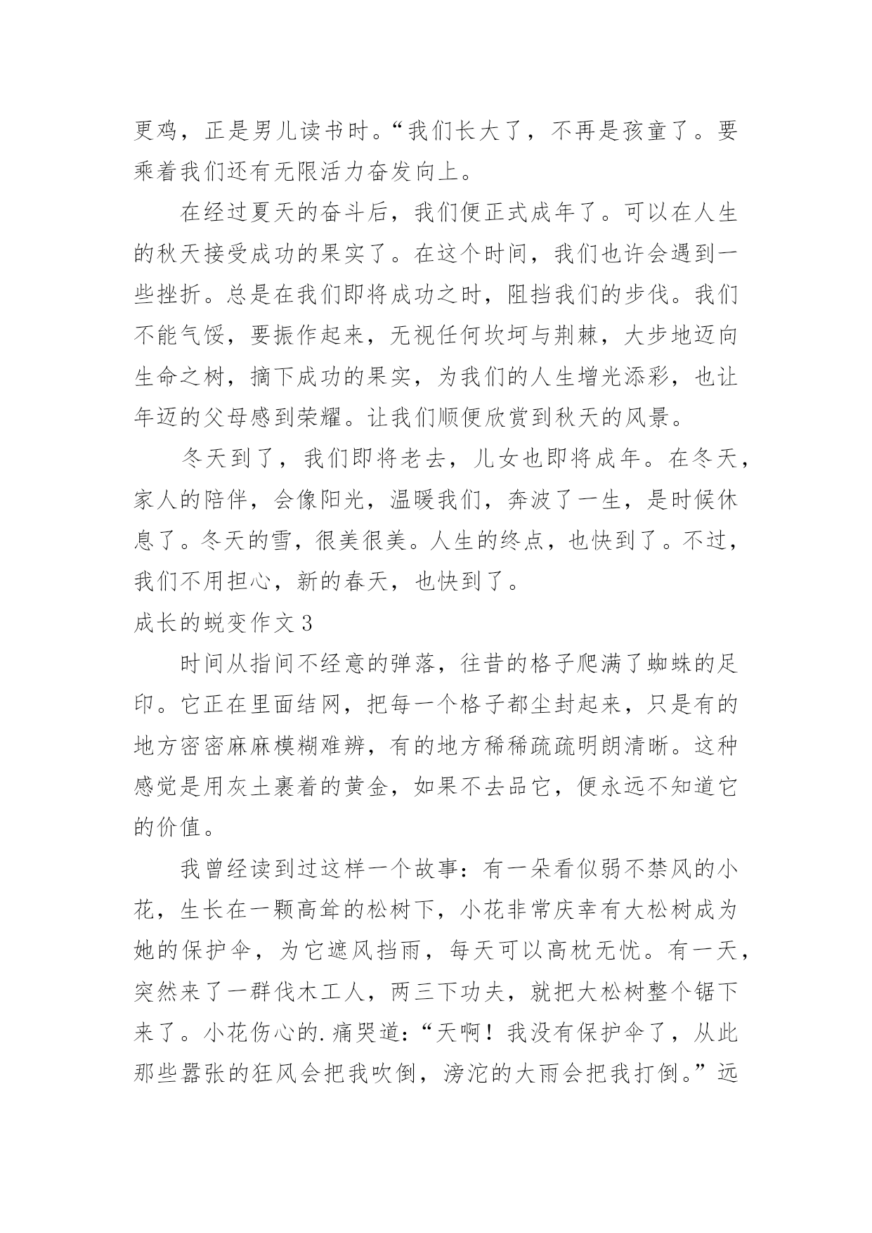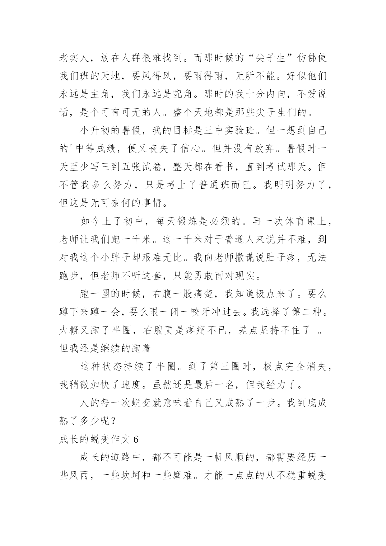 成长的蜕变作文成长的蜕变作文在现实生活或工作学习中,大家都写过作文,肯定对各类作文都很熟悉吧,作文是由文字组成,经过人的思想考虑,通过语言组织来表达一个主题意义的文体。你知道作文怎样写才规范吗?以下是小编为大家收集的成长的蜕变作文,仅供参考,大家一起来看看吧。成长的蜕变作文1在成长的路上,我历经了风雨,遇见了彩虹,完成了成长的蜕变。——题记有风吹过的季节,拌落寒夜遗留下的霜华。花儿在暗夜中成长,即使有苦涩和忧伤,但绽放后,那爆满枝头的绝美,叫人遗忘痛苦。所以我蓦然回首,凝望,数一数曾经在成长路上遗落的一季