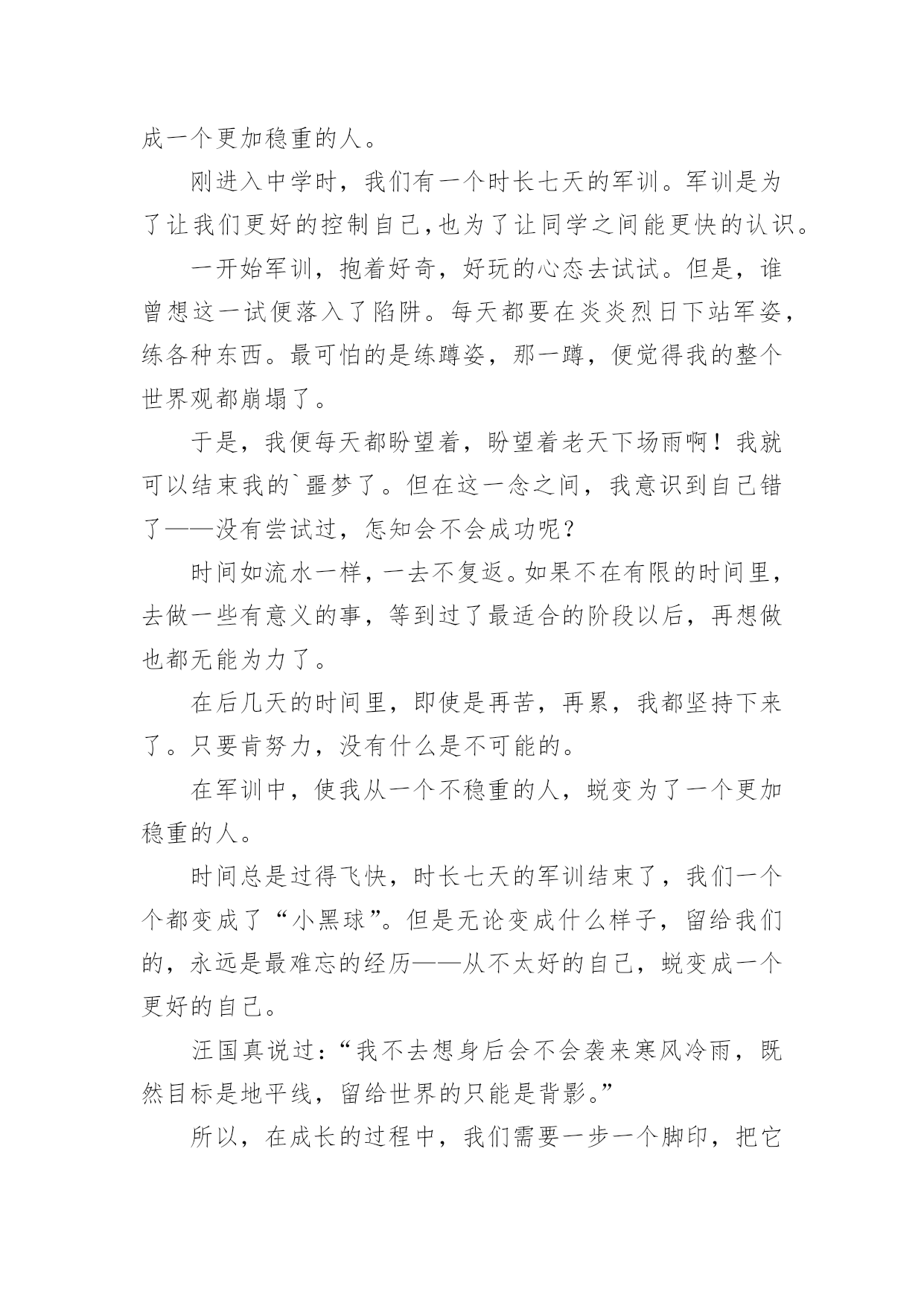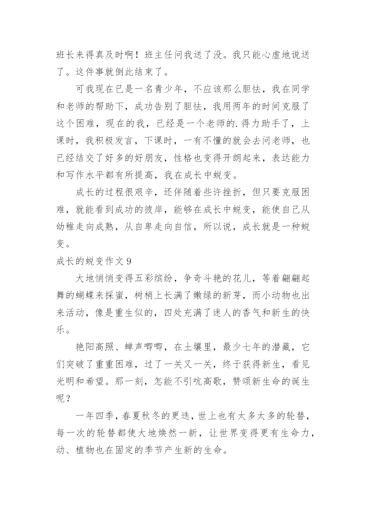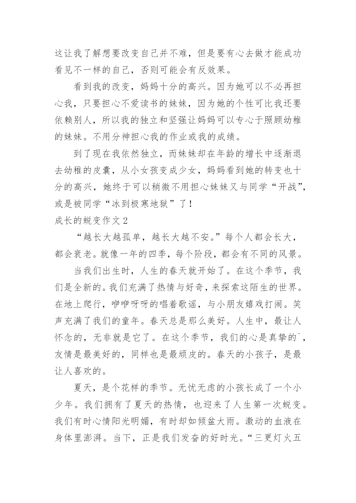成长的蜕变初中作文成长的蜕变初中作文在日常学习、工作抑或是生活中,许多人都有过写作文的经历,对作文都不陌生吧,作文是人们以书面形式表情达意的言语活动。还是对作文一筹莫展吗?以下是小编为大家整理的成长的蜕变初中作文,仅供参考,大家一起来看看吧。成长的蜕变初中作文1成长的蜕变如蝉脱壳一样,蝉脱壳以后,就长大了许多,也懂了许多,成长亦是如此。在我童年的时候,一直和母亲生活,父亲外出打工,童年的我有些腼腆,用我们农村的话说“出不得紧”,只要同陌生人说话就不由自主的脸红,有时还有点小激动,转而大哭。凌晨五六点,我和