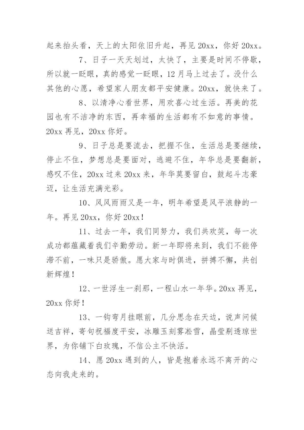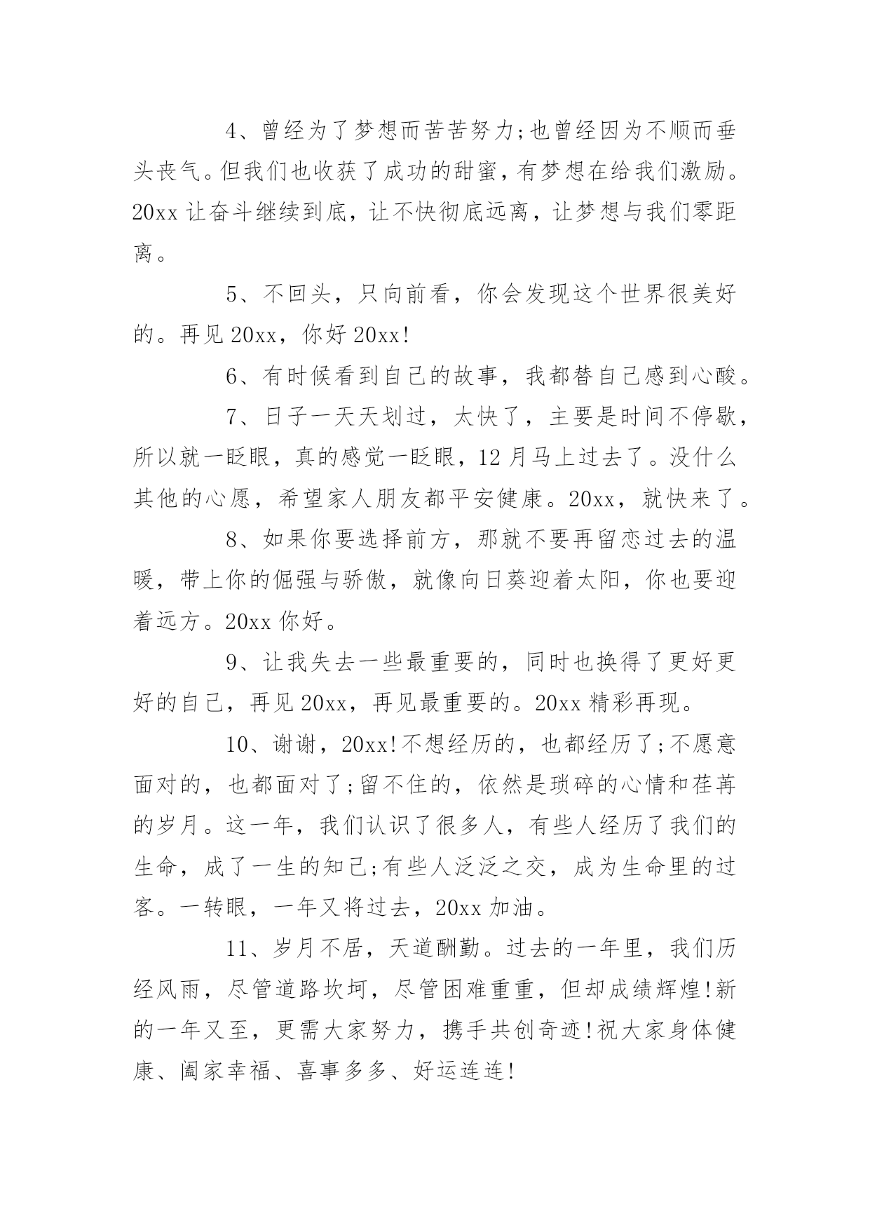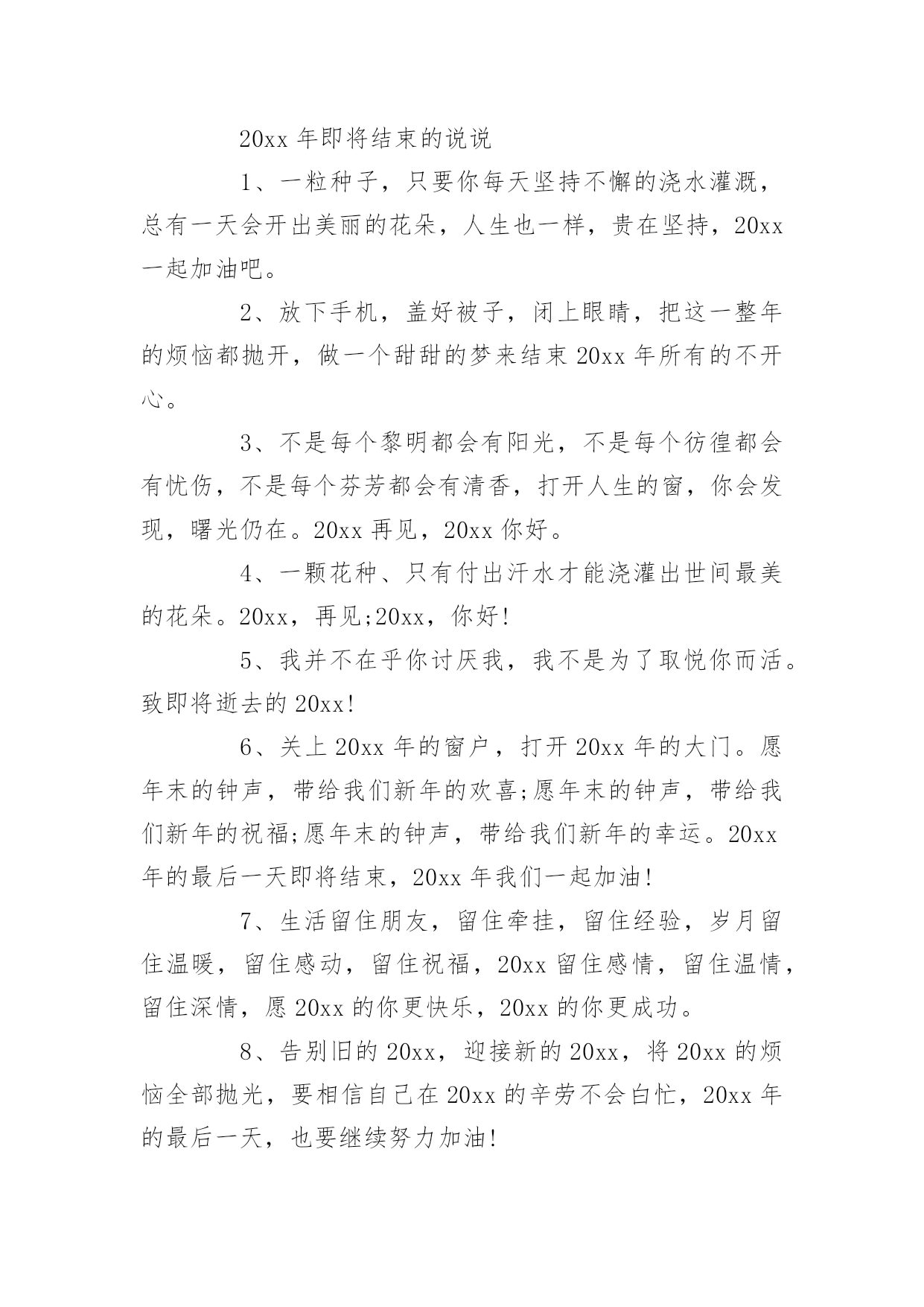 即将结束的句子在日复一日的学习、工作或生活中,大家对句子都再熟悉不过了吧,从句法角度说,句子是使最大的语法单位。你所见过的句子是什么样的呢?下面是小编为大家收集的即将结束的句子,欢迎阅读与收藏。即将结束的句子11、汗水智慧拨动成功的琴弦,齐心合力唱响团结的赞歌,新的一年希望我们众志成城艰苦奋斗,让成就的宫殿为我们再添一座,闪着荣光耀着辉煌,装着我们共同的梦想。加油!2、20xx年,过好自己,别人的故事不需要你。3、心若在,梦就在,梦若在,希望就在,做人,一定要怀有梦想,任何时候,都不能放弃,20xx,依然