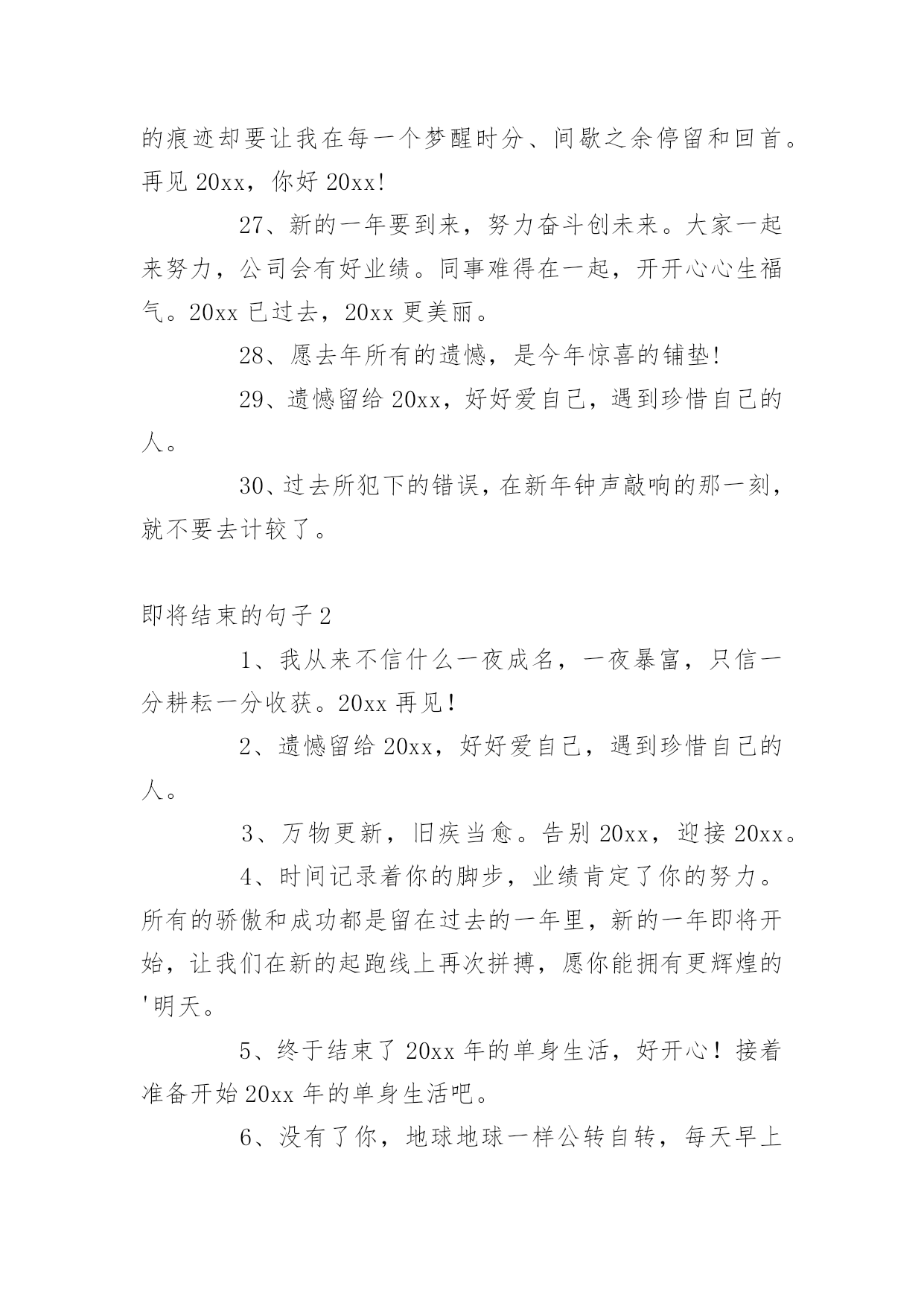 即将结束的句子即将结束的句子在日复一日的学习、工作或生活中,大家对句子都再熟悉不过了吧,从句法角度说,句子是使最大的语法单位。你所见过的句子是什么样的呢?下面是小编为大家收集的即将结束的句子,欢迎阅读与收藏。即将结束的句子11、汗水智慧拨动成功的琴弦,齐心合力唱响团结的赞歌,新的一年希望我们众志成城艰苦奋斗,让成就的宫殿为我们再添一座,闪着荣光耀着辉煌,装着我们共同的梦想。加油!2、20xx年,过好自己,别人的故事不需要你。3、心若在,梦就在,梦若在,希望就在,做人,一定要怀有梦想,任何时候,都不能放弃,