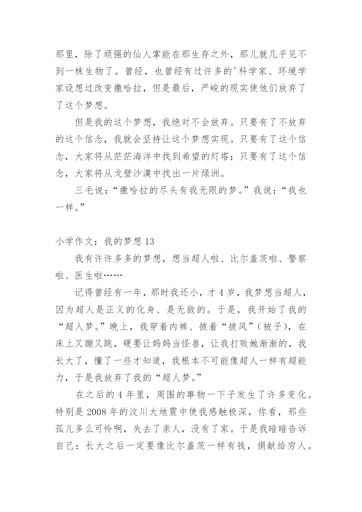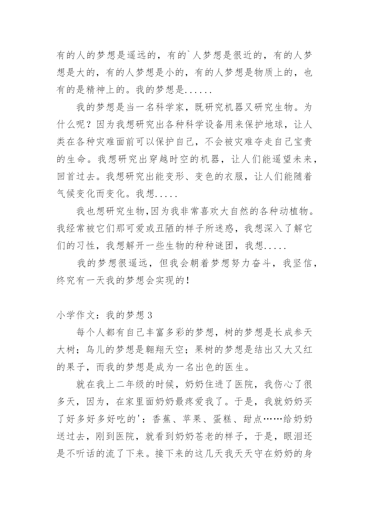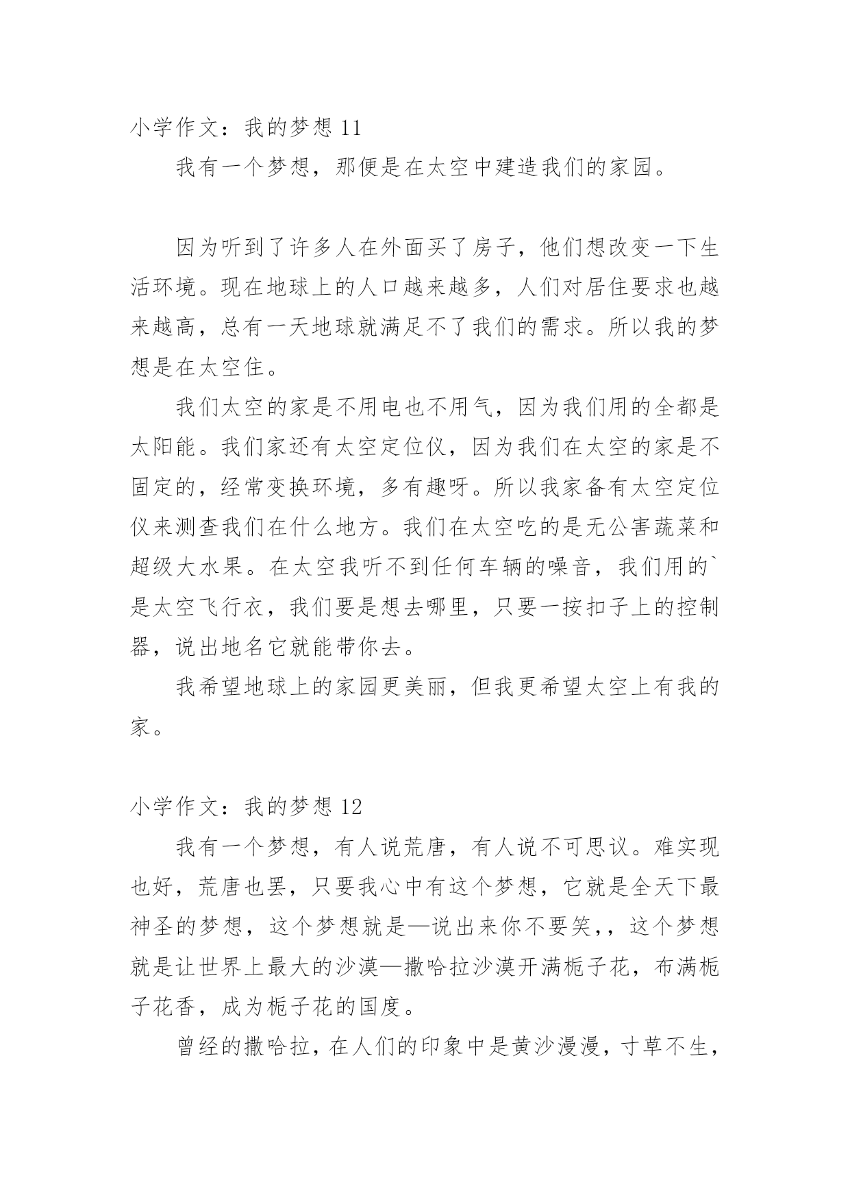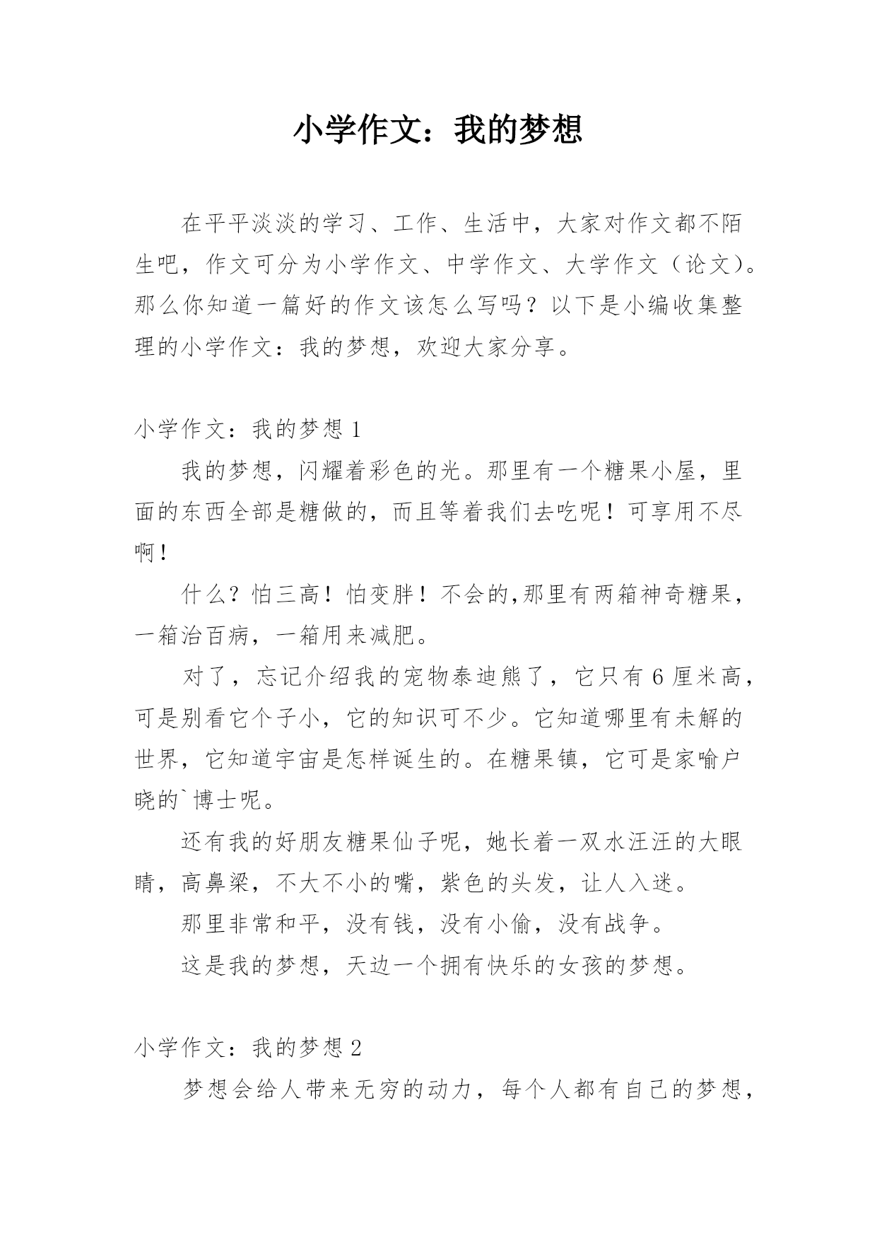 小学作文:我的梦想在平平淡淡的学习、工作、生活中,大家对作文都不陌生吧,作文可分为小学作文、中学作文、大学作文(论文)。那么你知道一篇好的作文该怎么写吗?以下是小编收集整理的小学作文:我的梦想,欢迎大家分享。小学作文:我的梦想1我的梦想,闪耀着彩色的光。那里有一个糖果小屋,里面的东西全部是糖做的,而且等着我们去吃呢!可享用不尽啊!什么?怕三高!怕变胖!不会的,那里有两箱神奇糖果,一箱治百病,一箱用来减肥。对了,忘记介绍我的宠物泰迪熊了,它只有6厘米高,可是别看它个子小,它的知识可不少。它知道哪里有未解的世