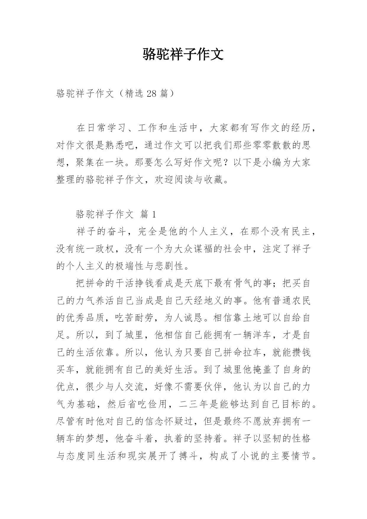 骆驼祥子作文骆驼祥子作文(精选28篇)在日常学习、工作和生活中,大家都有写作文的经历,对作文很是熟悉吧,通过作文可以把我们那些零零散散的思想,聚集在一块。那要怎么写好作文呢?以下是小编为大家整理的骆驼祥子作文,欢迎阅读与收藏。骆驼祥子作文篇1祥子的奋斗,完全是他的个人主义,在那个没有民主,没有统一政权,没有一个为大众谋福的社会中,注定了祥子的个人主义的极端性与悲剧性。把拼命的干活挣钱看成是天底下最有骨气的事;把买自己的力气养活自己当成是自己天经地义的事。他有普通农民的优秀品质,吃苦耐劳,为人诚恳。相信靠土